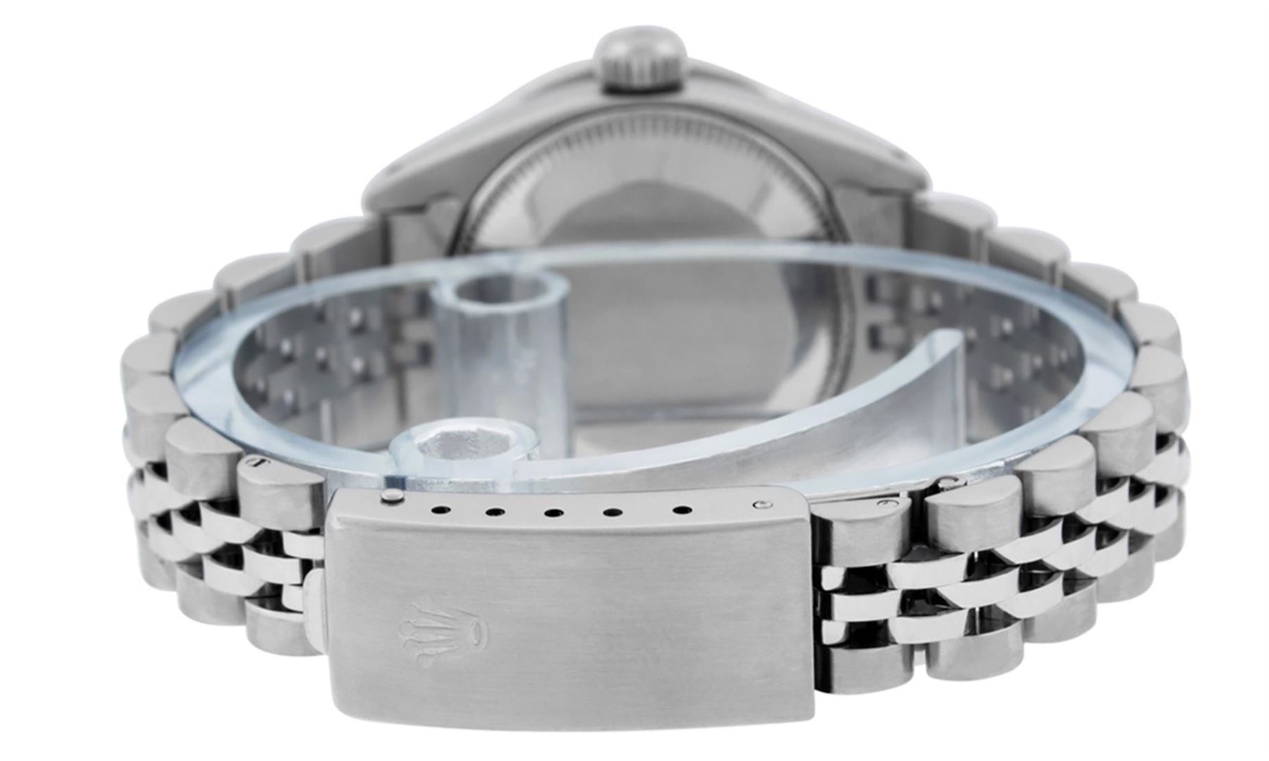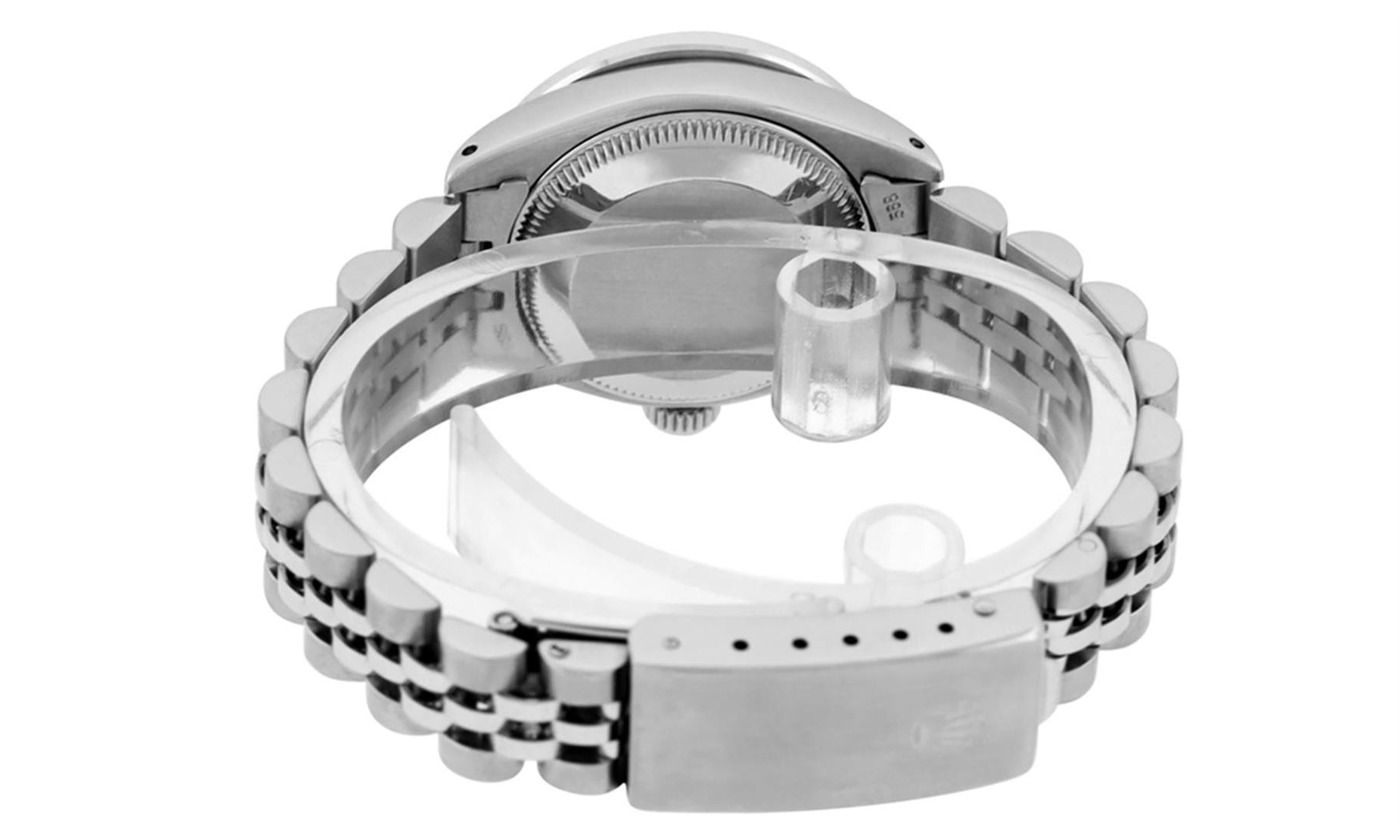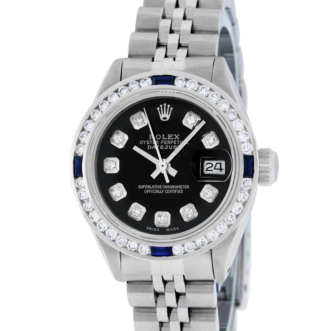 One Ladies Rolex Stainless Pre Owned Steel Wristwatch Polished Bright with Satin Finish, Serviced & Electronically Tested, Stainless Steel Case: 26mm, Stainless Steel Crown, Custom Bezel: New 18K White Gold Sapphire Channel Set Diamond Bezel, Diamond + Gem Count: 36 Diamonds + 4 Sapphires. Custom Crystal: New Sapphire With Date Window. Custom Hands: New Luminescent Hands. Rolex Movement: Automatic Winding Movement 2035. Custom Dial: Custom Black With Added Diamond Hour Markers. Date Window: 3 O'Clock Position Date Display. Condition: G-6 Extra Fine. Rolex Bracelet: Stainless Steel Jubilee Band. Bright Polish & Satin Finish. 6.0 Inch Length, Adjustable. Standard Clasp, With Rolex Logo. This Watch Has Been Serviced Time Tested And Is In Excellent Condition It Is Free Of All Scratches And Dents.