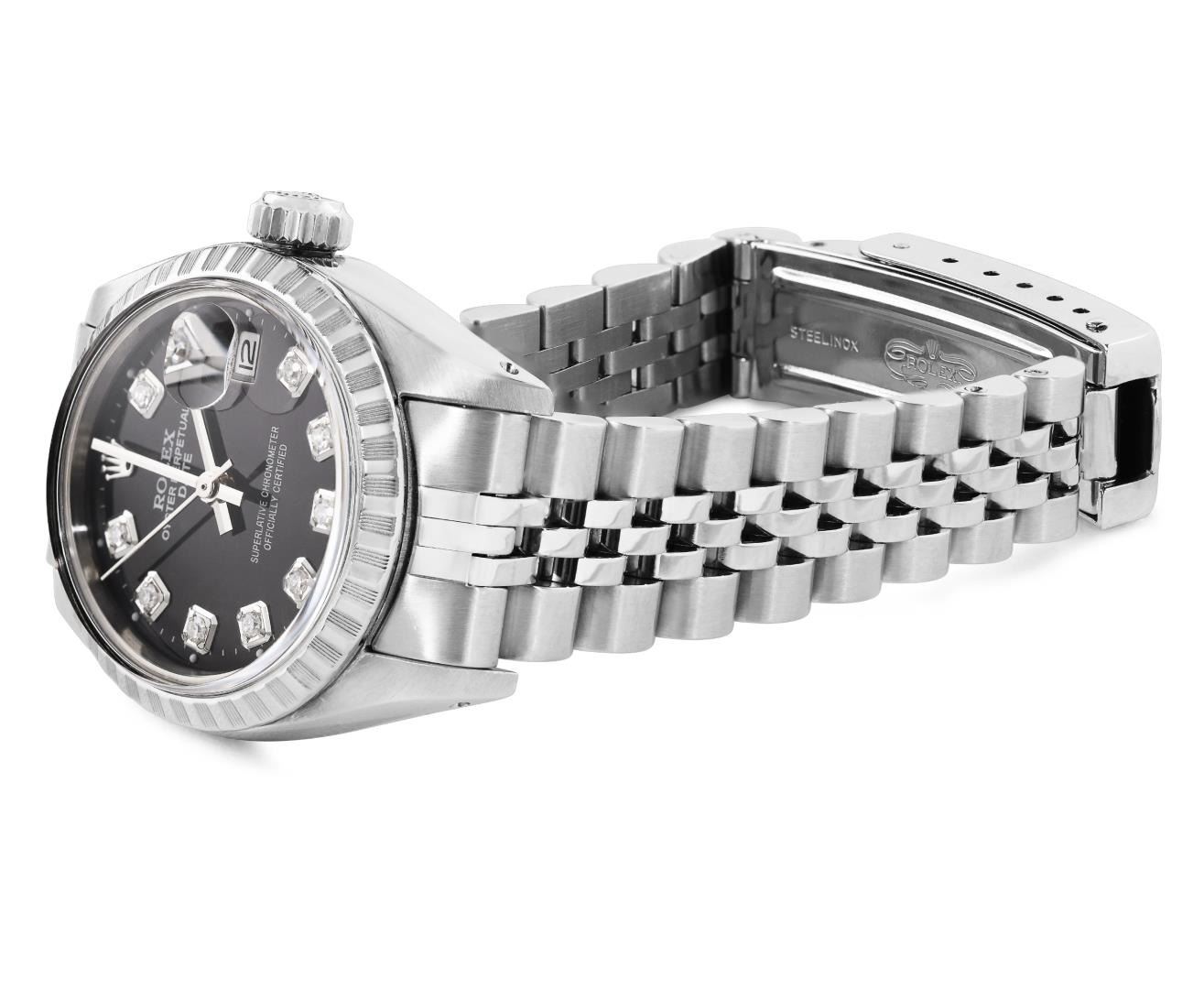 One Rolex Ladies Pre Owned Stainless Steel Date Wristwatch Polished Bright with Satin Finish, Serviced and Electronically Tested, Stainless Steel Case: 26mm, Stainless Steel Crown, Rolex Bezel: Stainless Steel Engine Turn Bezel, Custom Crystal: New Acrylic With Magnifying Date Window. Custom Hands: New Solid Hands. Rolex Movement: Automatic Winding Movement 2035. Custom Dial: Custom Black Dial With Added Diamond Hour Markers, Dash Tracks, And Lumi Dots, Diamond Count: 10 Diamonds On Dial. Date Window: 3 O'Clock Position Date Display, Model: Date. Condition: G-6 Extra Fine. Rolex Bracelet: Stainless Steel Jubilee Band. Bright Polish and Satin Finish. 6.0 Inch Length, Adjustable. Standard Clasp, With Rolex Logo. This Watch Has Been Serviced Time Tested And Is In Excellent Condition. It Is Free Of All Scratches And Dents.