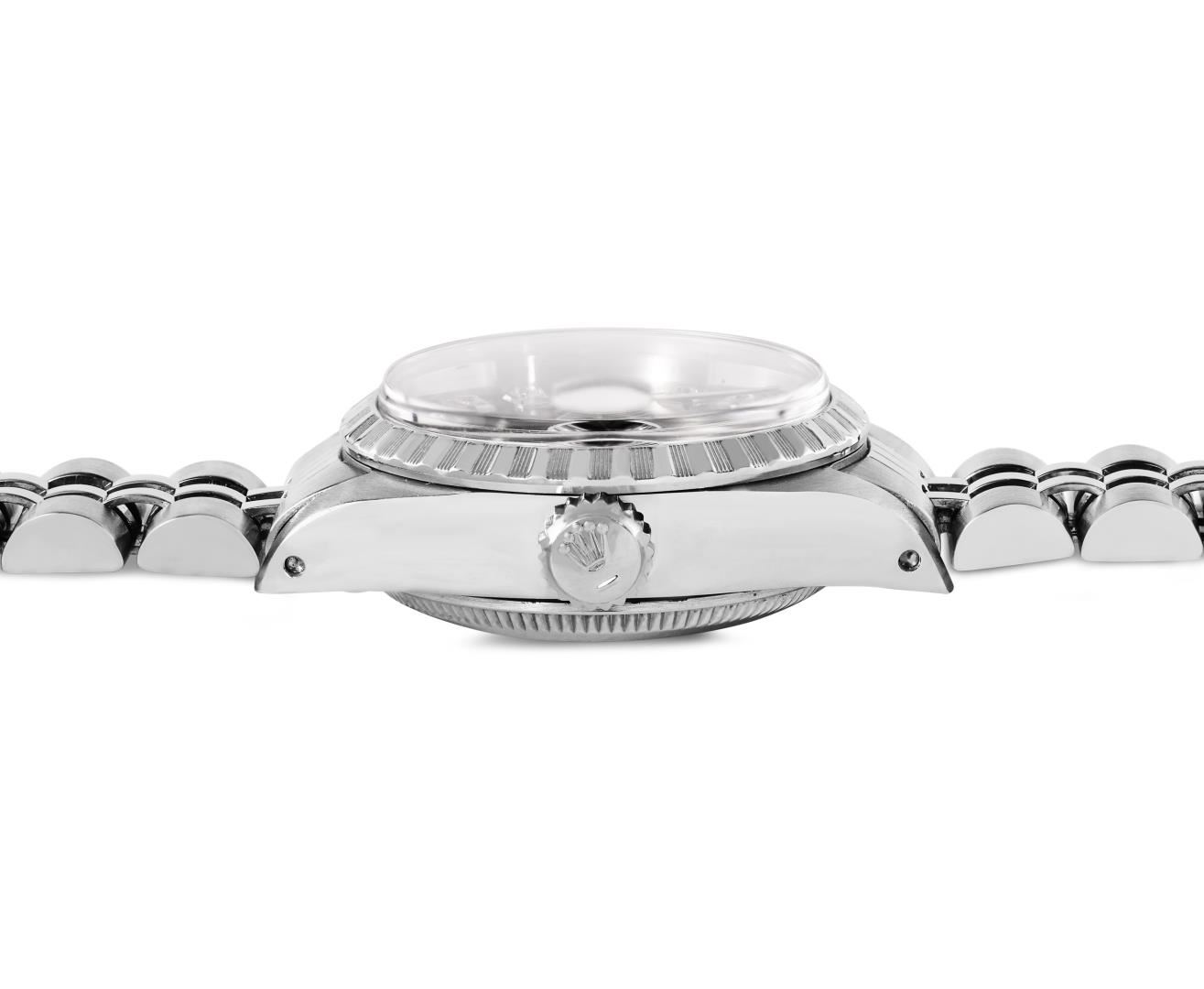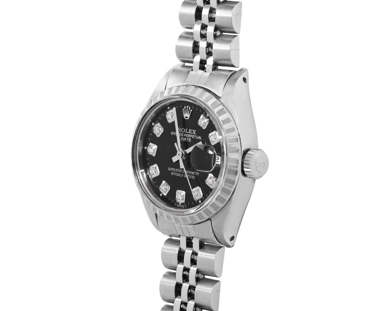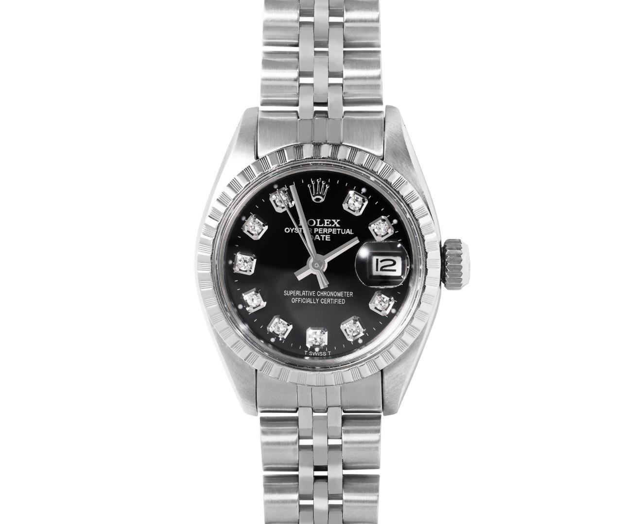 One Rolex Ladies Pre Owned Stainless Steel Date Wristwatch Polished Bright with Satin Finish, Serviced and Electronically Tested, Stainless Steel Case: 26mm, Stainless Steel Crown, Rolex Bezel: Stainless Steel Engine Turn Bezel, Custom Crystal: New Acrylic With Magnifying Date Window. Custom Hands: New Solid Hands. Rolex Movement: Automatic Winding Movement 2035. Custom Dial: Custom Black Dial With Added Diamond Hour Markers, Dash Tracks, And Lumi Dots, Diamond Count: 10 Diamonds On Dial. Date Window: 3 O'Clock Position Date Display, Model: Date. Condition: G-6 Extra Fine. Rolex Bracelet: Stainless Steel Jubilee Band. Bright Polish and Satin Finish. 6.0 Inch Length, Adjustable. Standard Clasp, With Rolex Logo. This Watch Has Been Serviced Time Tested And Is In Excellent Condition. It Is Free Of All Scratches And Dents.