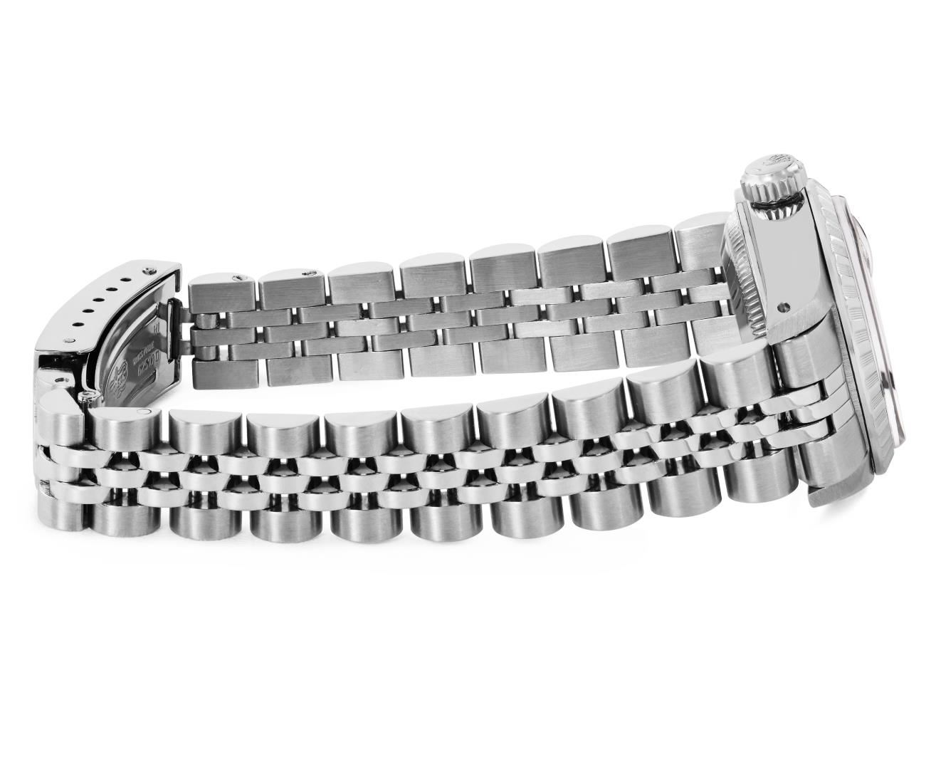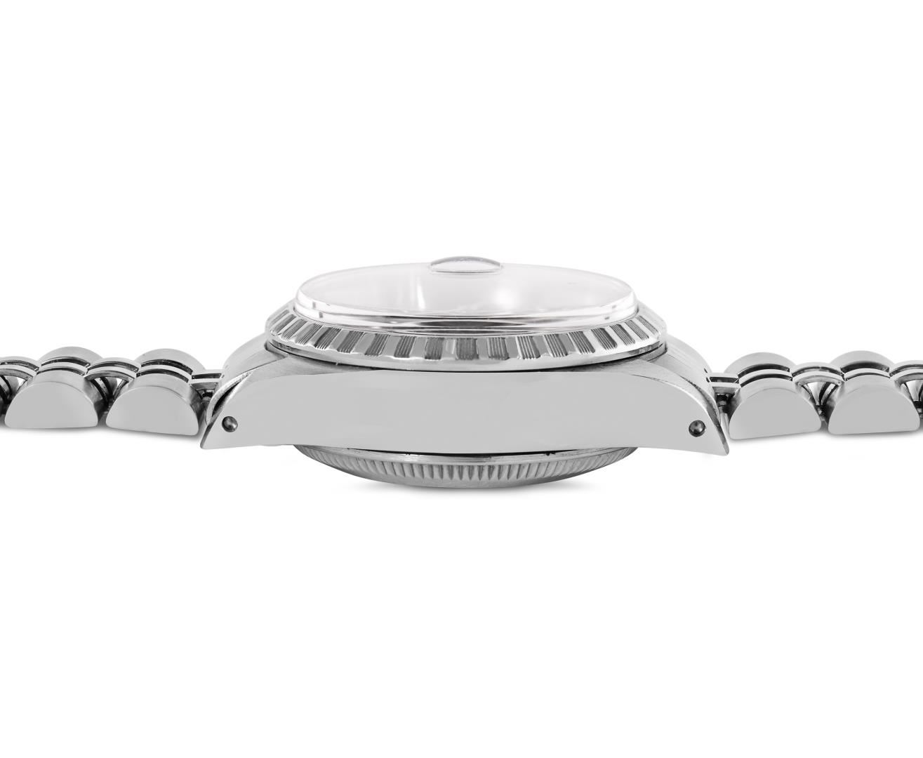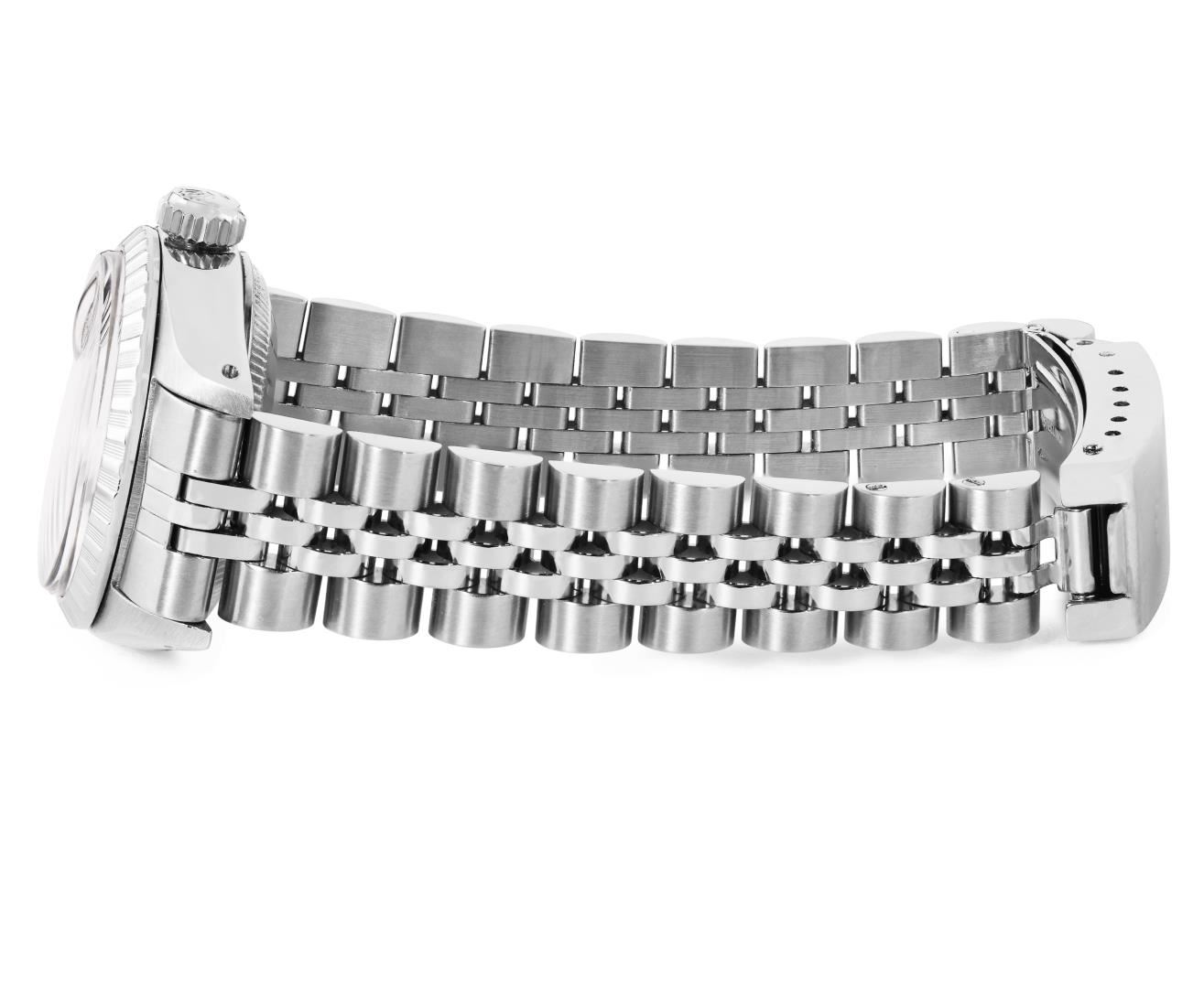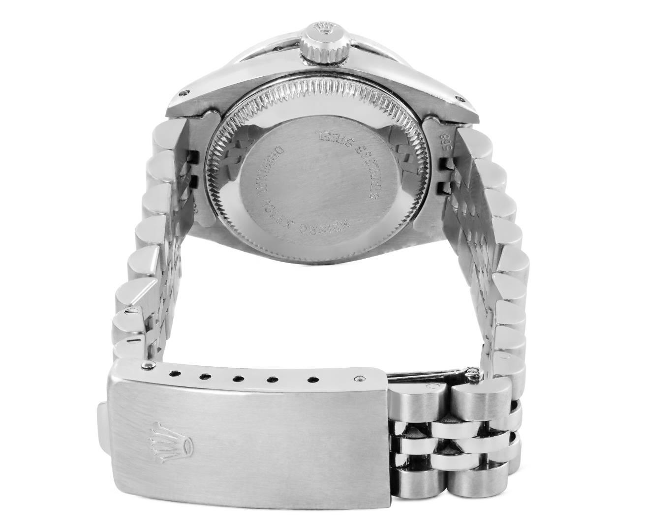 One Rolex Ladies Pre Owned Stainless Steel Date Wristwatch Polished Bright with Satin Finish, Serviced and Electronically Tested, Stainless Steel Case: 26mm, Stainless Steel Crown, Rolex Bezel: Stainless Steel Engine Turn Bezel, Custom Crystal: New Acrylic With Magnifying Date Window. Custom Hands: New Solid Hands. Rolex Movement: Automatic Winding Movement 2035. Custom Dial: Custom Black Dial With Added Diamond Hour Markers, Dash Tracks, And Lumi Dots, Diamond Count: 10 Diamonds On Dial. Date Window: 3 O'Clock Position Date Display, Model: Date. Condition: G-6 Extra Fine. Rolex Bracelet: Stainless Steel Jubilee Band. Bright Polish and Satin Finish. 6.0 Inch Length, Adjustable. Standard Clasp, With Rolex Logo. This Watch Has Been Serviced Time Tested And Is In Excellent Condition. It Is Free Of All Scratches And Dents.