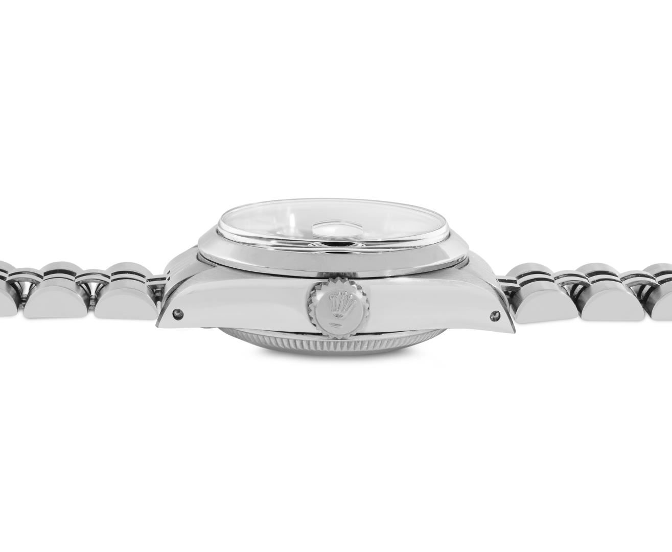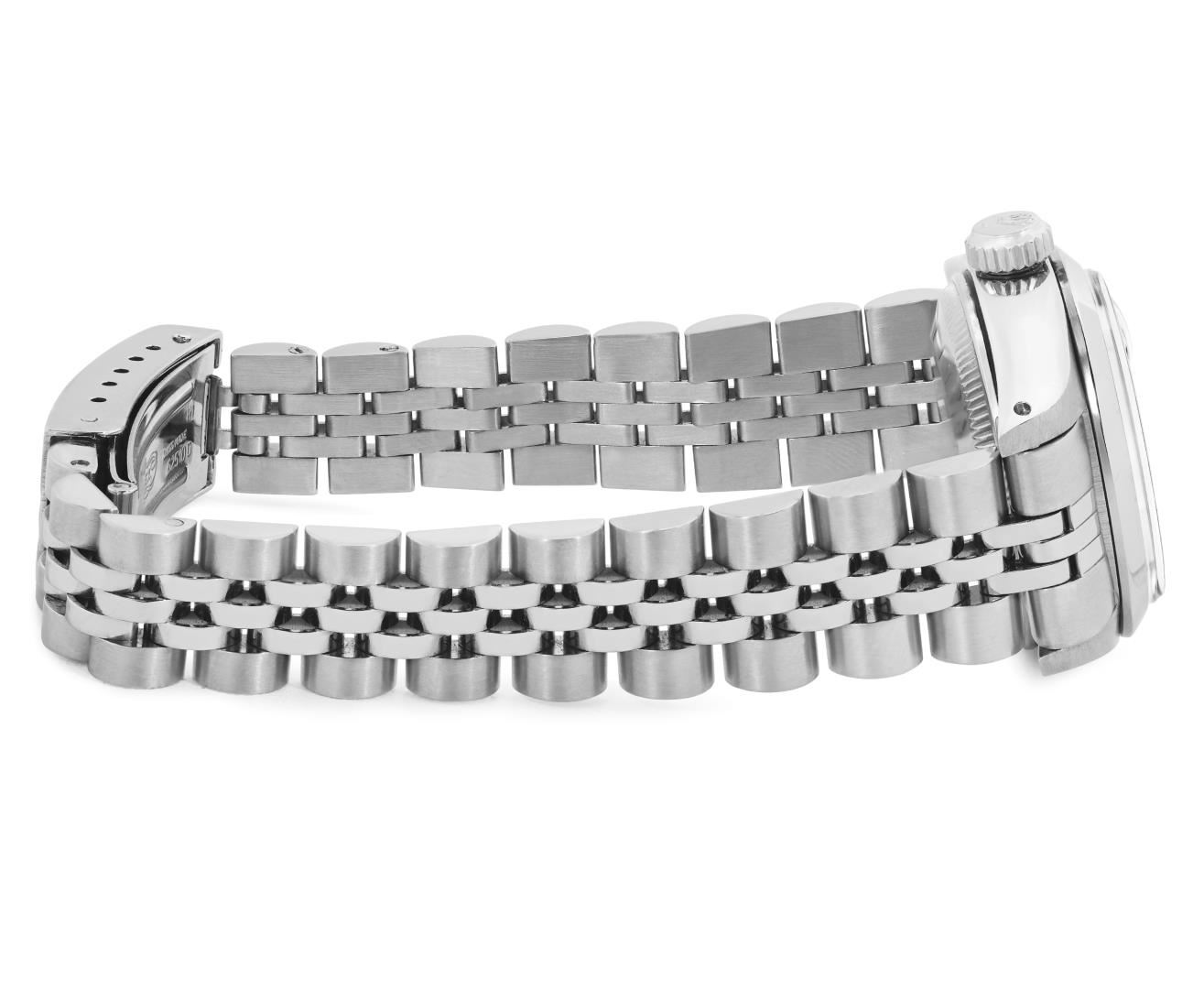 One Rolex Ladies Pre Owned Stainless Steel Date Wristwatch Polished Bright with Satin Finish, Serviced and Electronically Tested, Stainless Steel Case: 26mm, Stainless Steel Crown, Rolex Bezel: Stainless Steel Smooth Bezel, Custom Crystal: New Acrylic With Magnifying Date Window. Custom Hands: New Solid Hands. Rolex Movement: Automatic Winding Movement 2035. Custom Dial: Custom Black Dial With Added Diamond Hour Markers, Dash Tracks, And Lumi Dots, Diamond Count: 10 Diamonds On Dial. Date Window: 3 O'Clock Position Date Display, Model: Date. Condition: G-6 Extra Fine. Rolex Bracelet: Stainless Steel Jubilee Band. Bright Polish and Satin Finish. 6.0 Inch Length, Adjustable. Standard Clasp, With Rolex Logo. This Watch Has Been Serviced Time Tested And Is In Excellent Condition. It Is Free Of All Scratches And Dents.