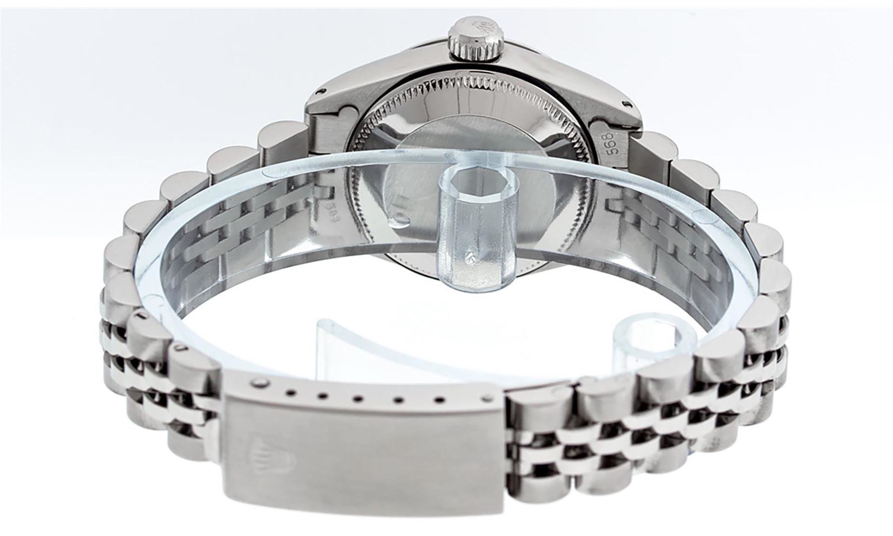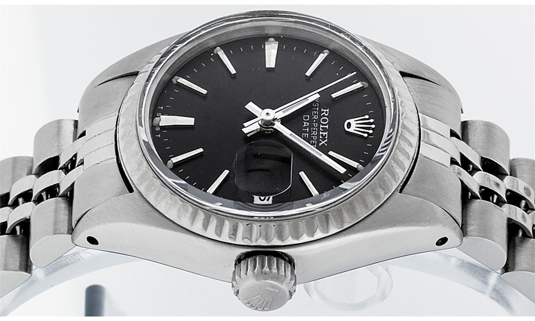One Ladies Stainless Steel Rolex Datejust Polished Bright with Satin Finish, Serviced & Electronically Tested, Stainless Steel Case: 26mm, Stainless Steel Crown, Bezel: 14K White Gold Fluted Bezel. Custom Crystal: New Acrylic Cyclops Lens. Custom Hands: New Luminescent Hands. Movement: Automatic Winding Movement Caliber 2030. Dial: Black Index Dial With Dash Track & Lumi Dots, Date Window: 3 O'Clock Position Date Display, Model: Datejust. Condition: G-6 Extra Fine. Bracelet: Stainless Steel Jubilee Band. Bright Polish & Satin Finish. 6.0 Inch Length, Adjustable. Standard Clasp, With Rolex Logo. This Watch Has Been Serviced Time Tested And Is In Excellent Condition It Is Free Of All Scratches And Dents.