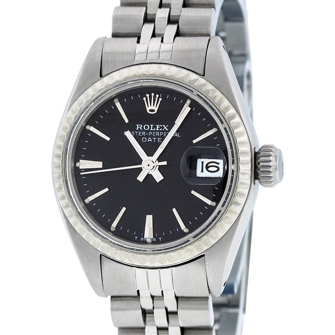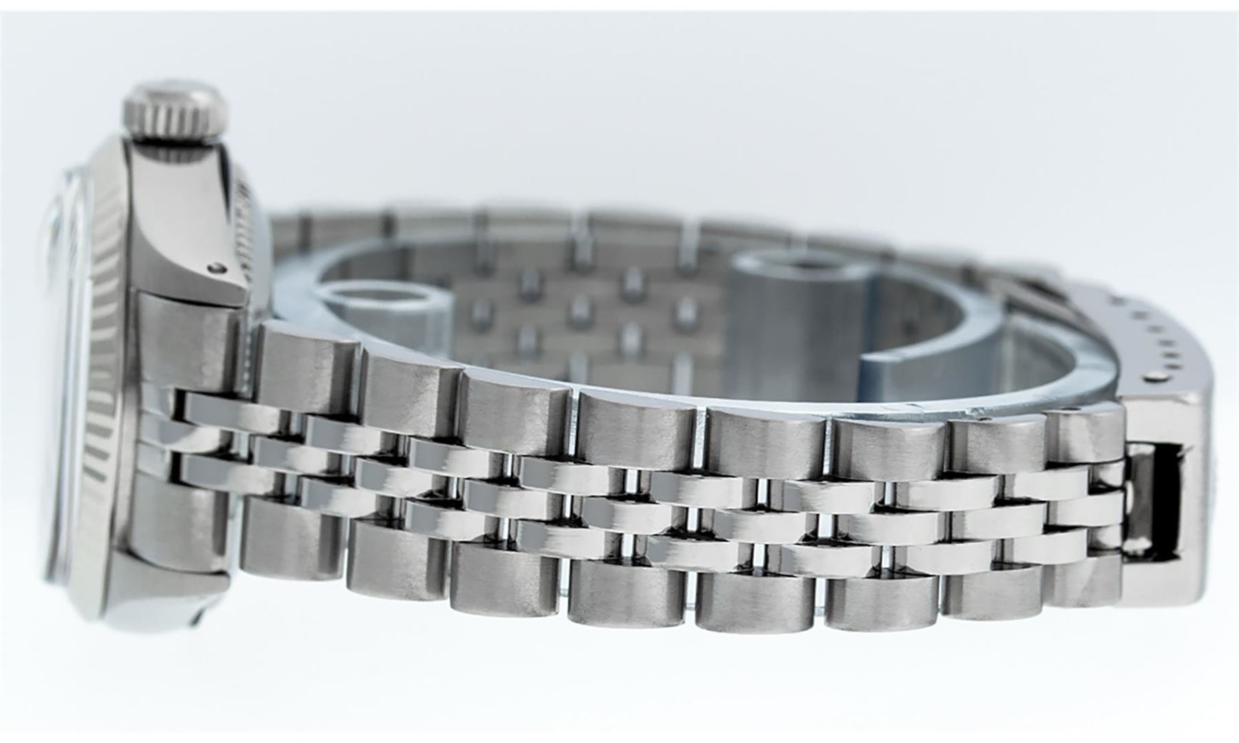 One Ladies Stainless Steel Rolex Datejust Polished Bright with Satin Finish, Serviced & Electronically Tested, Stainless Steel Case: 26mm, Stainless Steel Crown, Bezel: 14K White Gold Fluted Bezel. Custom Crystal: New Acrylic Cyclops Lens. Custom Hands: New Luminescent Hands. Movement: Automatic Winding Movement. Dial: Black Index Dial With Dash Track & Lumi Dots, Date Window: 3 O'Clock Position Date Display, Model: Datejust. Condition: G-6 Extra Fine. Bracelet: Stainless Steel Jubilee Band. Bright Polish & Satin Finish. 6.0 Inch Length, Adjustable. Standard Clasp, With Rolex Logo. This Watch Has Been Serviced Time Tested And Is In Excellent Condition It Is Free Of All Scratches And Dents.