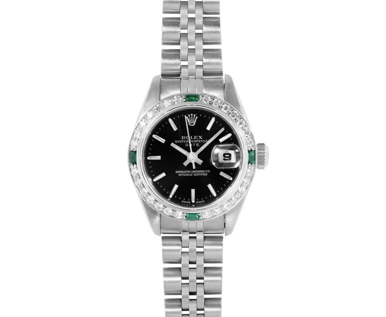 One Rolex Ladies Pre Owned Quickset Stainless Steel Date Wristwatch Polished Bright with Satin Finish, Serviced And Electronically Tested, Stainless Steel Case: 26mm, Stainless Steel Crown, Custom Bezel: New 18K White Gold Emerald Beadset Diamond Bezel, Diamond + Gem Count: 36 Diamonds + 4 Emeralds. Custom Crystal: New Sapphire With Magnified Date Window. Custom Hands: New Luminescent Hands. Rolex Movement: 2235 Automatic Winding Movement. Rolex Dial: Factory Black Dial With Index Hour Markers, and Dash Track. Date Window: 3 O'Clock Position Date Display, Model: Quickset Datejust. Condition: G-6 Extra Fine. Rolex Bracelet: Stainless Steel Jubilee Band. Bright Polish And Satin Finish. 6.0 Inch Length, Adjustable. Standard Clasp, With Rolex Logo. This Watch Has Been Serviced Time Tested And Is In Excellent Condition. It Is Free Of All Scratches And Dents.