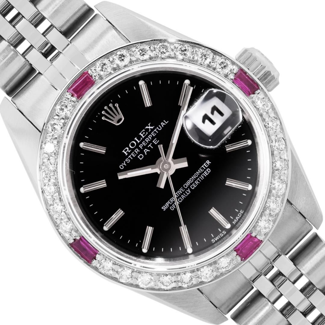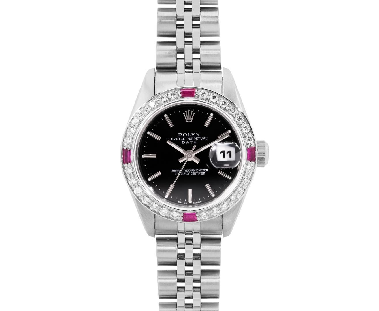 One Rolex Ladies Pre Owned Quickset Stainless Steel Date Wristwatch Polished Bright with Satin Finish, Serviced And Electronically Tested, Stainless Steel Case: 26mm, Stainless Steel Crown, Custom Bezel: New 18K White Gold Ruby Beadset Diamond Bezel, Diamond + Gem Count: 36 Diamonds + 4 Rubies. Custom Crystal: New Sapphire With Magnified Date Window. Custom Hands: New Luminescent Hands. Rolex Movement: 2235 Automatic Winding Movement. Rolex Dial: Factory Black Dial With Index Hour Markers, and Dash Track. Date Window: 3 O'Clock Position Date Display, Model: Quickset Datejust. Condition: G-6 Extra Fine. Rolex Bracelet: Stainless Steel Jubilee Band. Bright Polish And Satin Finish. 6.0 Inch Length, Adjustable. Standard Clasp, With Rolex Logo. This Watch Has Been Serviced Time Tested And Is In Excellent Condition. It Is Free Of All Scratches And Dents. This Watch Comes With A Rolex Box.