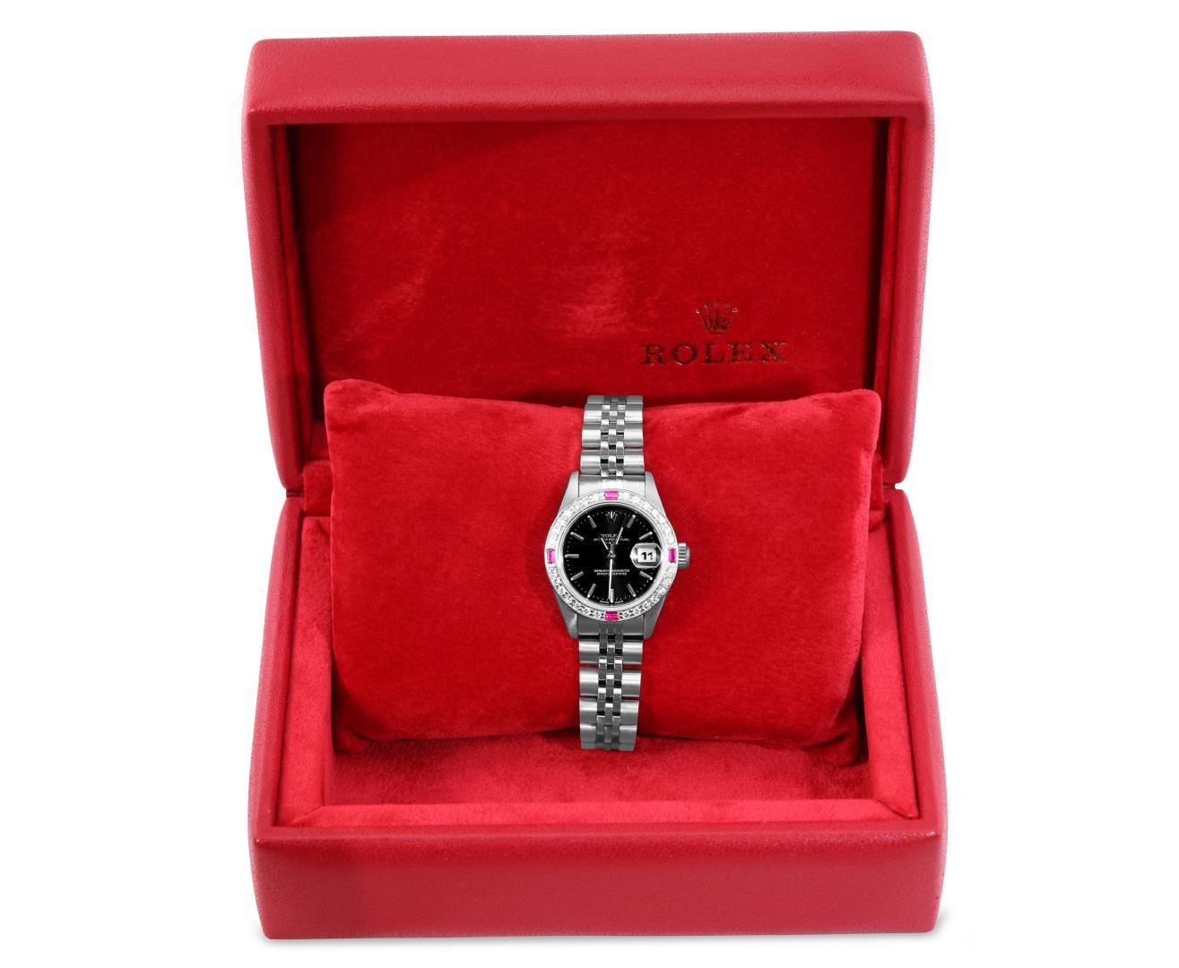 One Rolex Ladies Pre Owned Quickset Stainless Steel Date Wristwatch Polished Bright with Satin Finish, Serviced And Electronically Tested, Stainless Steel Case: 26mm, Stainless Steel Crown, Custom Bezel: New 18K White Gold Ruby Beadset Diamond Bezel, Diamond + Gem Count: 36 Diamonds + 4 Rubies. Custom Crystal: New Sapphire With Magnified Date Window. Custom Hands: New Luminescent Hands. Rolex Movement: 2235 Automatic Winding Movement. Rolex Dial: Factory Black Dial With Index Hour Markers, and Dash Track. Date Window: 3 O'Clock Position Date Display, Model: Quickset Datejust. Condition: G-6 Extra Fine. Rolex Bracelet: Stainless Steel Jubilee Band. Bright Polish And Satin Finish. 6.0 Inch Length, Adjustable. Standard Clasp, With Rolex Logo. This Watch Has Been Serviced Time Tested And Is In Excellent Condition. It Is Free Of All Scratches And Dents. This Watch Comes With A Rolex Box.