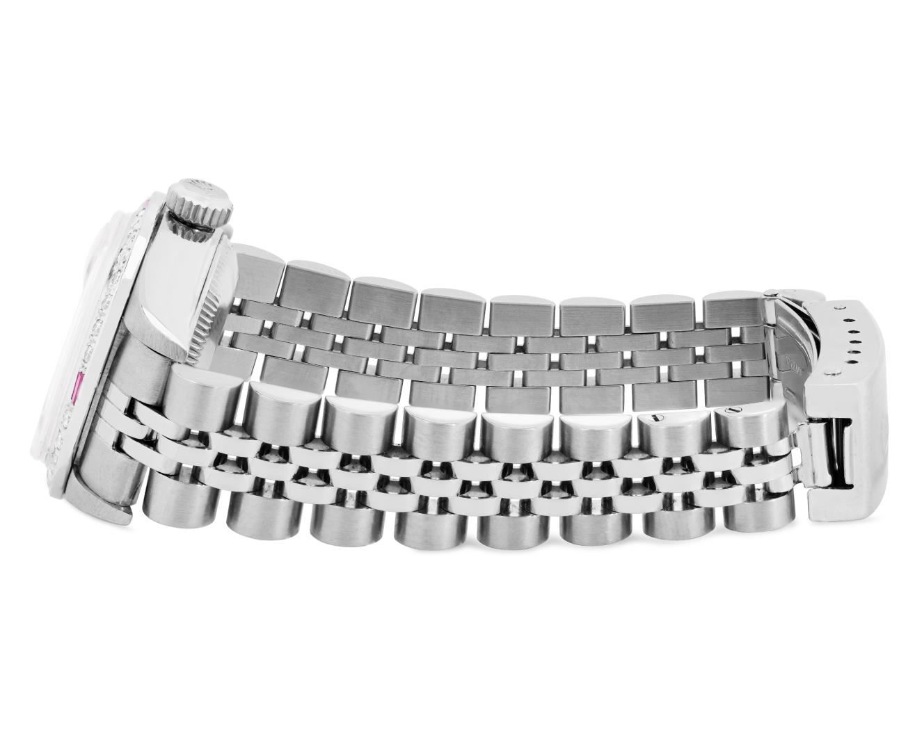 One Rolex Ladies Pre Owned Quickset Stainless Steel Date Wristwatch Polished Bright with Satin Finish, Serviced And Electronically Tested, Stainless Steel Case: 26mm, Stainless Steel Crown, Custom Bezel: New 18K White Gold Ruby Beadset Diamond Bezel, Diamond + Gem Count: 36 Diamonds + 4 Rubies. Custom Crystal: New Sapphire With Magnified Date Window. Custom Hands: New Luminescent Hands. Rolex Movement: 2235 Automatic Winding Movement. Rolex Dial: Factory Black Dial With Index Hour Markers, and Dash Track. Date Window: 3 O'Clock Position Date Display, Model: Quickset Datejust. Condition: G-6 Extra Fine. Rolex Bracelet: Stainless Steel Jubilee Band. Bright Polish And Satin Finish. 6.0 Inch Length, Adjustable. Standard Clasp, With Rolex Logo. This Watch Has Been Serviced Time Tested And Is In Excellent Condition. It Is Free Of All Scratches And Dents. This Watch Comes With A Rolex Box.