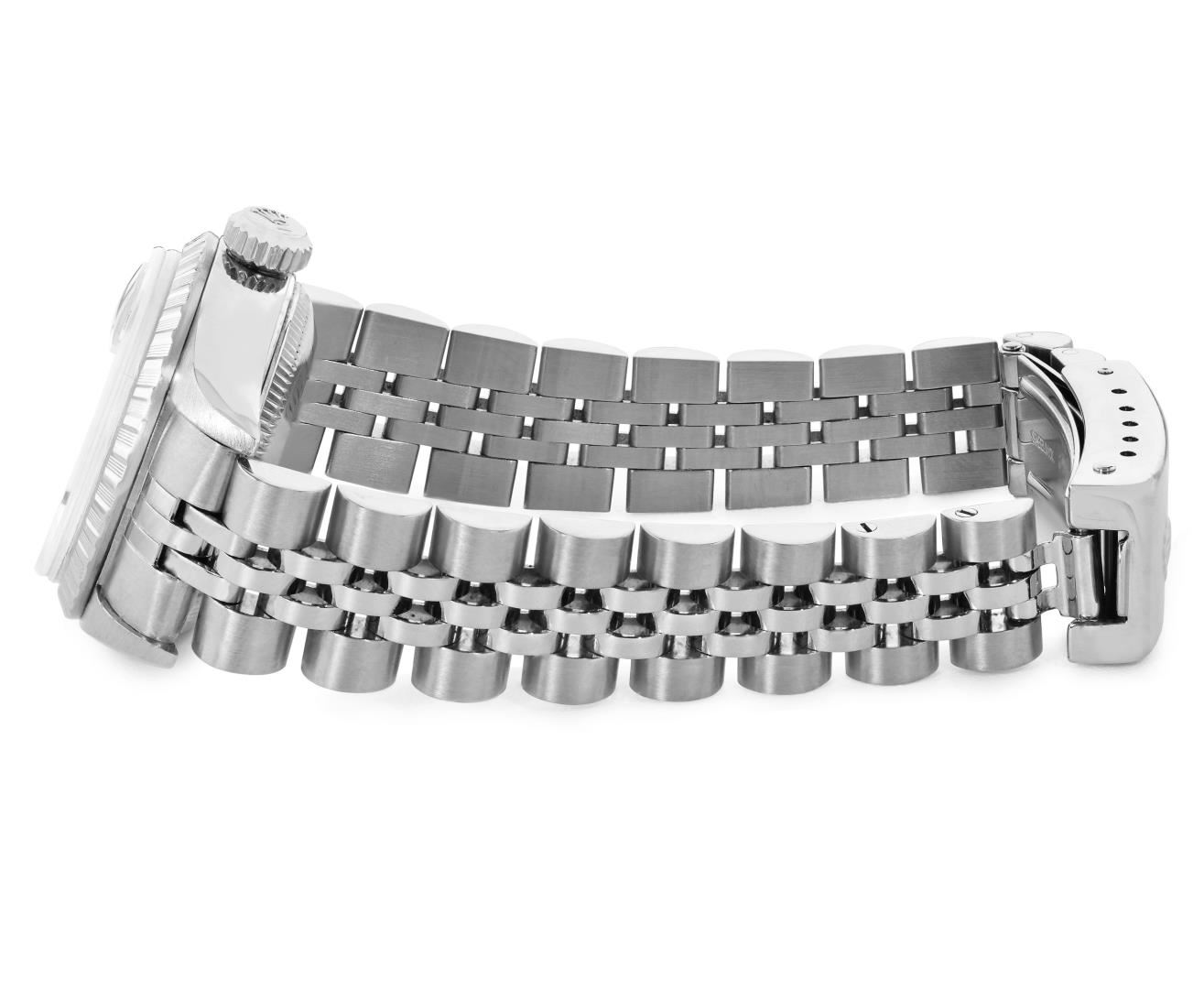 One Rolex Ladies Pre Owned Quickset Stainless Steel Date Wristwatch Polished Bright with Satin Finish, Serviced And Electronically Tested, Stainless Steel Case: 26mm, Stainless Steel Crown, Rolex Stainless Steel Engine Turn bezel. Crystal: Sapphire With Magnified Date Window. Hands: Luminescent Hands. Rolex Movement: 2235 Automatic Winding Movement. Rolex Dial: Factory Black With Index Hour Markers, Dash Track, And Lumi Dots. Date Window: 3 O'Clock Position Date Display, Model: Sapphire Date. Condition: G-6 Extra Fine. Rolex Bracelet: Stainless Steel Jubilee Band. Bright Polish & Satin Finish. 6.0 Inch Length, Adjustable. Standard Clasp, With Rolex Logo. This Watch Has Been Serviced And Time Tested. It Is In Excellent Condition, Free Of All Scratches And Dents. This Watch Comes With A Rolex Box.