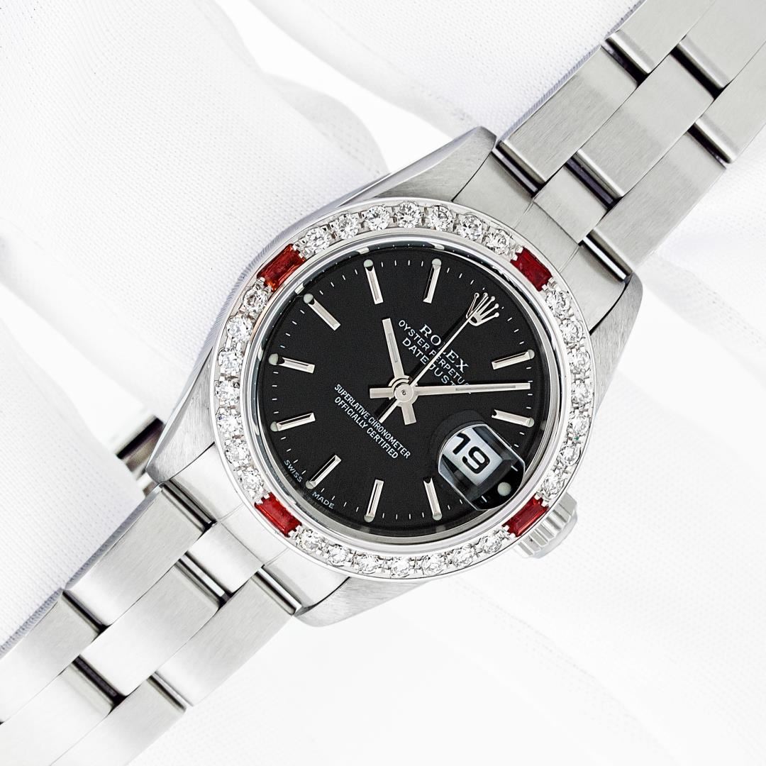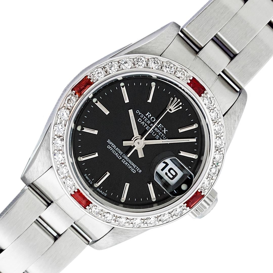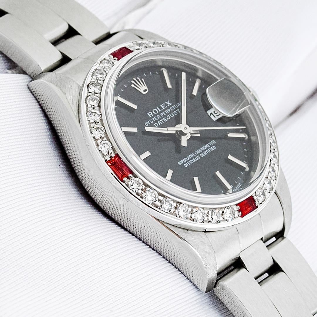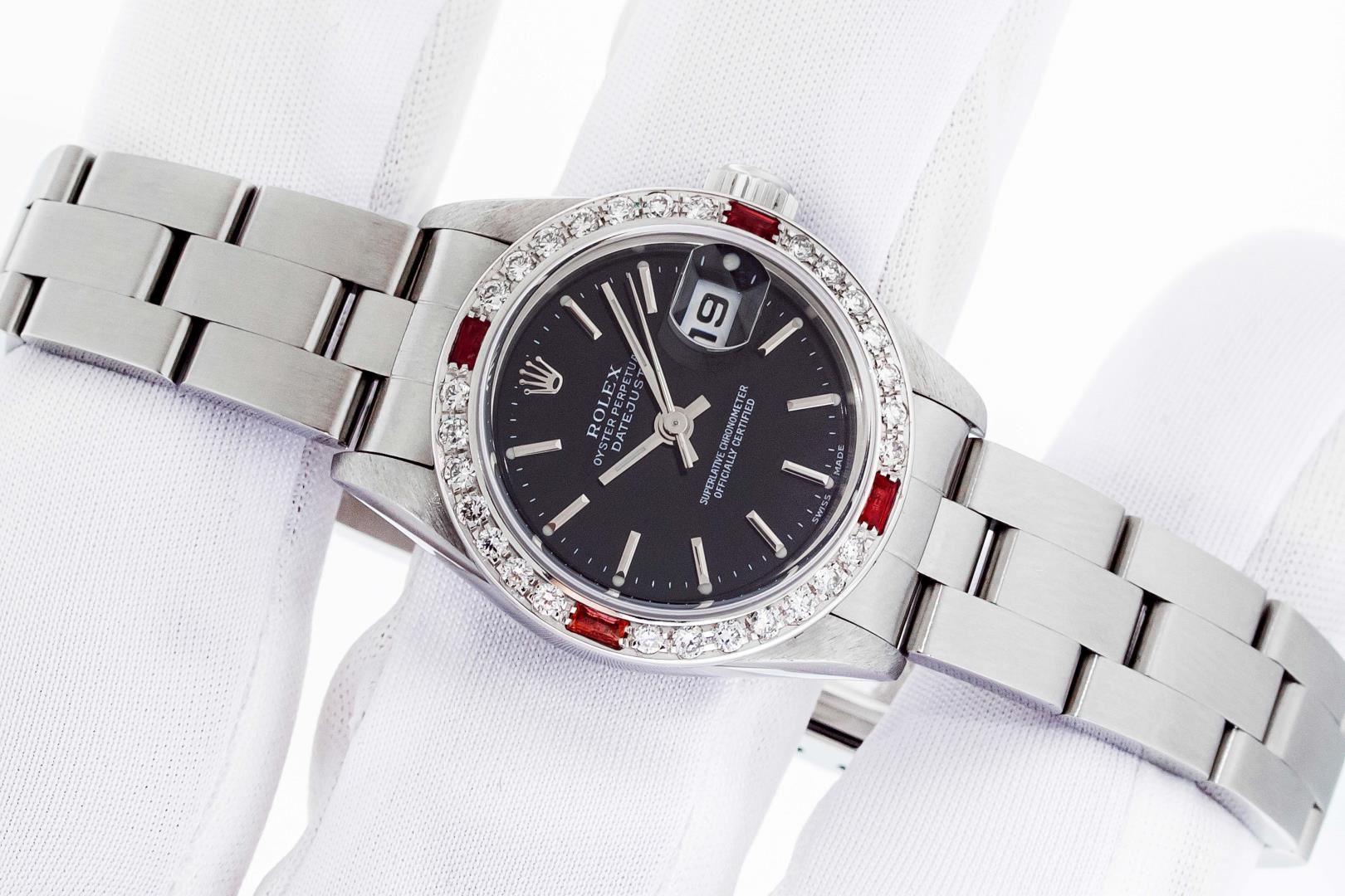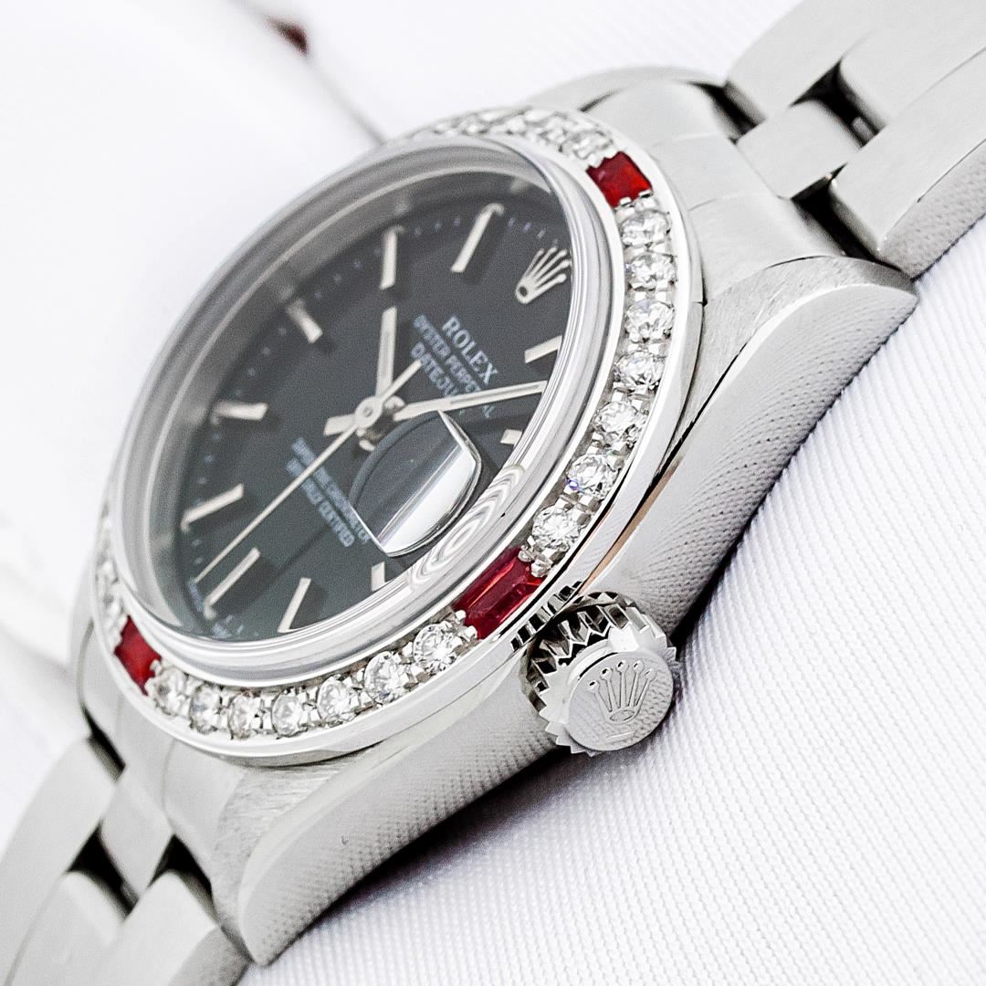 One Ladies Pre Owned Quickset Stainless Steel Rolex Datejust Polished Bright with Satin Finish, Serviced & Electronically Tested, Stainless Steel Case: 26mm, Rolex Stainless Steel Crown, Custom Bezel: New 18K White Gold Ruby Bead Set Diamond Bezel, Diamond + Gem Count: 28 Diamonds + 4 Rubies. Custom Crystal: New Sapphire With Magnified Date Window. Custom Hands: New Luminescent Hands. Rolex Movement: Automatic Winding Movement 2235. Rolex Dial: Black With Index Hour Markers & Lumi Dots. Date Window: 3 O'Clock Position Date Display, Model: Quickset Datejust. Condition: G-6 Extra Fine. Rolex Bracelet: Stainless Steel Oyster Band. Bright Polish & Satin Finish. 6.0 Inch Length, Adjustable. Standard Clasp, With Rolex Logo. This Watch Has Been Serviced Time Tested And Is In Excellent Condition It Is Free Of All Scratches And Dents.