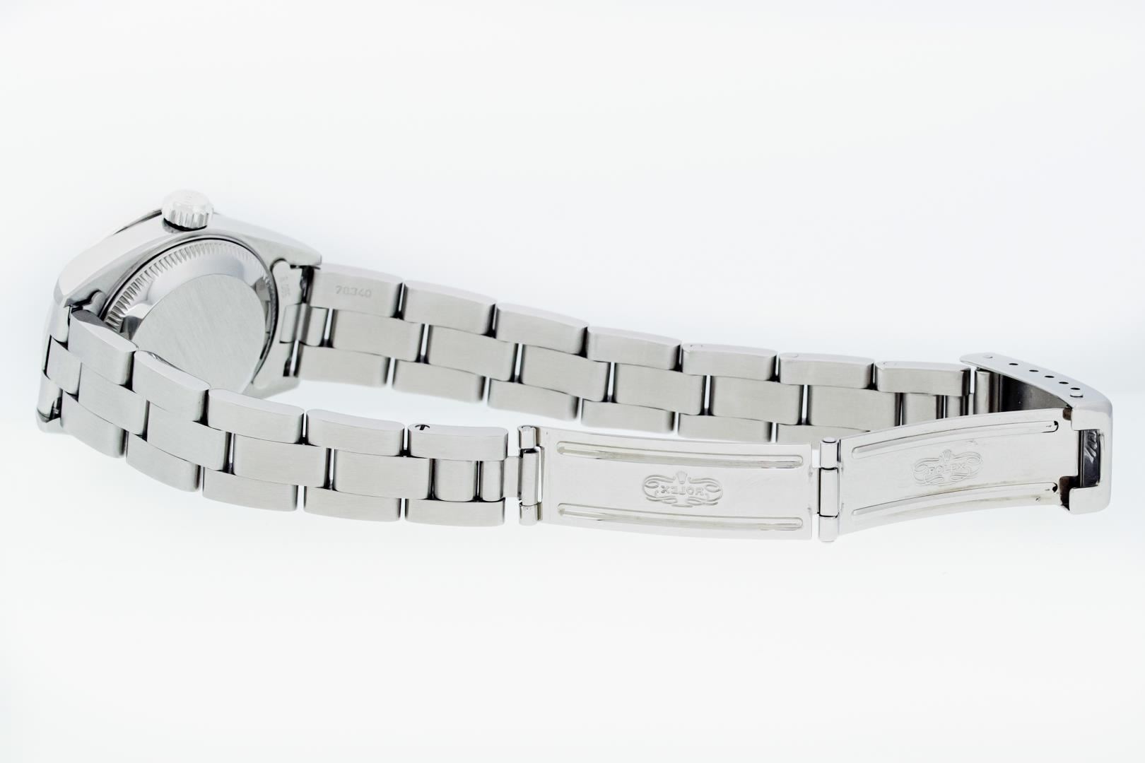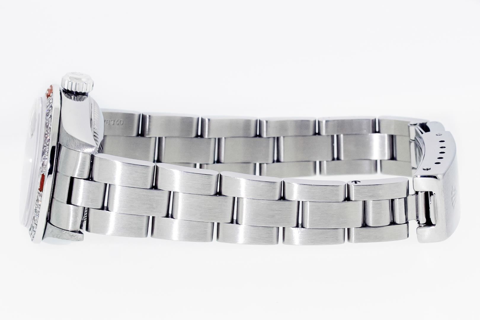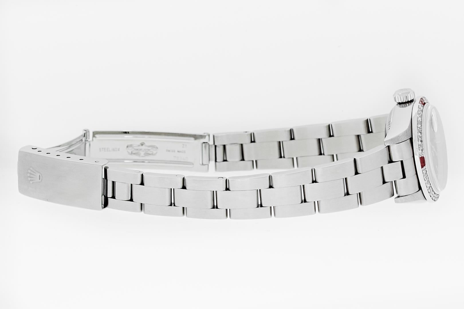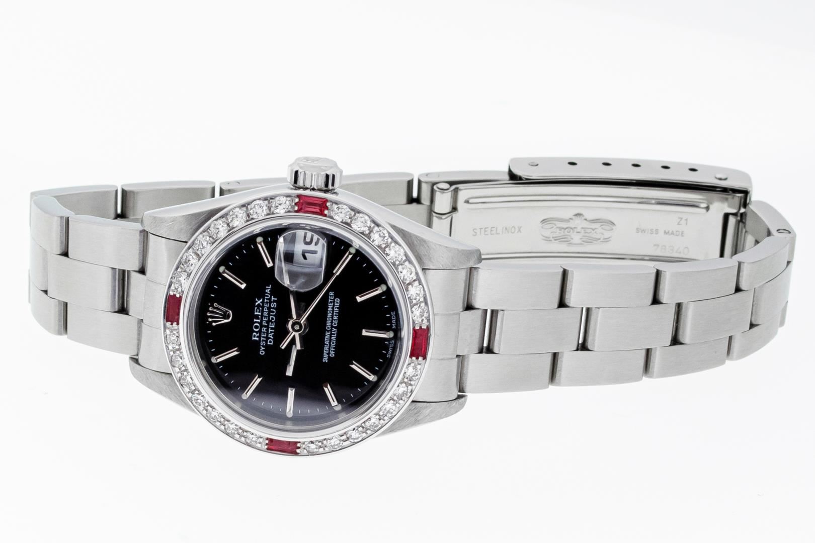 One Ladies Pre Owned Quickset Stainless Steel Rolex Datejust Polished Bright with Satin Finish, Serviced & Electronically Tested, Stainless Steel Case: 26mm, Rolex Stainless Steel Crown, Custom Bezel: New 18K White Gold Ruby Bead Set Diamond Bezel, Diamond + Gem Count: 28 Diamonds + 4 Rubies. Custom Crystal: New Sapphire With Magnified Date Window. Custom Hands: New Luminescent Hands. Rolex Movement: Automatic Winding Movement 2235. Rolex Dial: Black With Index Hour Markers & Lumi Dots. Date Window: 3 O'Clock Position Date Display, Model: Quickset Datejust. Condition: G-6 Extra Fine. Rolex Bracelet: Stainless Steel Oyster Band. Bright Polish & Satin Finish. 6.0 Inch Length, Adjustable. Standard Clasp, With Rolex Logo. This Watch Has Been Serviced Time Tested And Is In Excellent Condition It Is Free Of All Scratches And Dents.