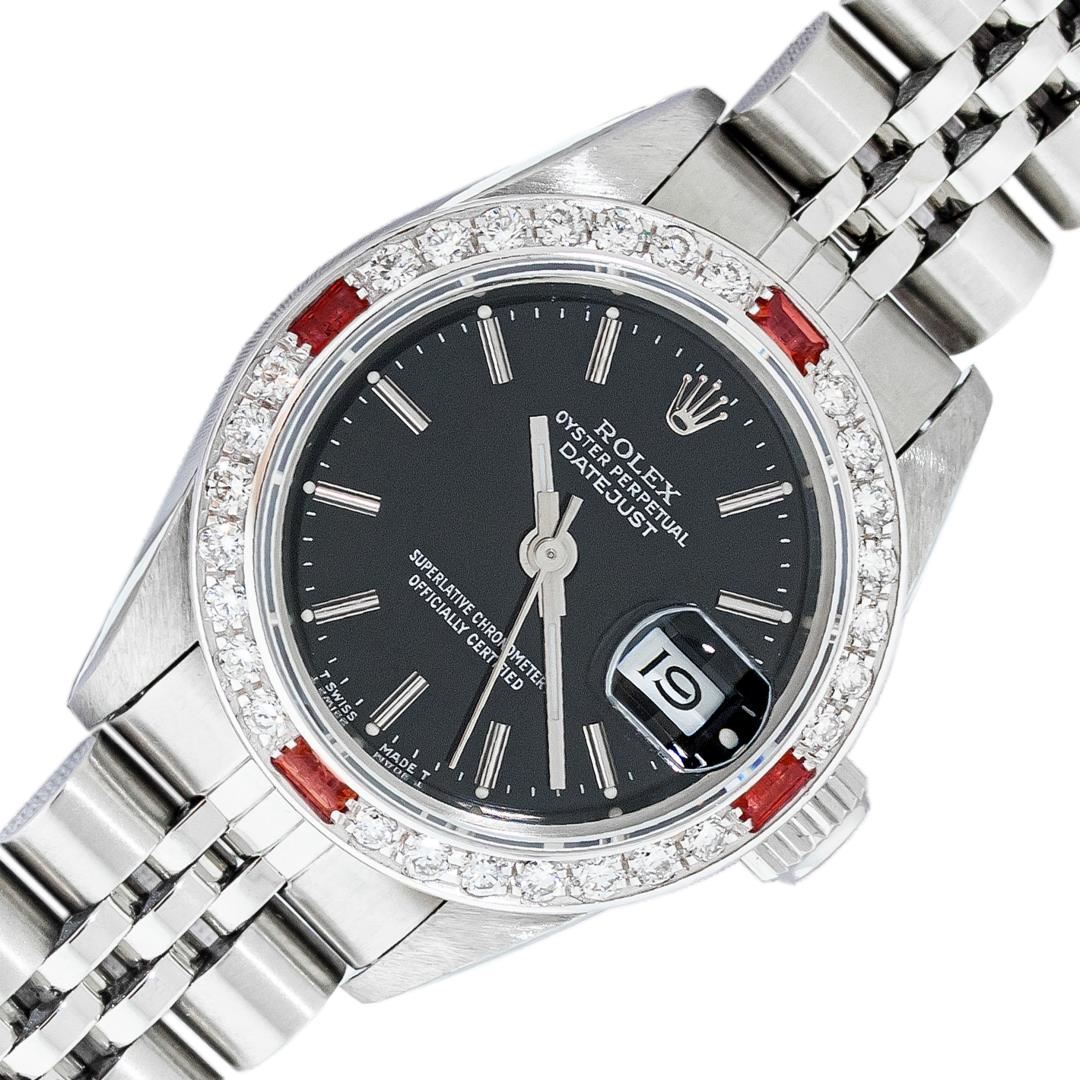 One Ladies Pre Owned Quickset Stainless Steel Rolex Datejust Polished Bright with Satin Finish Serviced & Electronically Tested, Rolex Stainless Steel Case: 26mm, Rolex Stainless Steel Crown, Custom Bezel: New 18K White Gold Beadset Diamond And Ruby Bezel, Diamond Count: 28 Diamonds + 4 Rubies, Color: G to H, Clarity: SI-VS, Custom Crystal: New Sapphire With Magnified Date Window. Custom Hands: New Luminescent Hands. Rolex Movement: Automatic Winding Movement. Rolex Dial: Black Index Dial With Dash Track And Lumi Dots. Date Window: 3 O'Clock Position Date Display, Model: Quickset Datejust. Condition: G-6 Extra Fine. Rolex Bracelet: Stainless Steel Jubilee Band With Rolex Crown On Buckle. Bright Polish & Satin Finish. Band Length: 6.0 Inch Length, Adjustable. Standard Clasp, With Rolex Logo. This Watch Has Been Serviced Time Tested And Is In Excellent Condition It Is Free Of All Scratches And Dents.
