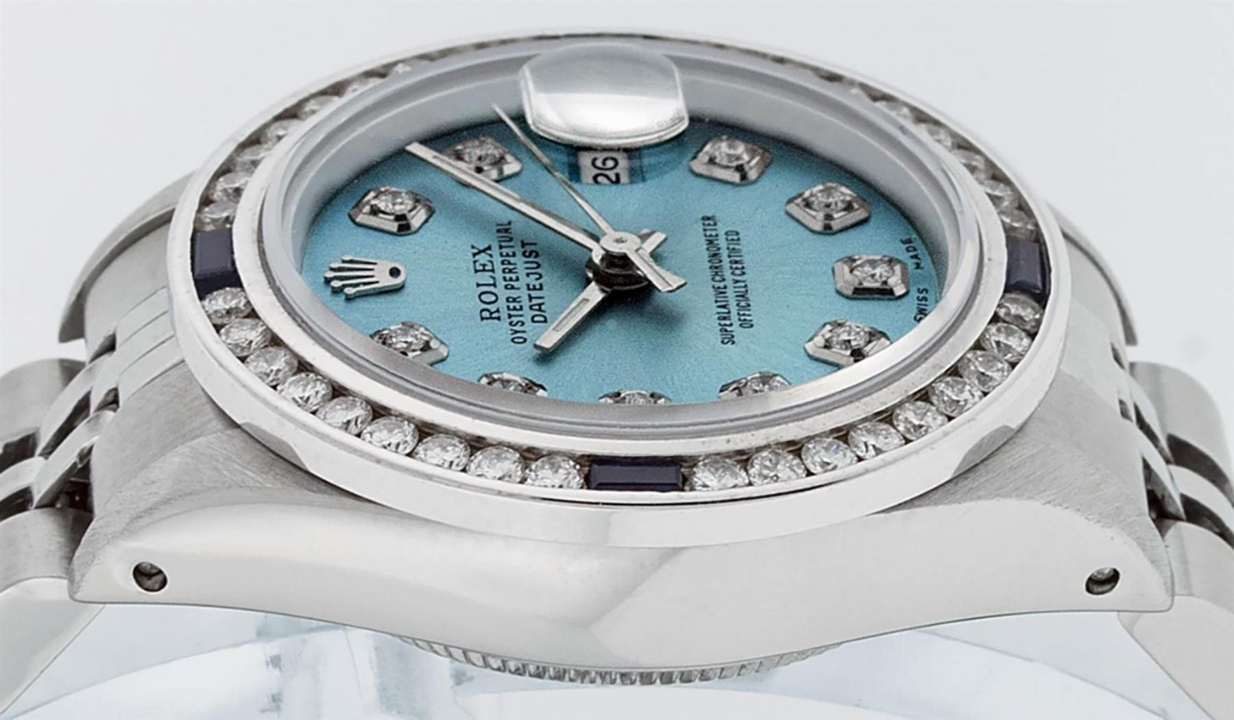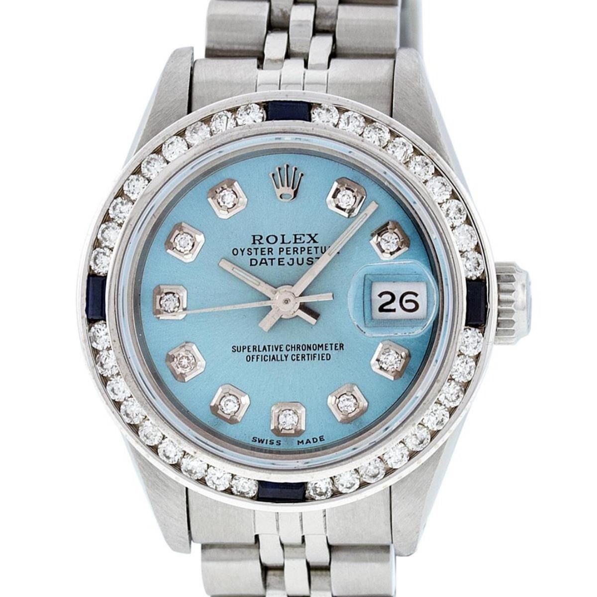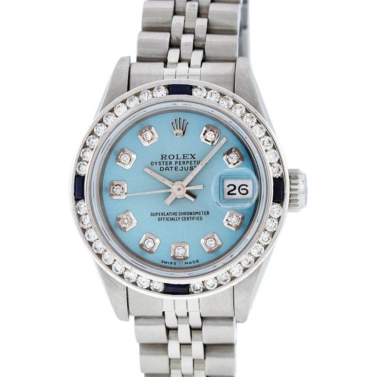 One Ladies Stainless Steel Rolex Datejust Polished Bright with Satin Finish, Serviced & Electronically Tested, Stainless Steel Case: 26mm, Stainless Steel Crown, Custom Bezel: New 18K White Gold Sapphire Channel Set Diamond Bezel, Diamond + Gem Count: 36 Diamonds + 4 Sapphires Total Weight 1.00 Carat, Clarity: SI-VS, Color: G to H. Custom Crystal: New Scratch Resistant Synthetic Sapphire Cyclops Lens. Custom Hands: New Luminescent Hands. Movement: Automatic Winding Movement. Custom Dial: Refinished Ice Blue With Diamond Hour Markers. Date Window: 3 O'Clock Position Date Display, Model: Datejust. Condition: G-6 Extra Fine. Bracelet: Stainless Steel Jubilee. Bright Polish & Satin Finish. 6.0 Inch Length, Adjustable. Standard Clasp, With Rolex Logo. This Watch Has Been Serviced Time Tested And Is In Excellent Condition It Is Free Of All Scratches And Dents.