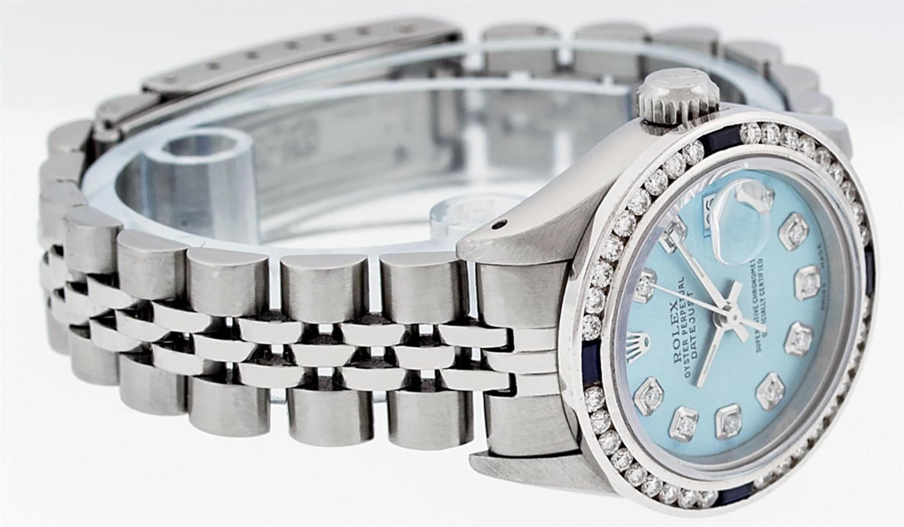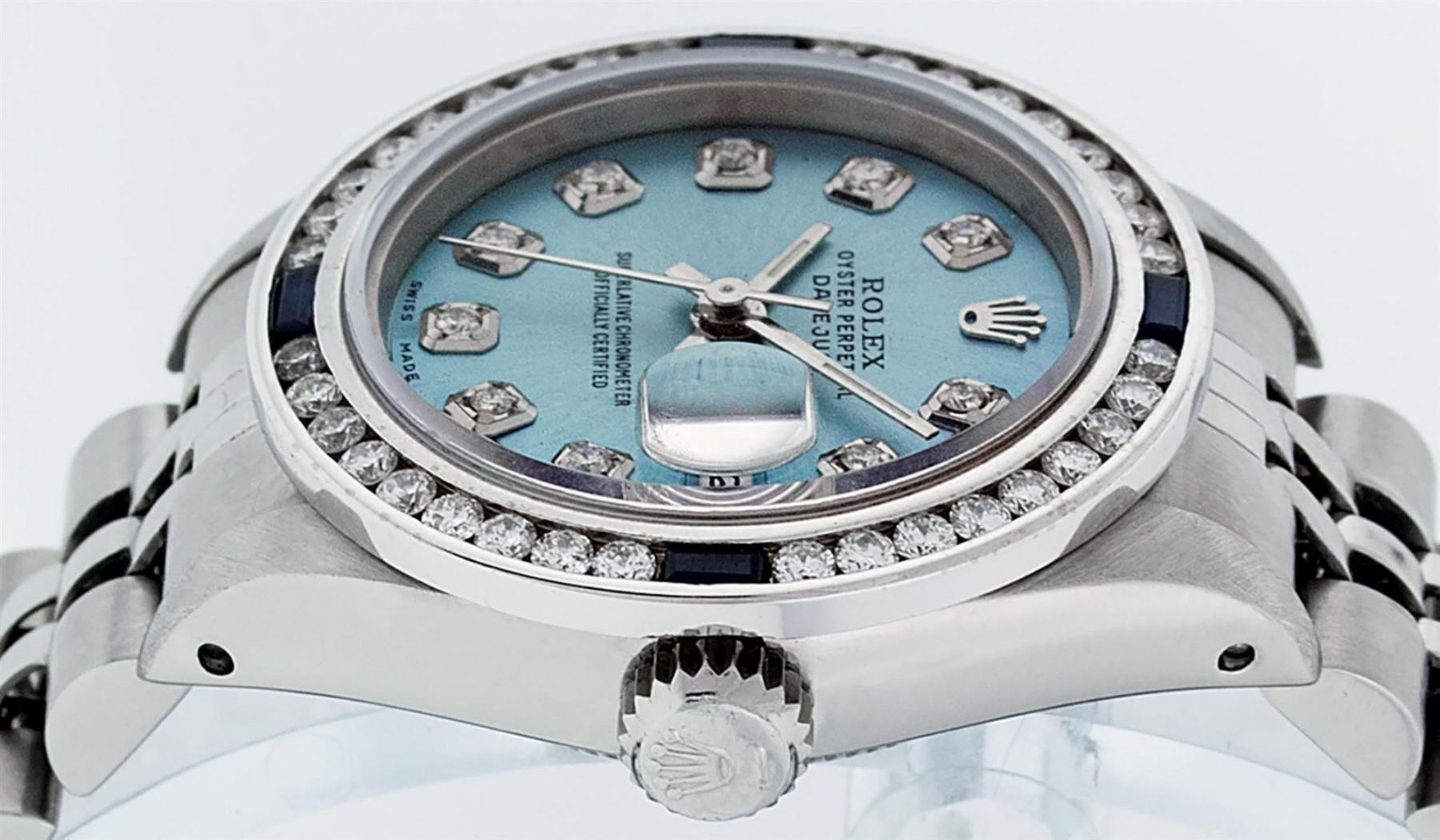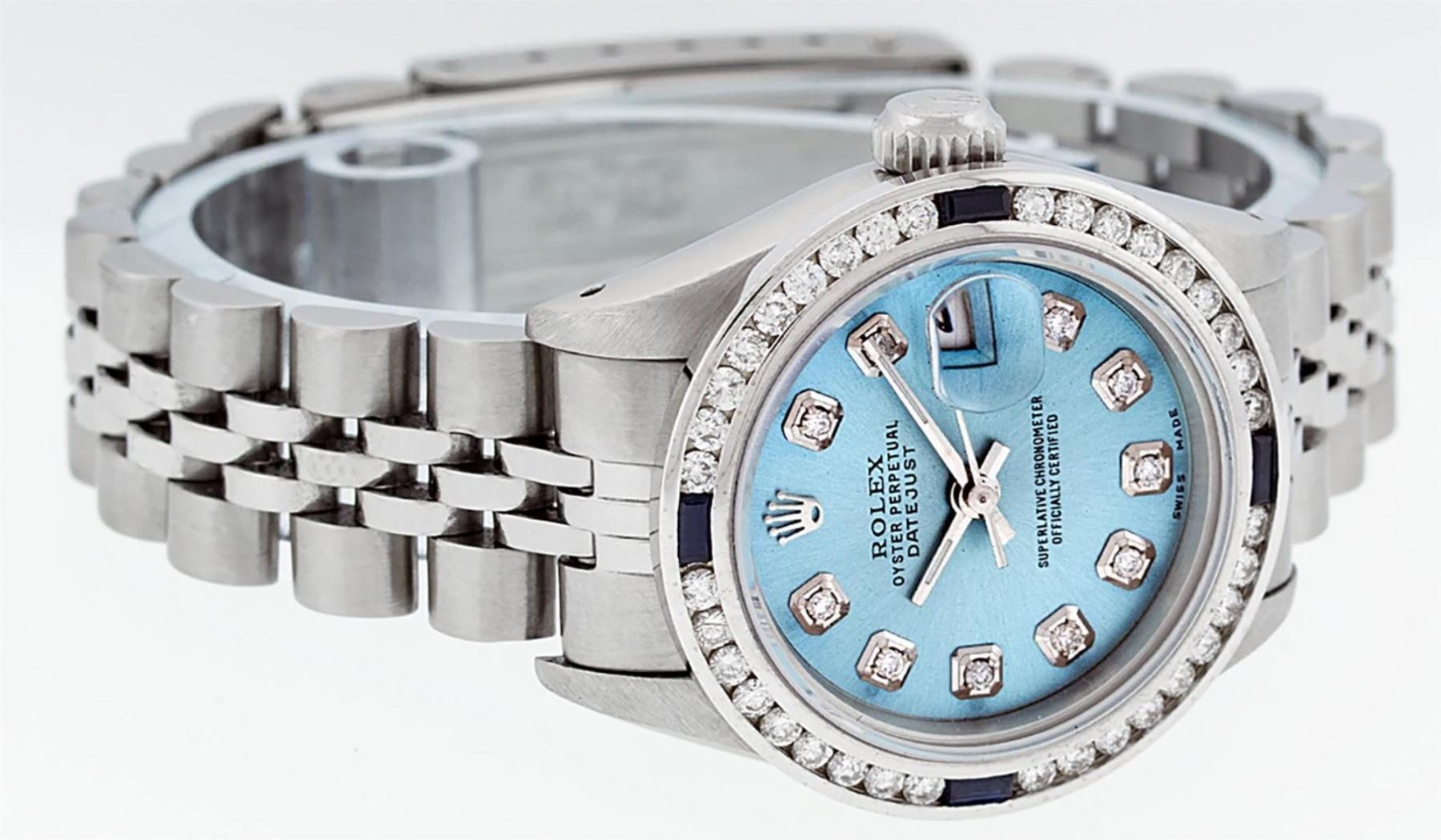 One Ladies Stainless Steel Rolex Datejust Polished Bright with Satin Finish, Serviced & Electronically Tested, Stainless Steel Case: 26mm, Stainless Steel Crown, Custom Bezel: New 18K White Gold Sapphire Channel Set Diamond Bezel, Diamond + Gem Count: 36 Diamonds + 4 Sapphires Total Weight 1.00 Carat, Clarity: SI-VS, Color: G to H. Custom Crystal: New Scratch Resistant Synthetic Sapphire Cyclops Lens. Custom Hands: New Luminescent Hands. Movement: Automatic Winding Movement. Custom Dial: Refinished Ice Blue With Diamond Hour Markers. Date Window: 3 O'Clock Position Date Display, Model: Datejust. Condition: G-6 Extra Fine. Bracelet: Stainless Steel Jubilee. Bright Polish & Satin Finish. 6.0 Inch Length, Adjustable. Standard Clasp, With Rolex Logo. This Watch Has Been Serviced Time Tested And Is In Excellent Condition It Is Free Of All Scratches And Dents.