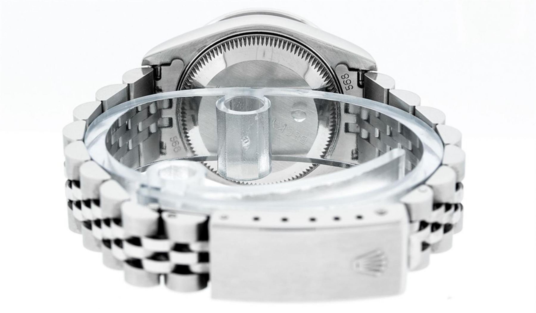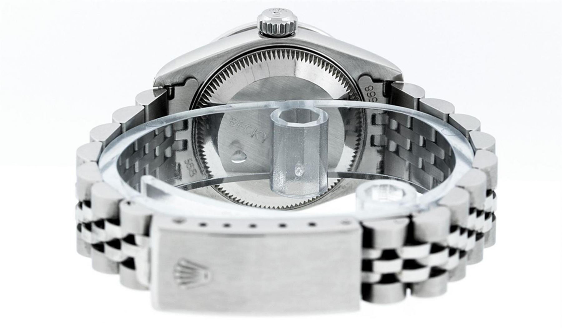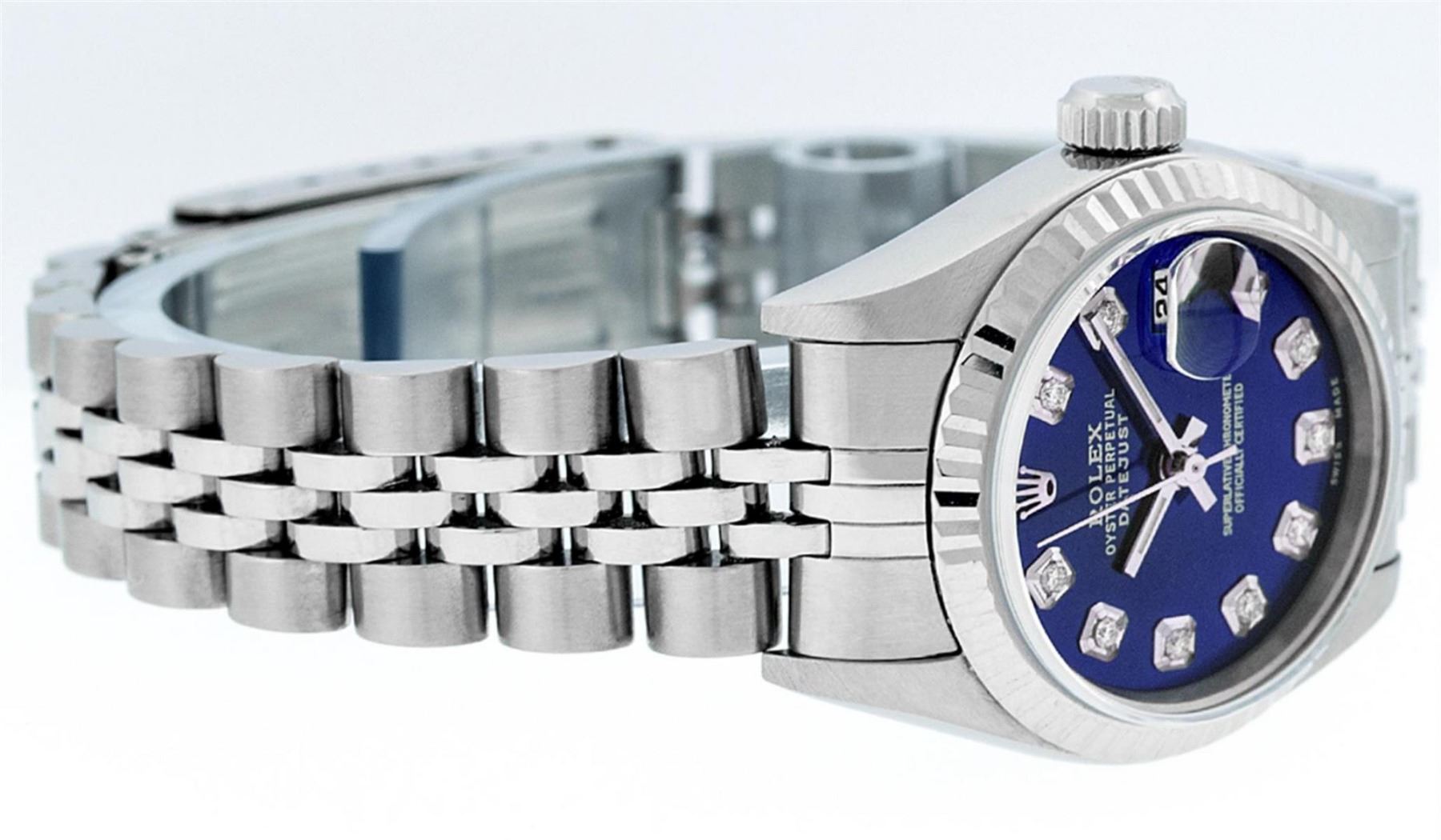 One Rolex Ladies Quickset Stainless Steel Oyster Perpetual Datejust Polished Bright with Satin Finish, Serviced & Electronically Tested, Stainless Steel Case: 26mm, Stainless Steel Crown, Bezel: Original 18K White Gold Fluted Bezel. Custom Crystal: New Scratch Resistant Sapphire Cyclops Lens. Custom Hands: New Luminescent Hands. Movement: Automatic Winding Movement Caliber 2235. Custom Dial: Refinished Blue Diamond Dial, Diamond Count: 10 Diamonds In Dial, Color: G to H, Clarity: SI1 Date Window: 3 O'Clock Position Date Display, Model: Quickset Datejust 79174. Condition: G-6 Extra Fine. Bracelet: Stainless Steel Jubilee Band. Bright Polish & Satin Finish. 6.0 Inch Length, Adjustable. Standard Clasp, With Rolex Logo. This Watch Has Been Serviced Time Tested And Is In Excellent Condition It Is Free Of All Scratches And Dents.