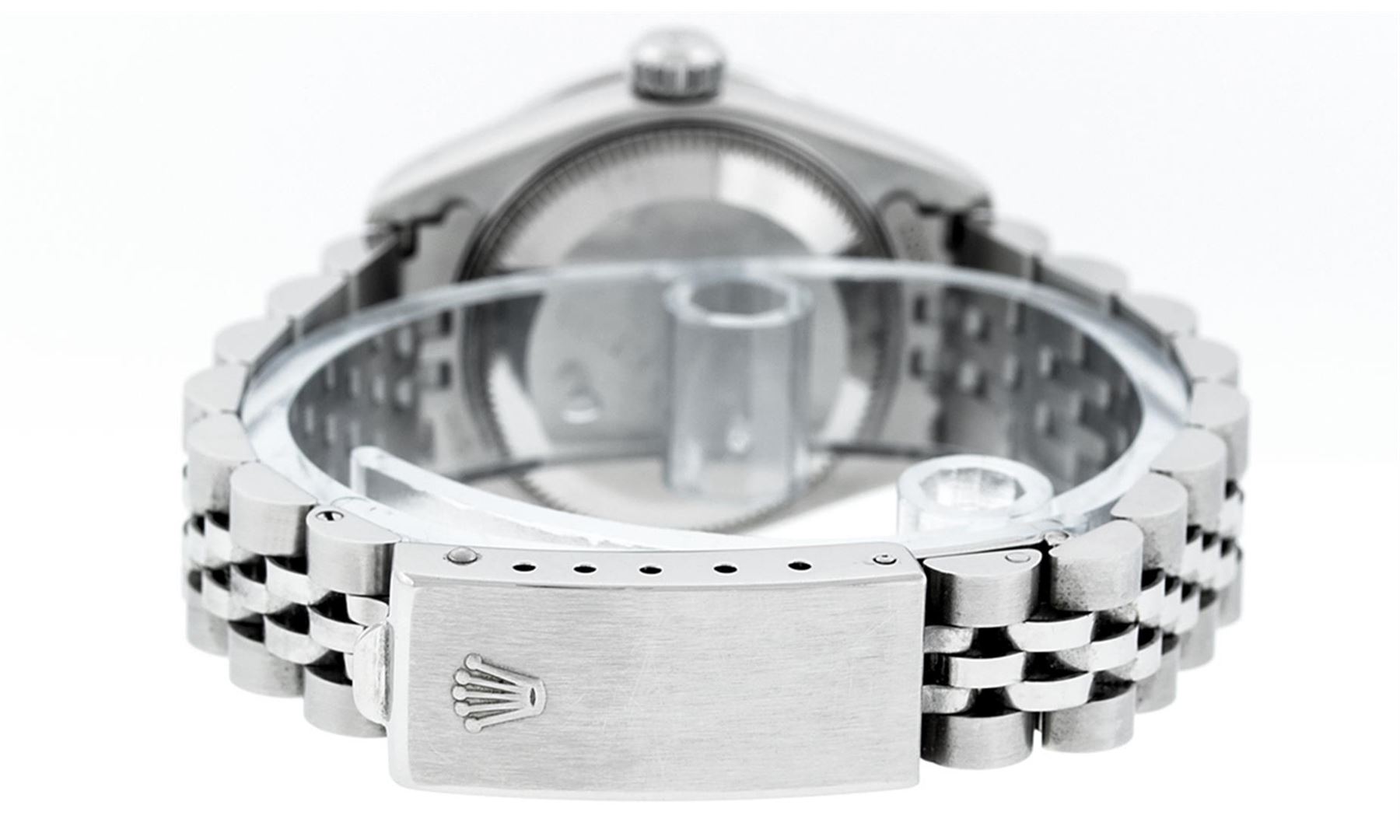 One Rolex Ladies Quickset Stainless Steel Oyster Perpetual Datejust Polished Bright with Satin Finish, Serviced & Electronically Tested, Stainless Steel Case: 26mm, Stainless Steel Crown, Bezel: Original 18K White Gold Fluted Bezel. Custom Crystal: New Scratch Resistant Sapphire Cyclops Lens. Custom Hands: New Luminescent Hands. Movement: Automatic Winding Movement Caliber 2235. Custom Dial: Refinished Blue Diamond Dial, Diamond Count: 10 Diamonds In Dial, Color: G to H, Clarity: SI1 Date Window: 3 O'Clock Position Date Display, Model: Quickset Datejust 79174. Condition: G-6 Extra Fine. Bracelet: Stainless Steel Jubilee Band. Bright Polish & Satin Finish. 6.0 Inch Length, Adjustable. Standard Clasp, With Rolex Logo. This Watch Has Been Serviced Time Tested And Is In Excellent Condition It Is Free Of All Scratches And Dents.