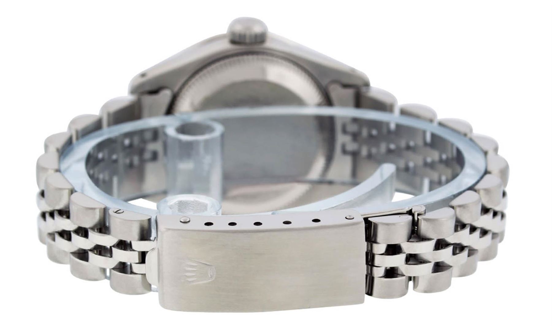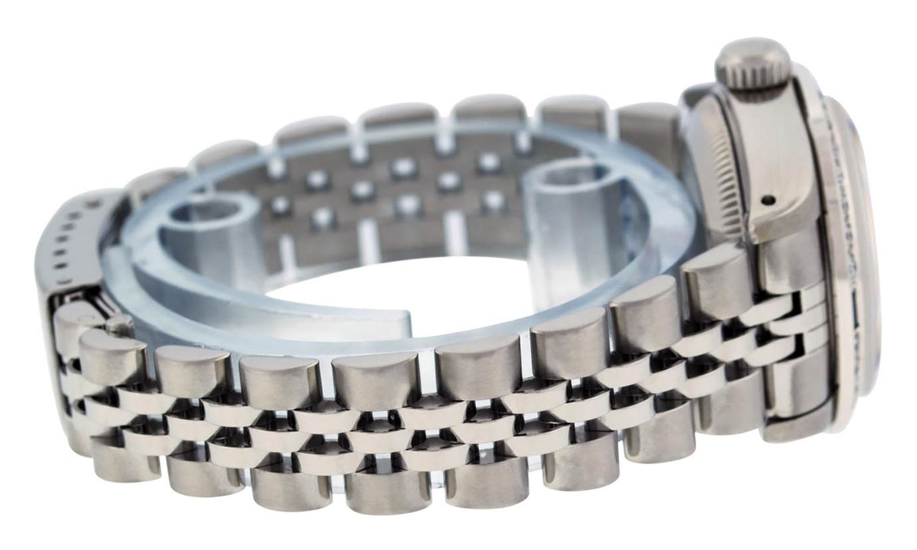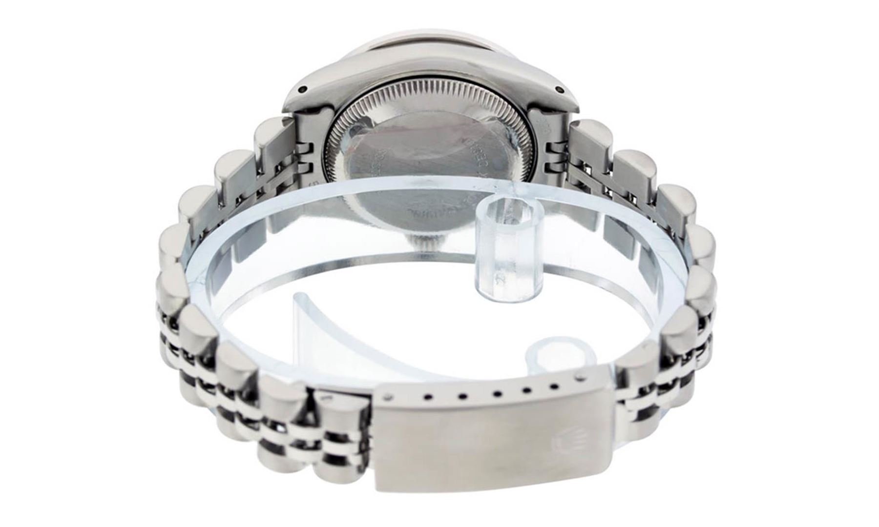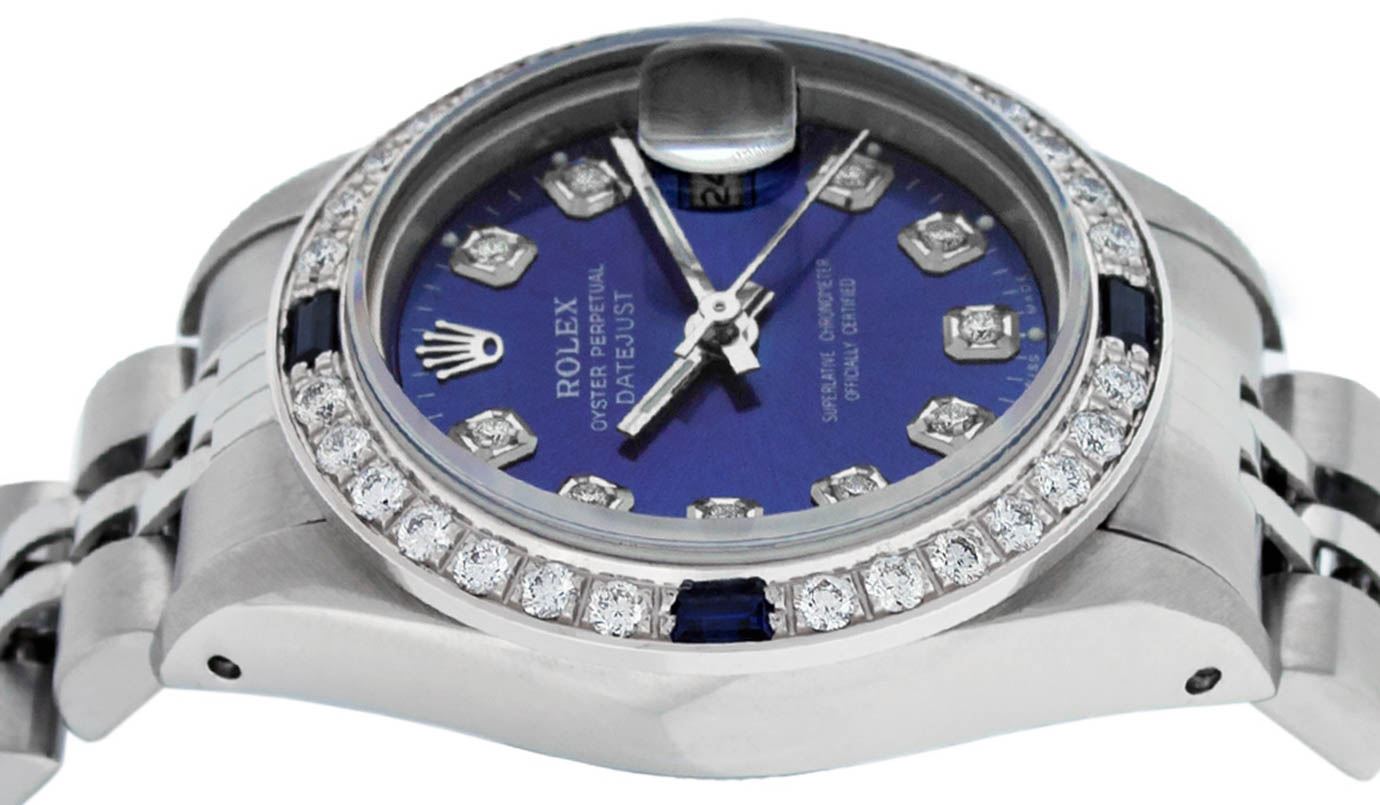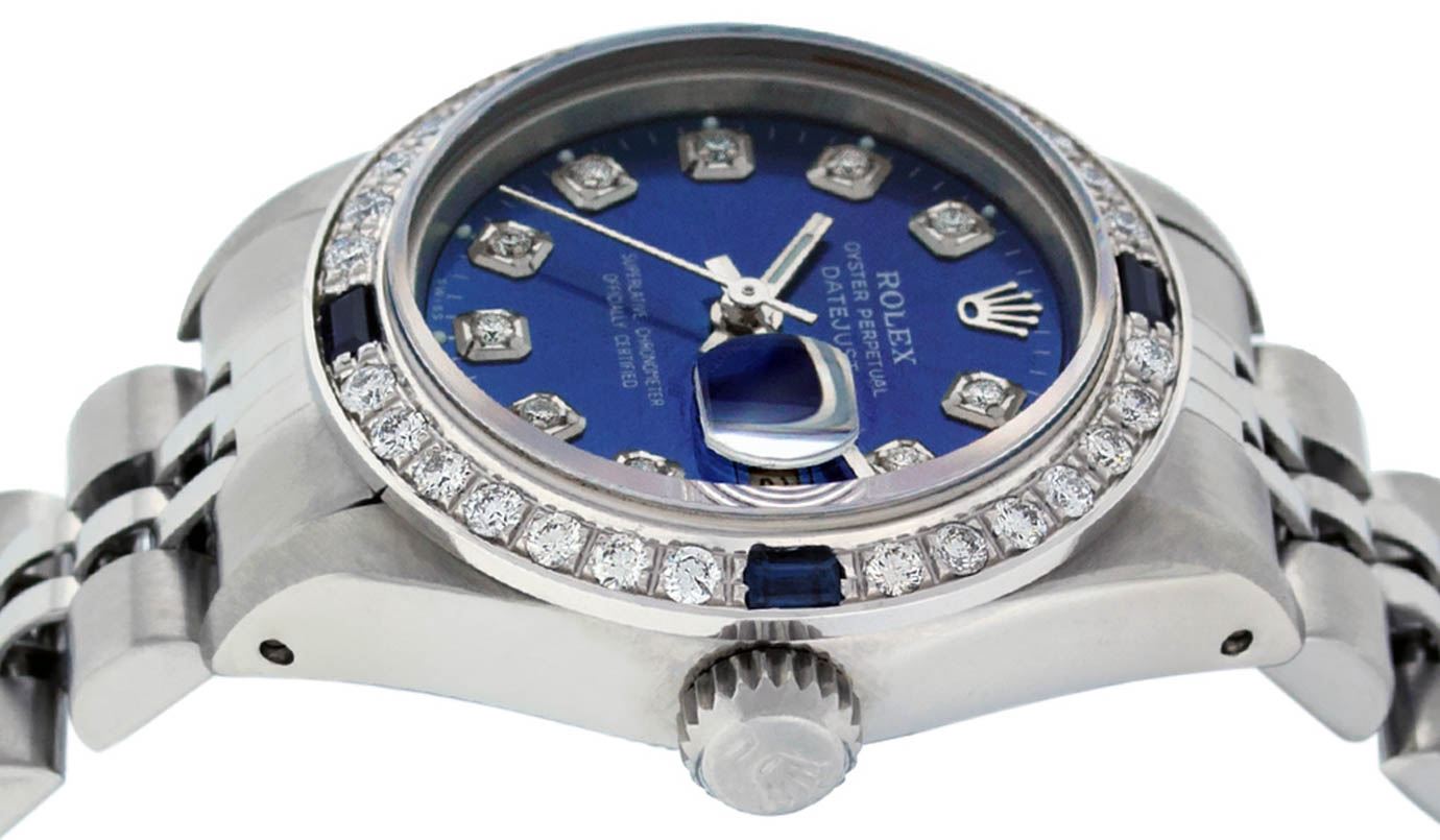 One Ladies Stainless Steel Rolex Datejust Polished Bright with Satin Finish, Serviced & Electronically Tested, Stainless Steel Case: 26mm, Stainless Steel Crown, Custom Bezel: New 18K White Gold Sapphire Beadset Diamond Bezel, Diamond + Gem Count: 28 Diamonds + 4 Sapphires Total Weight .70 Carat, Clarity: SI-VS, Color: G to H. Custom Crystal: New Synthetic Sapphire Cyclops Lens. Custom Hands: New Luminescent Hands. Movement: Automatic Winding Movement. Custom Dial: Refinished Blue With Diamond Hour Markers, 10 Diamond in Dial G To H In Color, Clarity: SI-VS. Date Window: 3 O'Clock Position Date Display, Model: Datejust. Condition: G-6 Extra Fine. Bracelet: Stainless Steel Jubilee. Bright Polish & Satin Finish. 6.0 Inch Length, Adjustable. Standard Clasp, With Rolex Logo. This Watch Has Been Serviced Time Tested And Is In Excellent Condition It Is Free Of All Scratches And Dents.