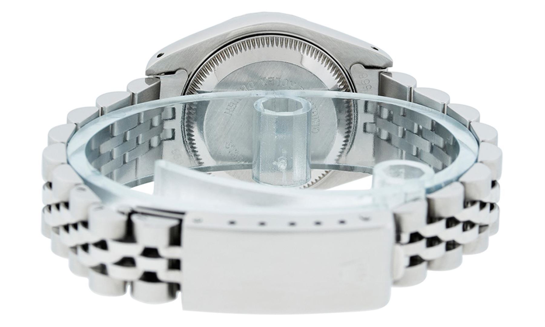 One Ladies Quickset Stainless Steel Rolex Datejust Polished Bright with Satin Finish, Serviced & Electronically Tested, Stainless Steel Case: 26mm, Stainless Steel Crown, Bezel: Stainless Steel Engine Turn Bezel. Custom Crystal: New Scratch Resistant Sapphire Cyclops Lens. Custom Hands: New Luminescent Hands. Movement: Automatic Winding Movement Caliber 2235. Custom Dial: Blue Index Dial With Luminescent Dots & Dash Track. Date Window: 3 O'Clock Position Date Display, Model: 79160 Quickset Datejust. Condition: G-6 Extra Fine. Bracelet: Stainless Steel Jubilee Band. Bright Polish & Satin Finish. 6.0 Inch Length, Adjustable. Standard Clasp, With Rolex Logo. This Watch Has Been Serviced Time Tested And Is In Excellent Condition It Is Free Of All Scratches And Dents.