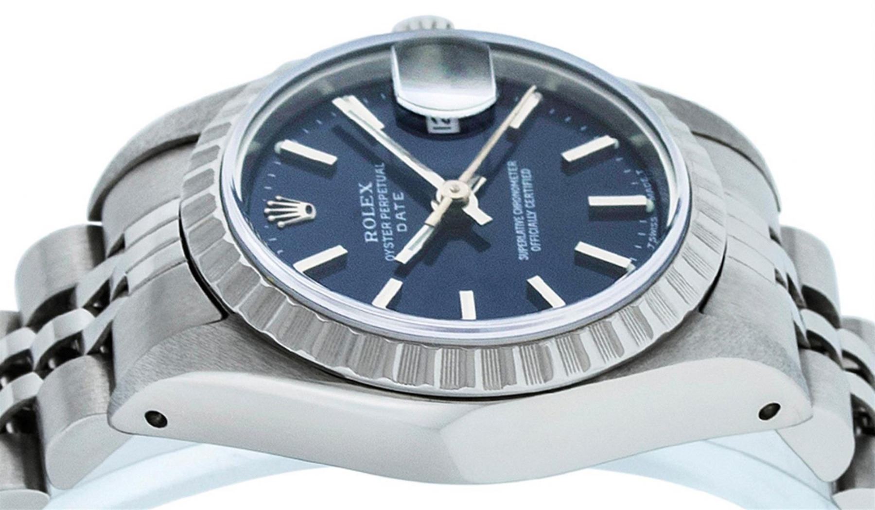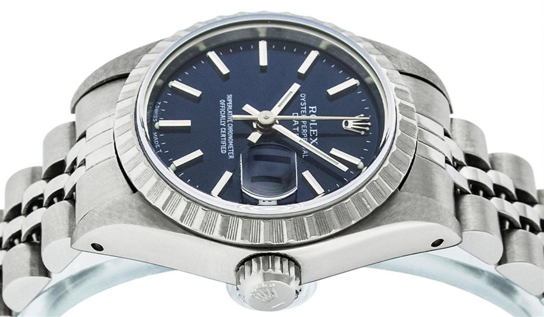 One Ladies Quickset Stainless Steel Rolex Datejust Polished Bright with Satin Finish, Serviced & Electronically Tested, Stainless Steel Case: 26mm, Stainless Steel Crown, Bezel: Stainless Steel Engine Turn Bezel. Custom Crystal: New Scratch Resistant Sapphire Cyclops Lens. Custom Hands: New Luminescent Hands. Movement: Automatic Winding Movement Caliber 2235. Custom Dial: Blue Index Dial With Luminescent Dots & Dash Track. Date Window: 3 O'Clock Position Date Display, Model: 79160 Quickset Datejust. Condition: G-6 Extra Fine. Bracelet: Stainless Steel Jubilee Band. Bright Polish & Satin Finish. 6.0 Inch Length, Adjustable. Standard Clasp, With Rolex Logo. This Watch Has Been Serviced Time Tested And Is In Excellent Condition It Is Free Of All Scratches And Dents.