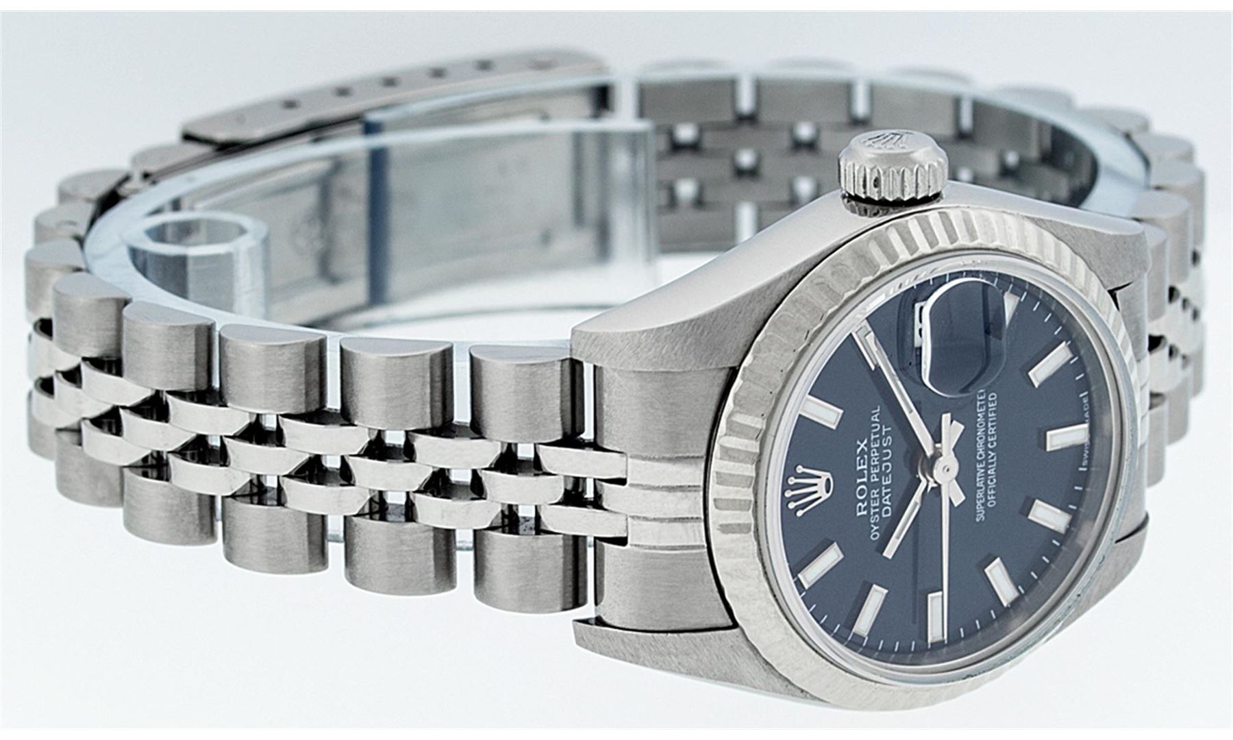 One Ladies Quickset Stainless Steel Rolex Datejust Polished Bright with Satin Finish, Serviced & Electronically Tested, Stainless Steel Case: 26mm, Stainless Steel Crown, Bezel: 18K White Gold Fluted Bezel. Custom Crystal: New Scratch Resistant Sapphire Cyclops Lens. Custom Hands: New Luminescent Hands. Movement: Automatic Winding Movement. Custom Dial: Blue Index Dial. Date Window: 3 O'Clock Position Date Display, Model: Quickset Datejust. Condition: G-6 Extra Fine. Bracelet: Stainless Steel Jubilee Band. Bright Polish & Satin Finish. 6.0 Inch Length, Adjustable. Standard Clasp, With Rolex Logo. This Watch Has Been Serviced Time Tested And Is In Excellent Condition It Is Free Of All Scratches And Dents.