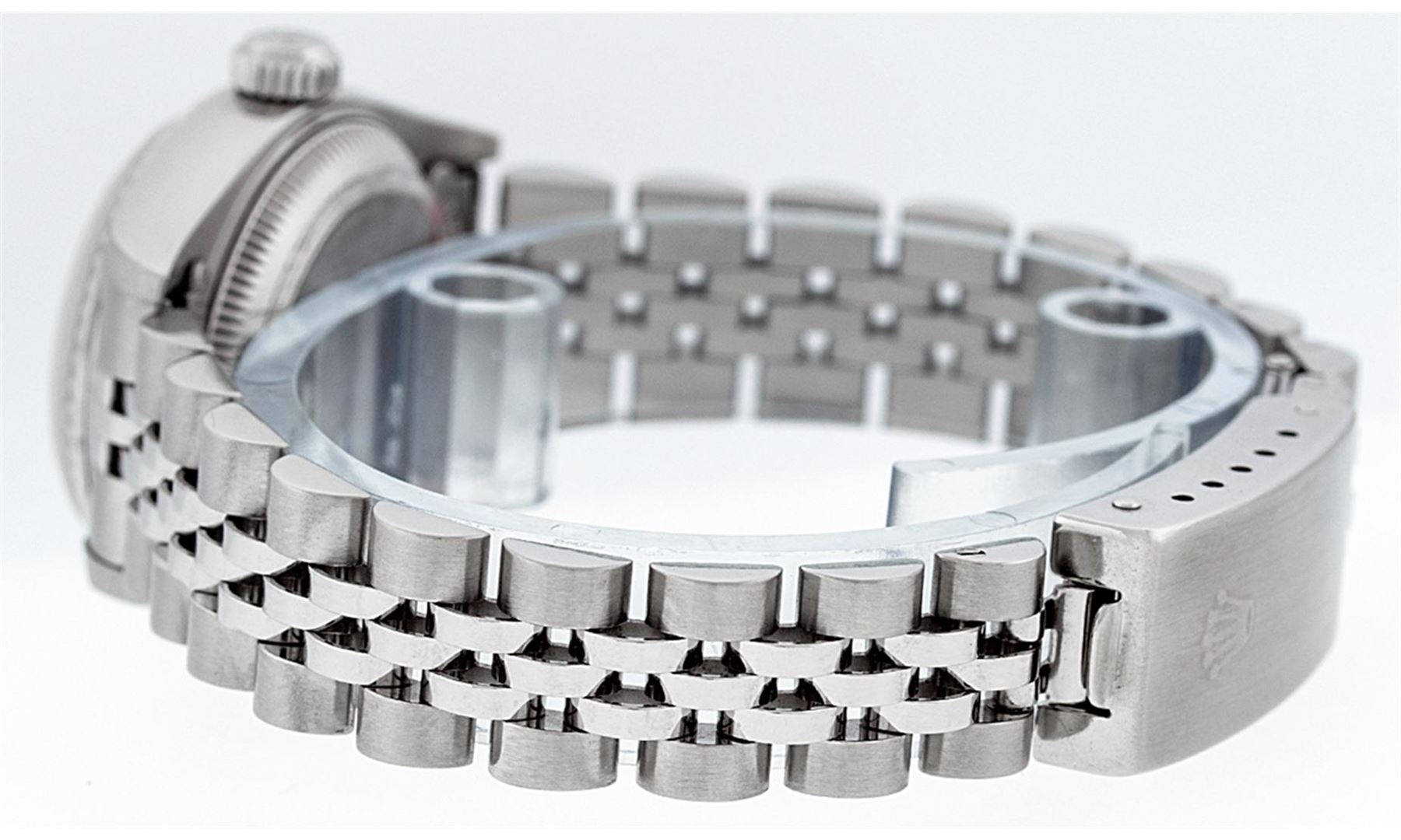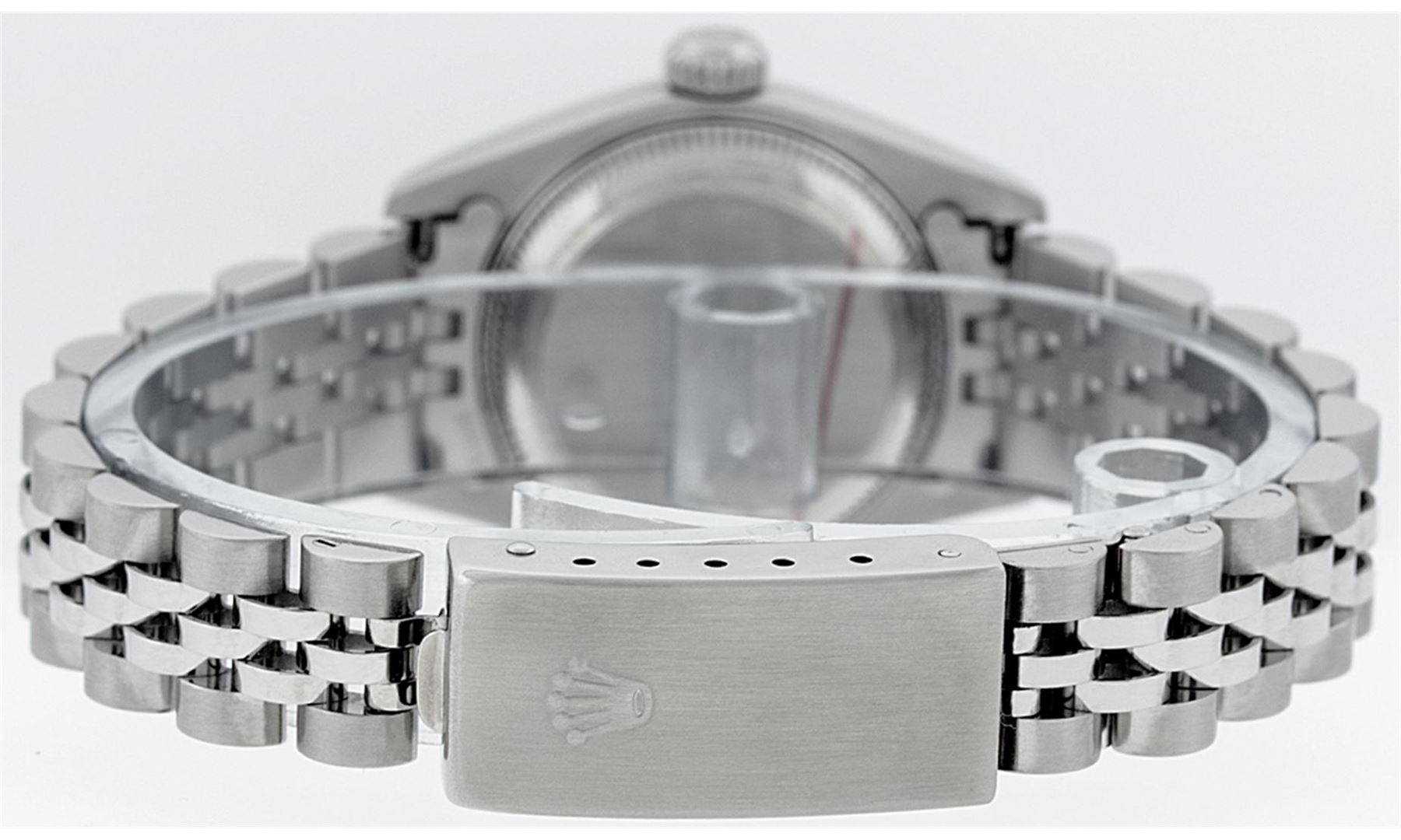 One Ladies Quickset Stainless Steel Rolex Datejust Polished Bright with Satin Finish, Serviced & Electronically Tested, Stainless Steel Case: 26mm, Stainless Steel Crown, Bezel: 18K White Gold Fluted Bezel. Custom Crystal: New Scratch Resistant Sapphire Cyclops Lens. Custom Hands: New Luminescent Hands. Movement: Automatic Winding Movement. Custom Dial: Blue Index Dial. Date Window: 3 O'Clock Position Date Display, Model: Quickset Datejust. Condition: G-6 Extra Fine. Bracelet: Stainless Steel Jubilee Band. Bright Polish & Satin Finish. 6.0 Inch Length, Adjustable. Standard Clasp, With Rolex Logo. This Watch Has Been Serviced Time Tested And Is In Excellent Condition It Is Free Of All Scratches And Dents.