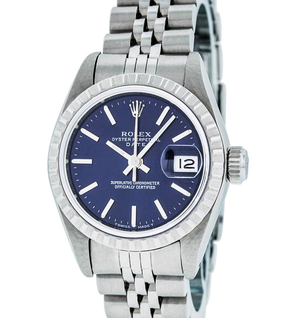 One Ladies Pre Owned Quickset Stainless Steel Rolex Date Polished Bright with Satin Finish, Serviced & Electronically Tested, Rolex Stainless Steel Case: 26mm, Rolex Stainless Steel Crown, Rolex Bezel: Stainless Steel Engine Turn Bezel. Crystal: Sapphire With Magnified Date Window. Hands: Luminescent Hands. Rolex Movement: Automatic Winding Movement 2230. Rolex Dial: Blue Index Dial With Luminescent Dots & Dash Track. Date Window: 3 O'Clock Position Date Display, Model: Sapphire Quickset Date Caliber 2230. Condition: G-6 Extra Fine. Rolex Bracelet: Stainless Steel Jubilee Band. Bright Polish & Satin Finish. 6.0 Inch Length, Adjustable. Standard Clasp, With Rolex Logo. This Watch Has Been Serviced Time Tested And Is In Excellent Condition It Is Free Of All Scratches And Dents.