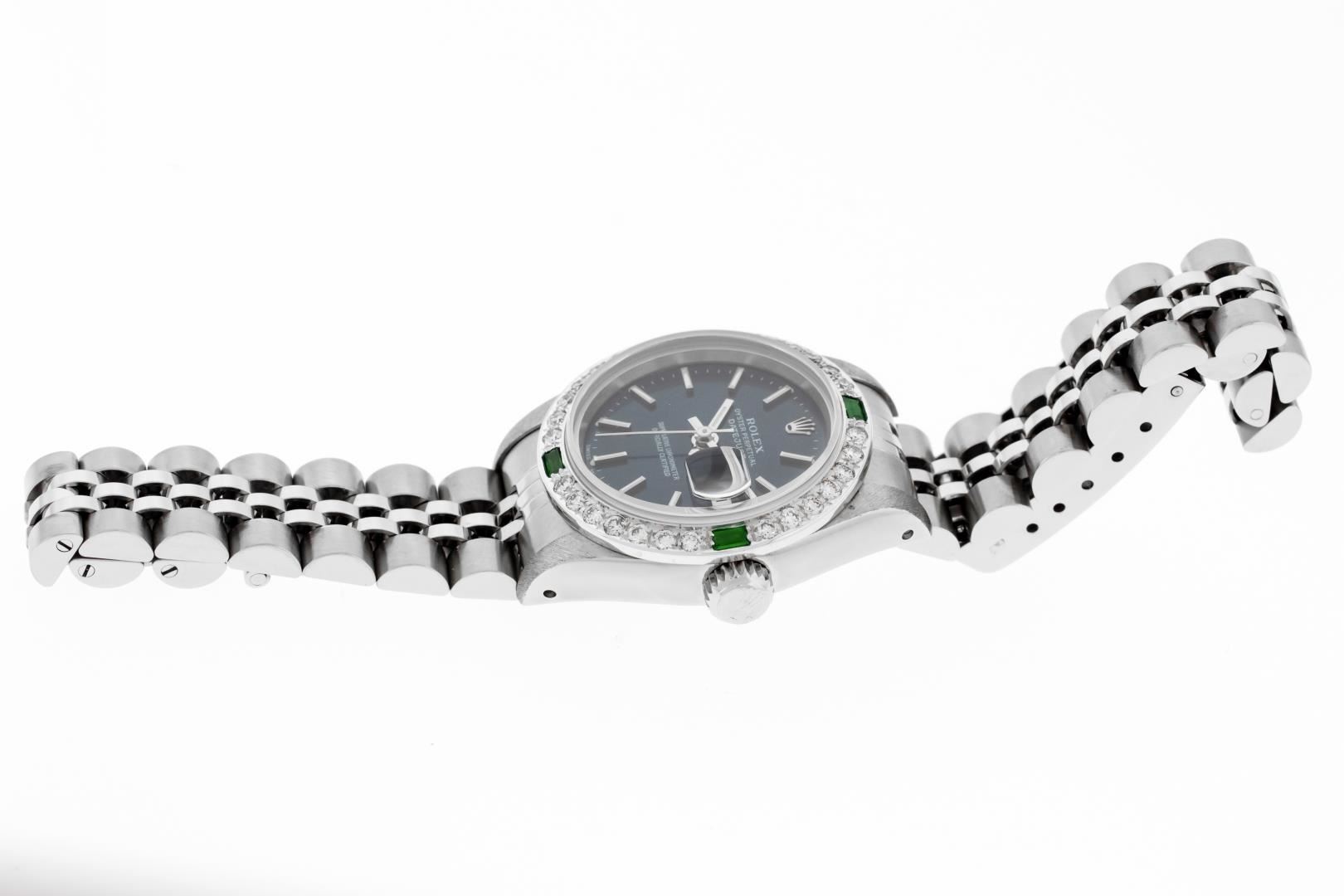 One Ladies Pre Owned Quickset Stainless Steel Rolex Datejust Polished Bright with Satin Finish Serviced & Electronically Tested, Rolex Stainless Steel Case: 26mm, Rolex Stainless Steel Crown, Custom Bezel: New White Gold Beadset + Emerald Diamond Bezel, Diamond Count: 28 Diamonds + 4 Emeralds. Custom Crystal: New Sapphire With Date Window. Custom Hands: New Luminescent Hands. Rolex Movement: Automatic Winding Movement. Rolex Dial: Blue Index Dial With Dash Track. Date Window: 3 O'Clock Position Date Display, Model: Datejust. Condition: G-6 Extra Fine. Rolex Bracelet: Stainless Steel Jubilee Band With Rolex Crown On Buckle. Bright Polish & Satin Finish. Band Length: 6.0 Inch Length, Adjustable. Standard Clasp, With Rolex Logo. This Watch Has Been Serviced Time Tested And Is In Excellent Condition It Is Free Of All Scratches And Dents.