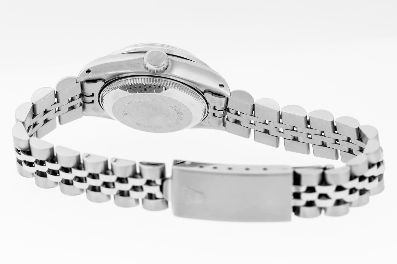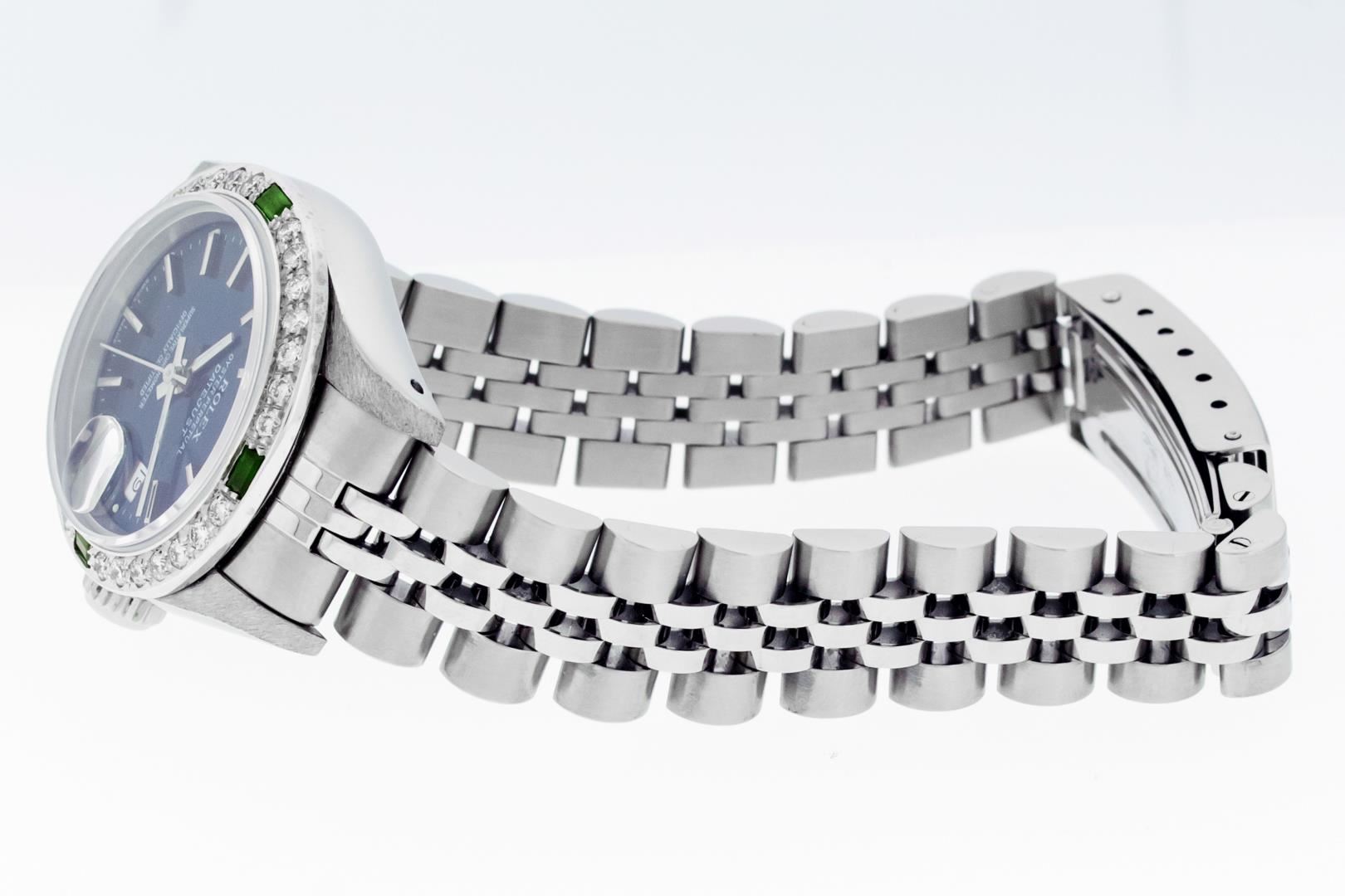 One Ladies Pre Owned Quickset Stainless Steel Rolex Datejust Polished Bright with Satin Finish Serviced & Electronically Tested, Rolex Stainless Steel Case: 26mm, Rolex Stainless Steel Crown, Custom Bezel: New White Gold Beadset + Emerald Diamond Bezel, Diamond Count: 28 Diamonds + 4 Emeralds. Custom Crystal: New Sapphire With Date Window. Custom Hands: New Luminescent Hands. Rolex Movement: Automatic Winding Movement. Rolex Dial: Blue Index Dial With Dash Track. Date Window: 3 O'Clock Position Date Display, Model: Datejust. Condition: G-6 Extra Fine. Rolex Bracelet: Stainless Steel Jubilee Band With Rolex Crown On Buckle. Bright Polish & Satin Finish. Band Length: 6.0 Inch Length, Adjustable. Standard Clasp, With Rolex Logo. This Watch Has Been Serviced Time Tested And Is In Excellent Condition It Is Free Of All Scratches And Dents.