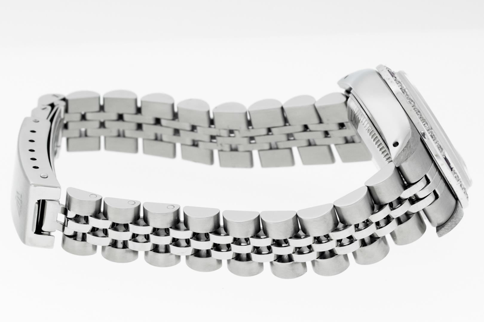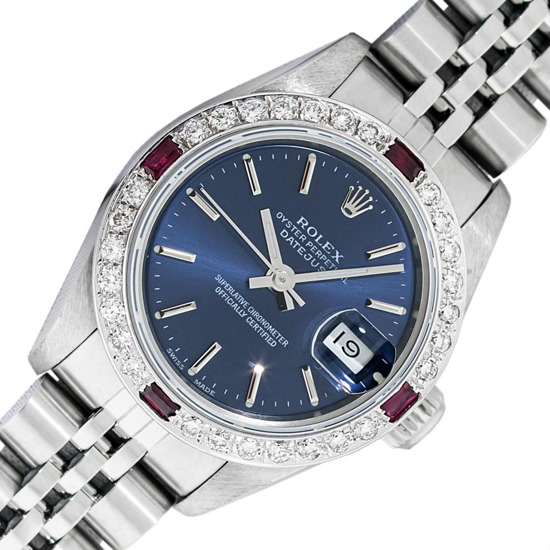 One Ladies Pre Owned Quickset Stainless Steel Rolex Datejust Polished Bright with Satin Finish Serviced & Electronically Tested, Rolex Stainless Steel Case: 26mm, Rolex Stainless Steel Crown, Custom Bezel: New White Gold Beadset + Ruby Diamond Bezel, Diamond Count: 28 Diamonds + 4 Rubies. Custom Crystal: New Sapphire With Date Window. Custom Hands: New Luminescent Hands. Rolex Movement: Automatic Winding Movement. Rolex Dial: Blue Index Dial With Dash Track. Date Window: 3 O'Clock Position Date Display, Model: Datejust. Condition: G-6 Extra Fine. Rolex Bracelet: Stainless Steel Jubilee Band With Rolex Crown On Buckle. Bright Polish & Satin Finish. Band Length: 6.0 Inch Length, Adjustable. Standard Clasp, With Rolex Logo. This Watch Has Been Serviced Time Tested And Is In Excellent Condition It Is Free Of All Scratches And Dents.