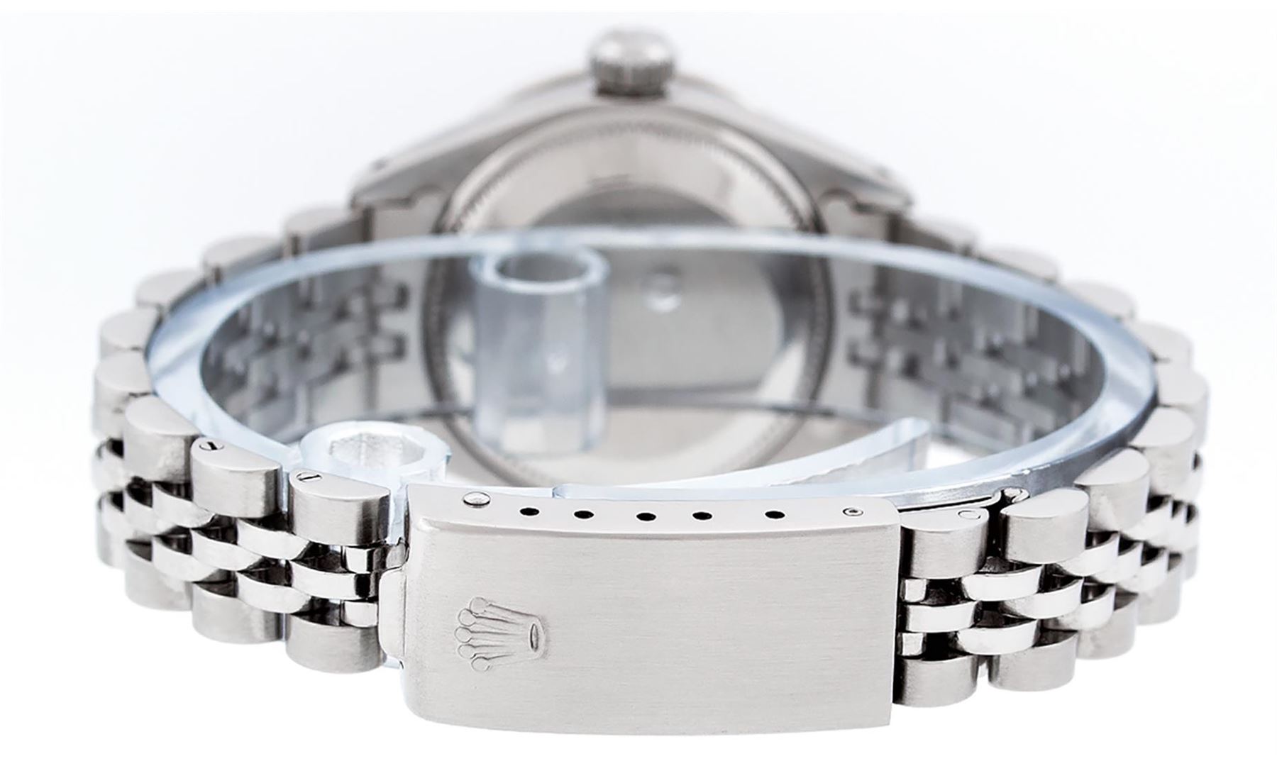 One Ladies Stainless Steel Rolex Datejust Polished Bright with Satin Finish, Serviced & Electronically Tested, Stainless Steel Case: 26mm, Stainless Steel Crown, Custom Bezel: New 18K White Gold Ruby Beadset Diamond Bezel, Diamond + Gem Count: 28 Diamonds + 4 Rubies. Total Weight .70 Carat, Clarity: SI-VS, Color: G to H. Custom Crystal: New Scratch Resistant Synthetic Sapphire Cyclops Lens. Custom Hands: New Luminescent Hands. Movement: Automatic Winding Movement. Custom Dial: Refinished Blue Mother Of Pearl With Diamond Hour Markers, 10 Diamonds in Dial, G To H In Color, Clarity: SI-VS. Date Window: 3 O'Clock Position Date Display, Model: Datejust. Condition: G-6 Extra Fine. Bracelet: Stainless Steel Jubilee Band. Bright Polish & Satin Finish. 6.0 Inch Length, Adjustable. Standard Clasp, With Rolex Logo. This Watch Has Been Serviced Time Tested And Is In Excellent Condition It Is Free Of All Scratches And Dents.