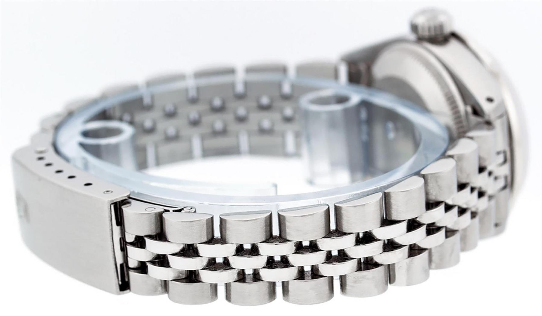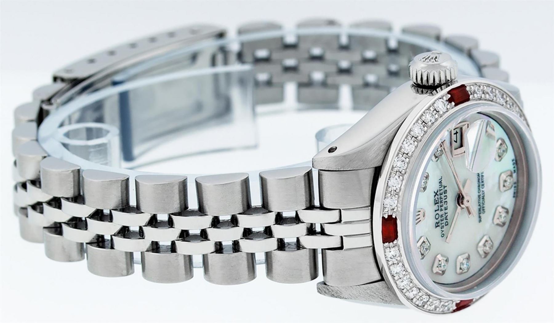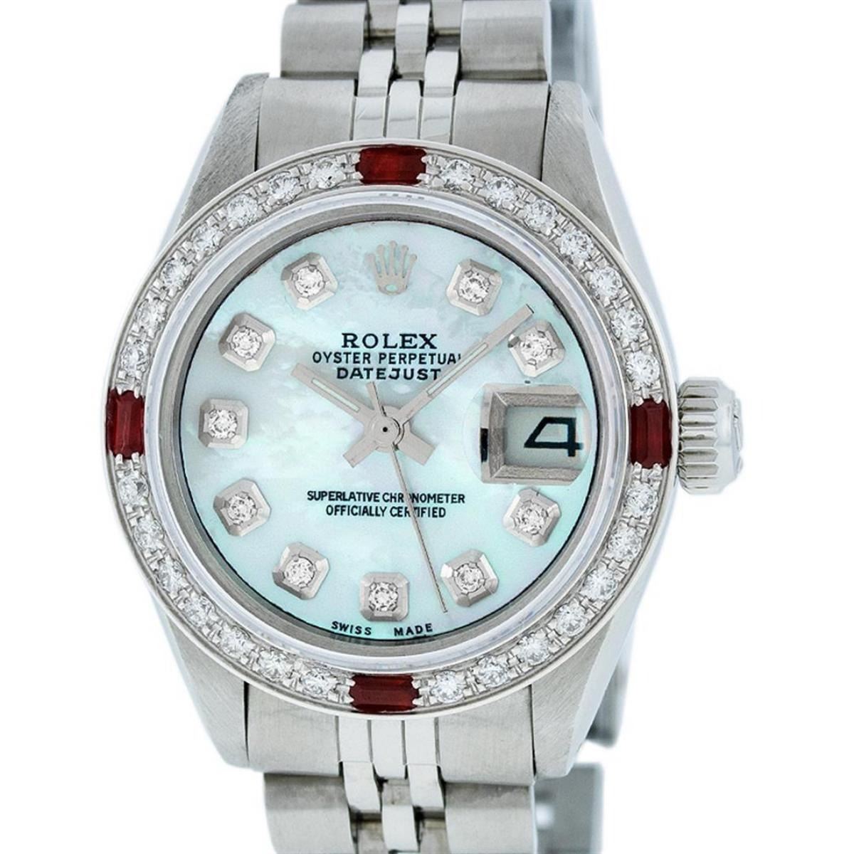 One Ladies Stainless Steel Rolex Datejust Polished Bright with Satin Finish, Serviced & Electronically Tested, Stainless Steel Case: 26mm, Stainless Steel Crown, Custom Bezel: New 18K White Gold Ruby Beadset Diamond Bezel, Diamond + Gem Count: 28 Diamonds + 4 Rubies. Total Weight .70 Carat, Clarity: SI-VS, Color: G to H. Custom Crystal: New Scratch Resistant Synthetic Sapphire Cyclops Lens. Custom Hands: New Luminescent Hands. Movement: Automatic Winding Movement. Custom Dial: Refinished Blue Mother Of Pearl With Diamond Hour Markers, 10 Diamonds in Dial, G To H In Color, Clarity: SI-VS. Date Window: 3 O'Clock Position Date Display, Model: Datejust. Condition: G-6 Extra Fine. Bracelet: Stainless Steel Jubilee Band. Bright Polish & Satin Finish. 6.0 Inch Length, Adjustable. Standard Clasp, With Rolex Logo. This Watch Has Been Serviced Time Tested And Is In Excellent Condition It Is Free Of All Scratches And Dents.