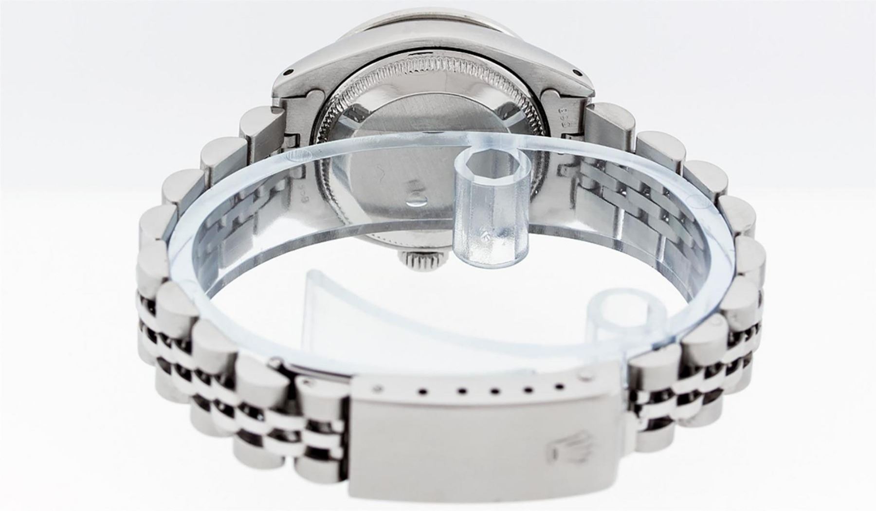 One Ladies Stainless Steel Rolex Datejust Polished Bright with Satin Finish, Serviced & Electronically Tested, Stainless Steel Case: 26mm, Stainless Steel Crown, Custom Bezel: New 18K White Gold Ruby Beadset Diamond Bezel, Diamond + Gem Count: 28 Diamonds + 4 Rubies. Total Weight .70 Carat, Clarity: SI-VS, Color: G to H. Custom Crystal: New Scratch Resistant Synthetic Sapphire Cyclops Lens. Custom Hands: New Luminescent Hands. Movement: Automatic Winding Movement. Custom Dial: Refinished Blue Mother Of Pearl With Diamond Hour Markers, 10 Diamonds in Dial, G To H In Color, Clarity: SI-VS. Date Window: 3 O'Clock Position Date Display, Model: Datejust. Condition: G-6 Extra Fine. Bracelet: Stainless Steel Jubilee Band. Bright Polish & Satin Finish. 6.0 Inch Length, Adjustable. Standard Clasp, With Rolex Logo. This Watch Has Been Serviced Time Tested And Is In Excellent Condition It Is Free Of All Scratches And Dents.