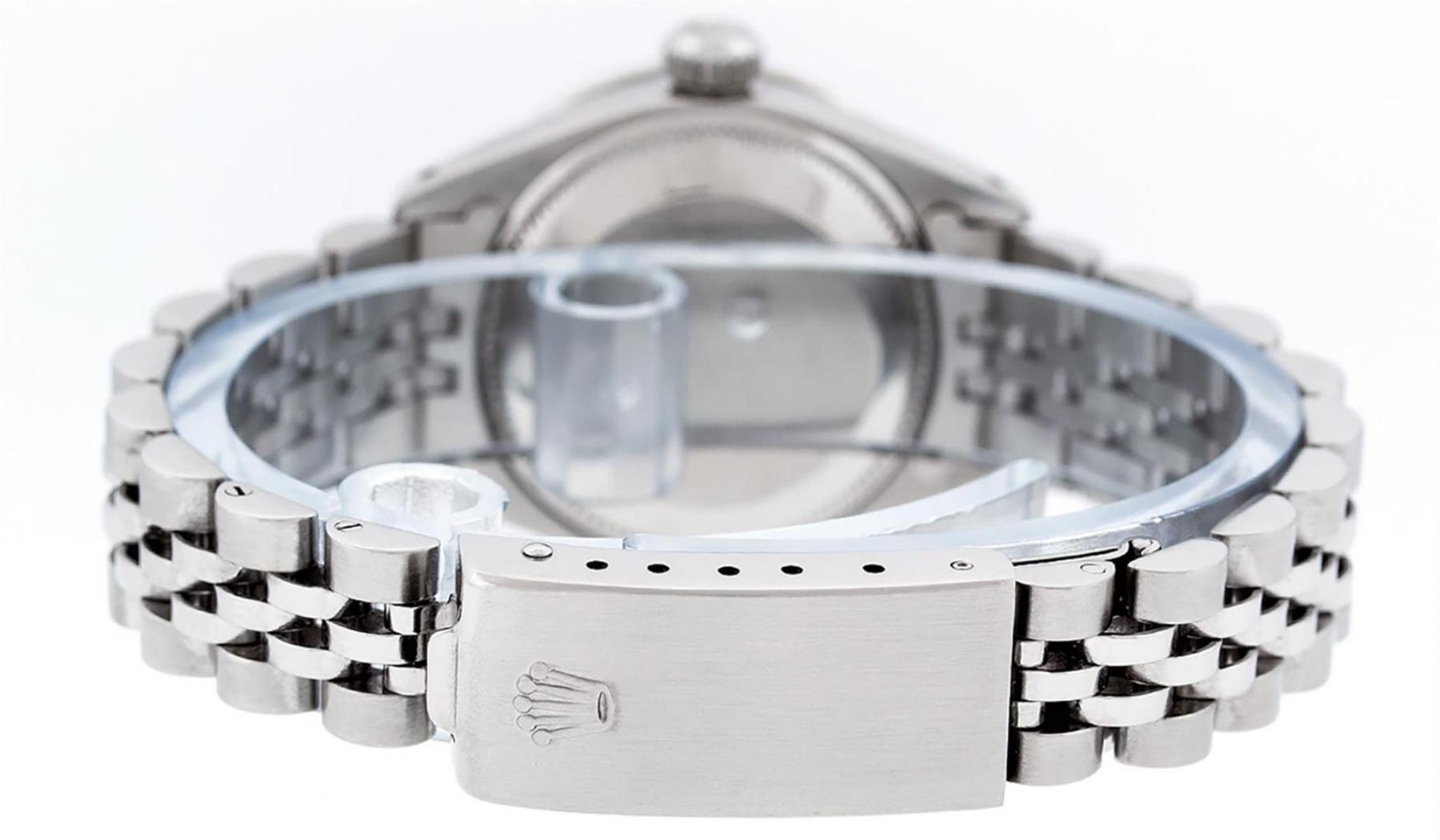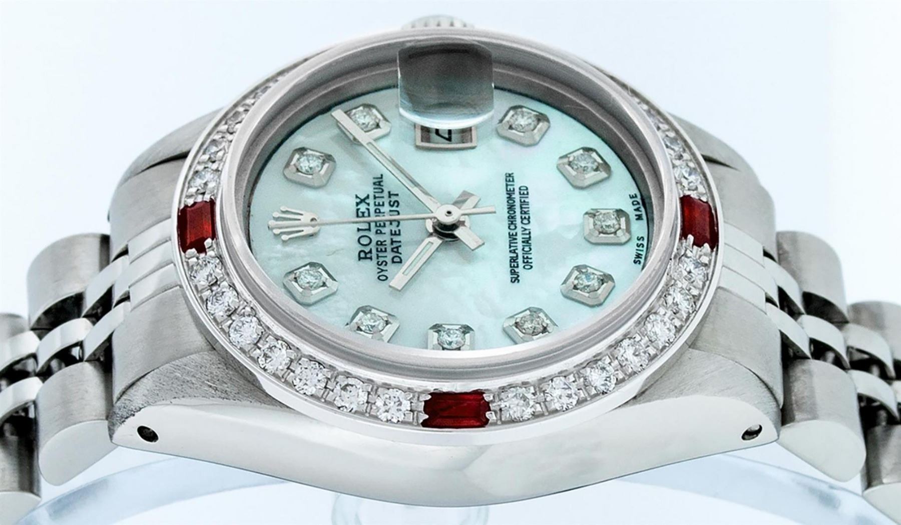 One Ladies Stainless Steel Rolex Datejust Polished Bright with Satin Finish, Serviced & Electronically Tested, Stainless Steel Case: 26mm, Stainless Steel Crown, Custom Bezel: New 18K White Gold Ruby Beadset Diamond Bezel, Diamond + Gem Count: 28 Diamonds + 4 Rubies. Total Weight .70 Carat, Clarity: SI-VS, Color: G to H. Custom Crystal: New Scratch Resistant Synthetic Sapphire Cyclops Lens. Custom Hands: New Luminescent Hands. Movement: Automatic Winding Movement. Custom Dial: Refinished Blue Mother Of Pearl With Diamond Hour Markers, 10 Diamonds in Dial, G To H In Color, Clarity: SI-VS. Date Window: 3 O'Clock Position Date Display, Model: Datejust. Condition: G-6 Extra Fine. Bracelet: Stainless Steel Jubilee Band. Bright Polish & Satin Finish. 6.0 Inch Length, Adjustable. Standard Clasp, With Rolex Logo. This Watch Has Been Serviced Time Tested And Is In Excellent Condition It Is Free Of All Scratches And Dents.