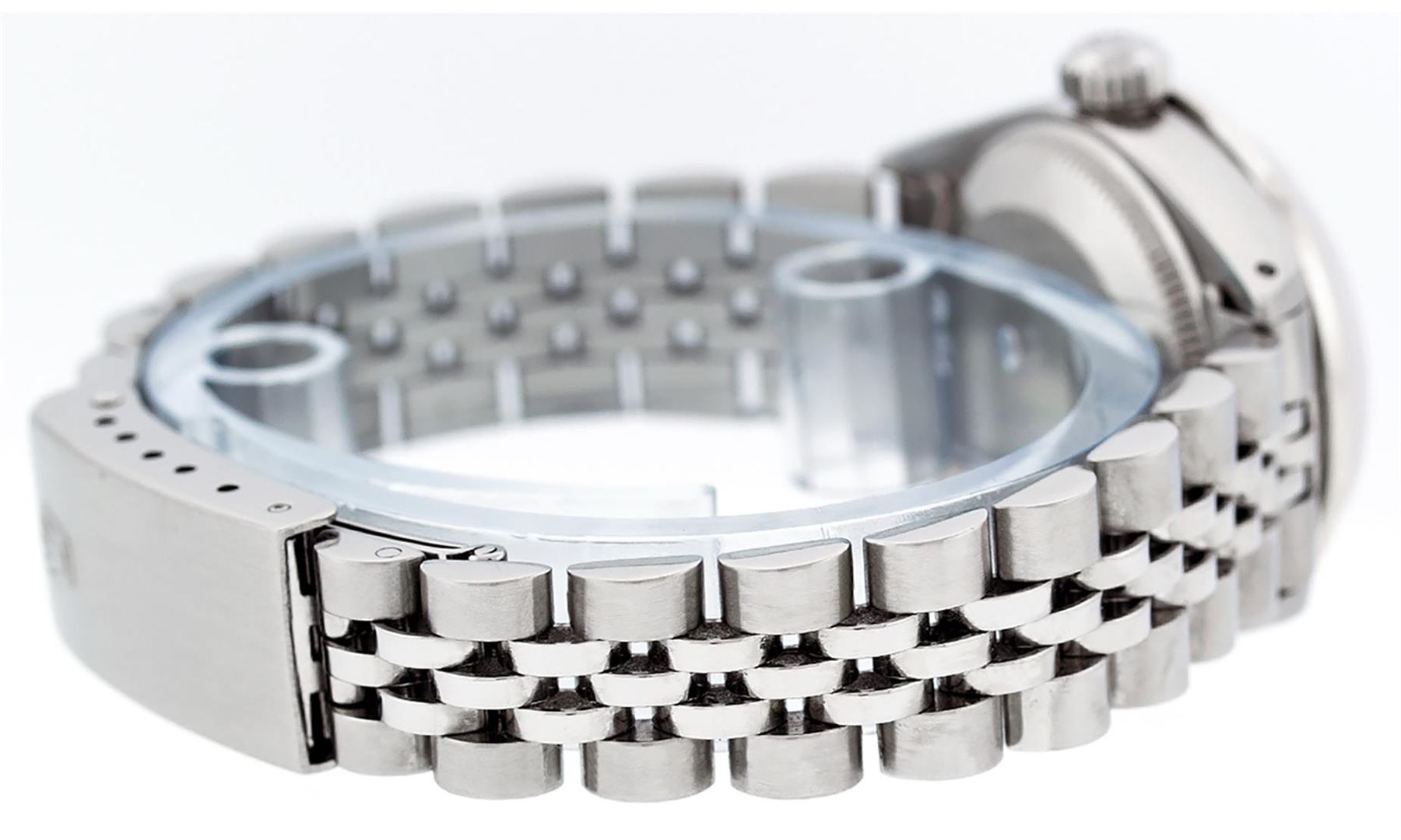 One Ladies Stainless Steel Rolex Datejust Polished Bright with Satin Finish, Serviced & Electronically Tested, Stainless Steel Case: 26mm, Stainless Steel Crown, Custom Bezel: New 18K White Gold Ruby Beadset Diamond Bezel, Diamond + Gem Count: 28 Diamonds + 4 Rubies. Total Weight .70 Carat, Clarity: SI-VS, Color: G to H. Custom Crystal: New Scratch Resistant Synthetic Sapphire Cyclops Lens. Custom Hands: New Luminescent Hands. Movement: Automatic Winding Movement Caliber 2030. Custom Dial: Refinished Blue Mother Of Pearl With Diamond Hour Markers, 10 Diamonds in Dial, G To H In Color, Clarity: SI-VS. Date Window: 3 O'Clock Position Date Display, Model: Datejust. Condition: G-6 Extra Fine. Bracelet: Stainless Steel Jubilee. Bright Polish & Satin Finish. 6.0 Inch Length, Adjustable. Standard Clasp, With Rolex Logo. This Watch Has Been Serviced Time Tested And Is In Excellent Condition It Is Free Of All Scratches And Dents.