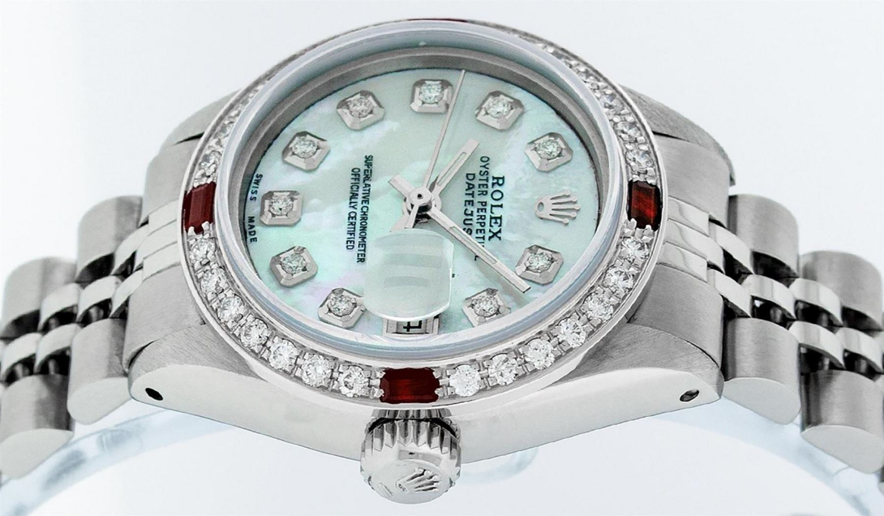 One Ladies Stainless Steel Rolex Datejust Polished Bright with Satin Finish, Serviced & Electronically Tested, Stainless Steel Case: 26mm, Stainless Steel Crown, Custom Bezel: New 18K White Gold Ruby Beadset Diamond Bezel, Diamond + Gem Count: 28 Diamonds + 4 Rubies. Total Weight .70 Carat, Clarity: SI-VS, Color: G to H. Custom Crystal: New Scratch Resistant Synthetic Sapphire Cyclops Lens. Custom Hands: New Luminescent Hands. Movement: Automatic Winding Movement Caliber 2030. Custom Dial: Refinished Blue Mother Of Pearl With Diamond Hour Markers, 10 Diamonds in Dial, G To H In Color, Clarity: SI-VS. Date Window: 3 O'Clock Position Date Display, Model: Datejust. Condition: G-6 Extra Fine. Bracelet: Stainless Steel Jubilee. Bright Polish & Satin Finish. 6.0 Inch Length, Adjustable. Standard Clasp, With Rolex Logo. This Watch Has Been Serviced Time Tested And Is In Excellent Condition It Is Free Of All Scratches And Dents.