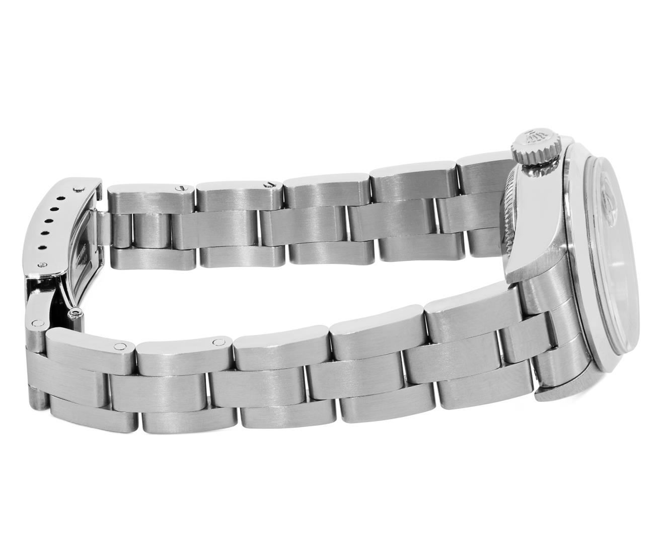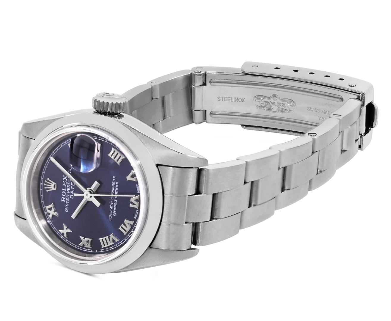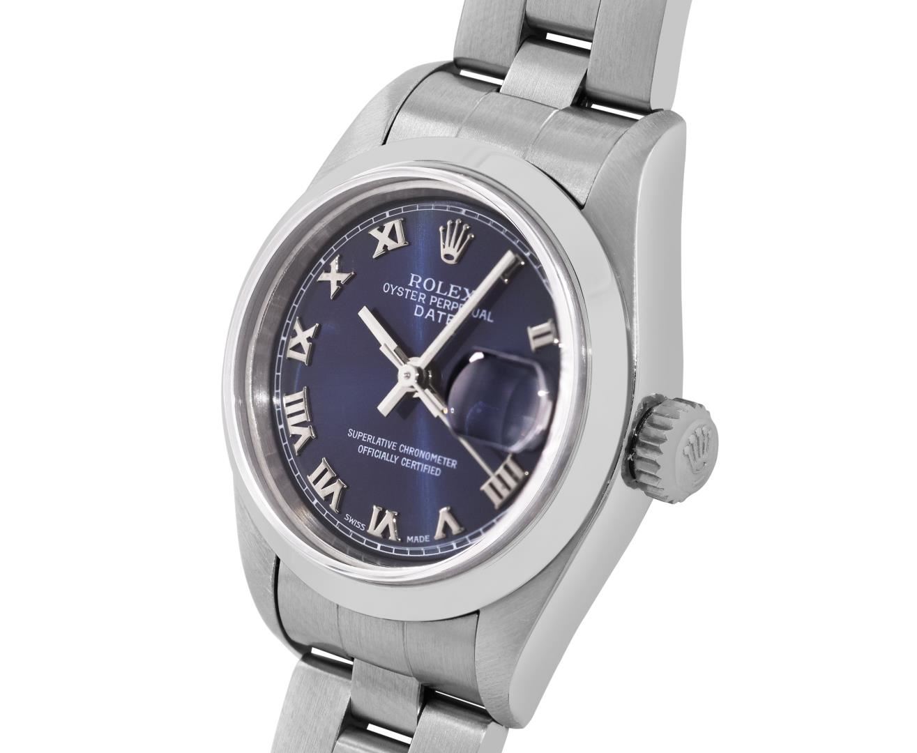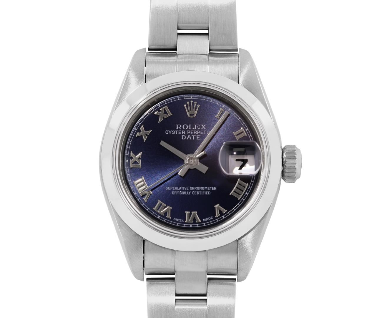 One Rolex Ladies Pre Owned Quickset Stainless Steel Date Wristwatch Polished Bright with Satin Finish, Serviced & Electronically Tested, Stainless Steel Case: 26mm, Stainless Steel Crown, Rolex Stainless Steel Smooth bezel. Crystal: Sapphire With Magnified Date Window. Hands: New Hands. Rolex Movement: 2235 Automatic Winding Movement. Rolex Dial: Factory Blue With Roman Hour Markers, Square Track. Date Window: 3 O'clock Position Date Display, Model: Quickset Date. Condition: G-6 Extra Fine. Rolex Bracelet: Stainless Steel Oyster Band. Bright Polish And Satin Finish. 6.0 Inch Length, Adjustable. Standard Clasp, With Rolex Logo. This Watch Has Been Serviced And Time Tested. It Is In Excellent Condition, Free Of All Scratches And Dents.