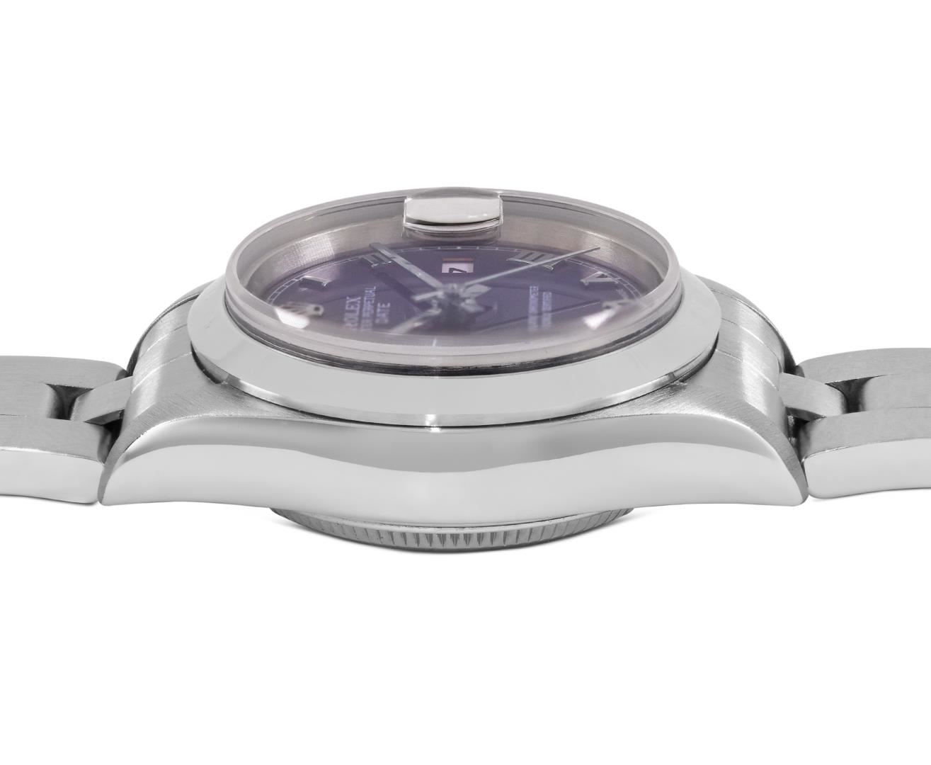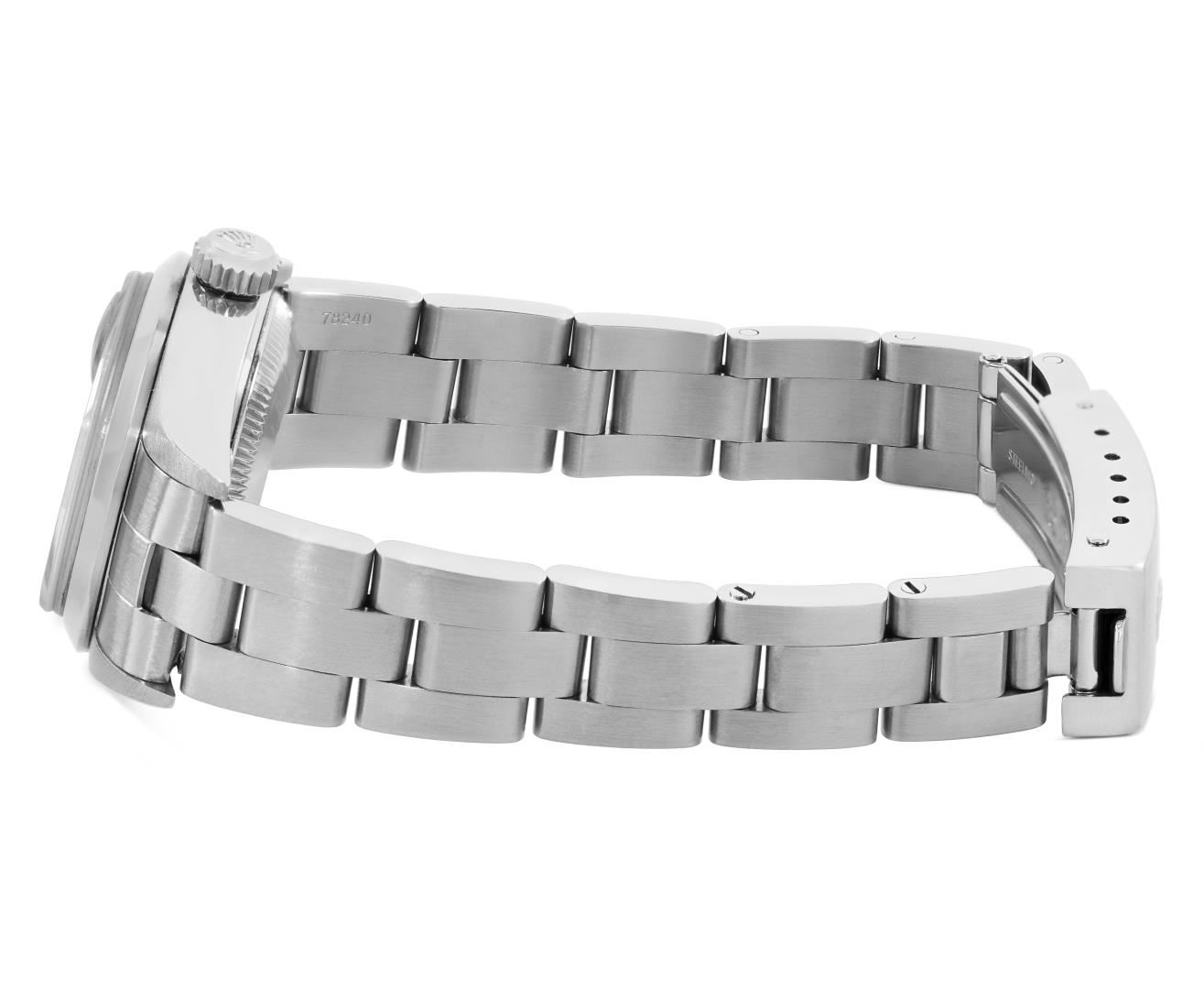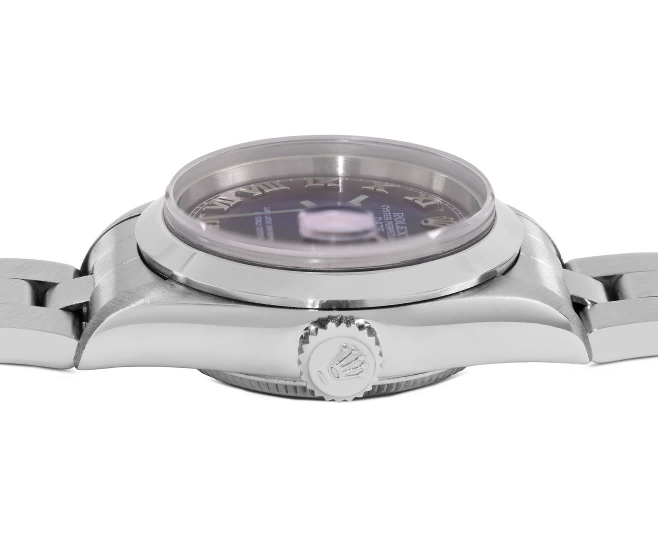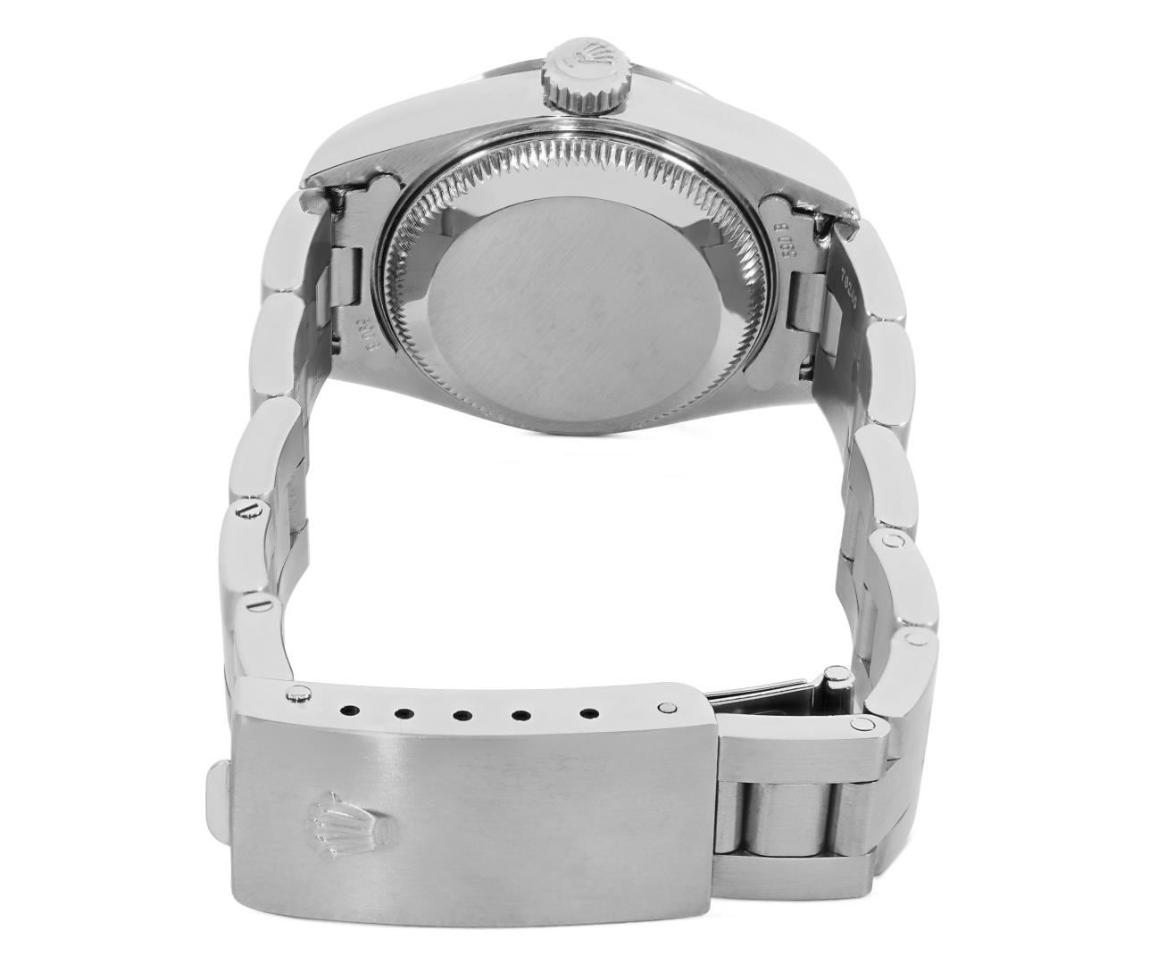 One Rolex Ladies Pre Owned Quickset Stainless Steel Date Wristwatch Polished Bright with Satin Finish, Serviced & Electronically Tested, Stainless Steel Case: 26mm, Stainless Steel Crown, Rolex Stainless Steel Smooth bezel. Crystal: Sapphire With Magnified Date Window. Hands: New Hands. Rolex Movement: 2235 Automatic Winding Movement. Rolex Dial: Factory Blue With Roman Hour Markers, Square Track. Date Window: 3 O'clock Position Date Display, Model: Quickset Date. Condition: G-6 Extra Fine. Rolex Bracelet: Stainless Steel Oyster Band. Bright Polish And Satin Finish. 6.0 Inch Length, Adjustable. Standard Clasp, With Rolex Logo. This Watch Has Been Serviced And Time Tested. It Is In Excellent Condition, Free Of All Scratches And Dents.