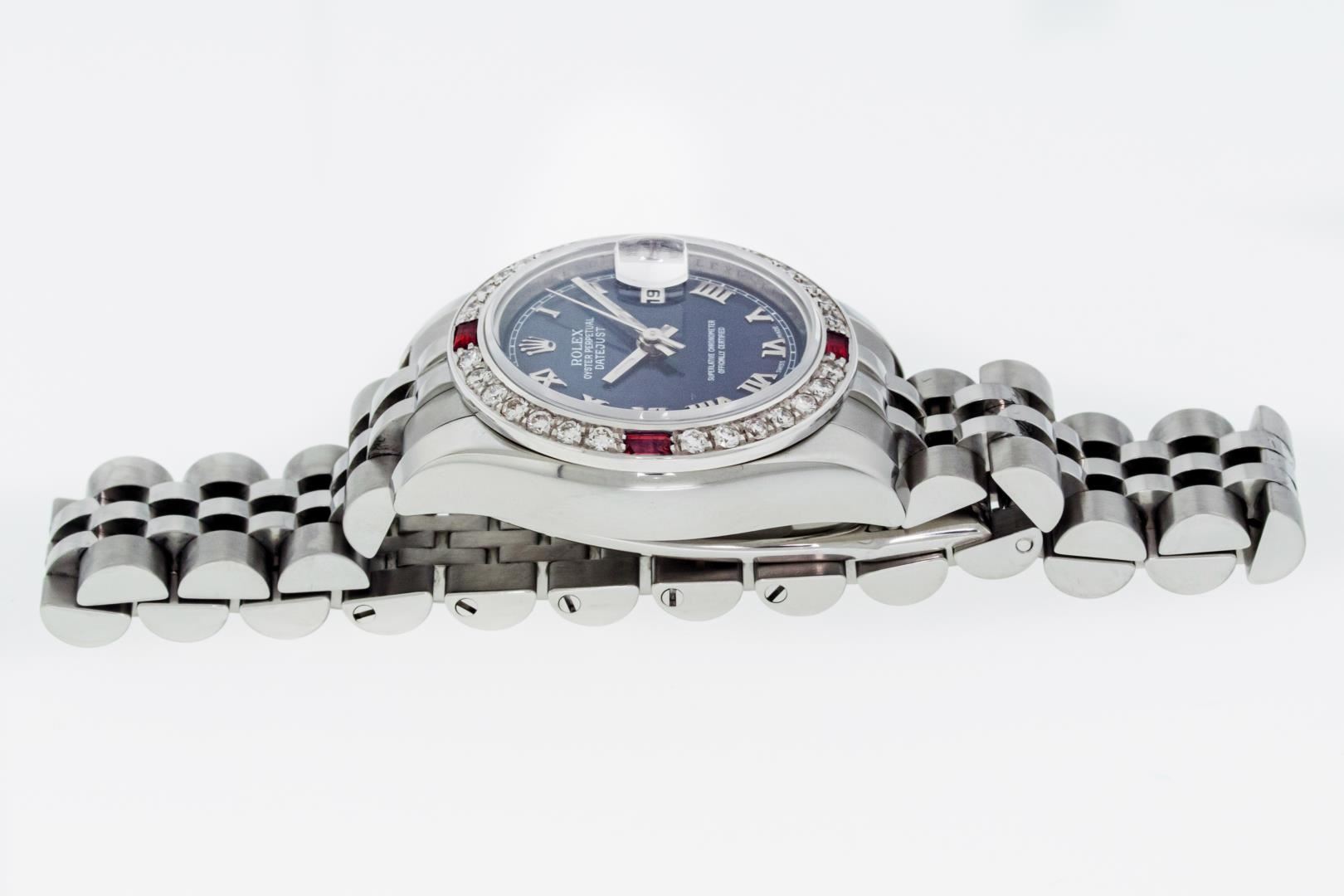 One Ladies Pre Owned Sapphire Quickset Stainless Steel Rolex Datejust Polished Bright with Satin Finish, Serviced & Electronically Tested, Rolex Stainless Steel Case: 26mm, Rolex Stainless Steel Crown, Custom Bezel: New 18K White Gold Diamond & Ruby Bezel, Stone Count: 28 Diamonds + 4 Rubies. Crystal: Sapphire With Magnified Date Window. Hands: Luminescent Hands. Rolex Movement: Automatic Winding Movement 2235. Rolex Dial: Blue Roman With Square Track. Date Window: 3 O'Clock Position Date Display, Model: Quickset Datejust. Condition: G-6 Extra Fine. Rolex Bracelet: Stainless Steel Jubilee Band. Bright Polish & Satin Finish. 6.0 Inch Length, Adjustable. Hidden Clap, With Rolex Logo. This Watch Has Been Serviced Time Tested And Is In Excellent Condition It Is Free Of All Scratches And Dents.