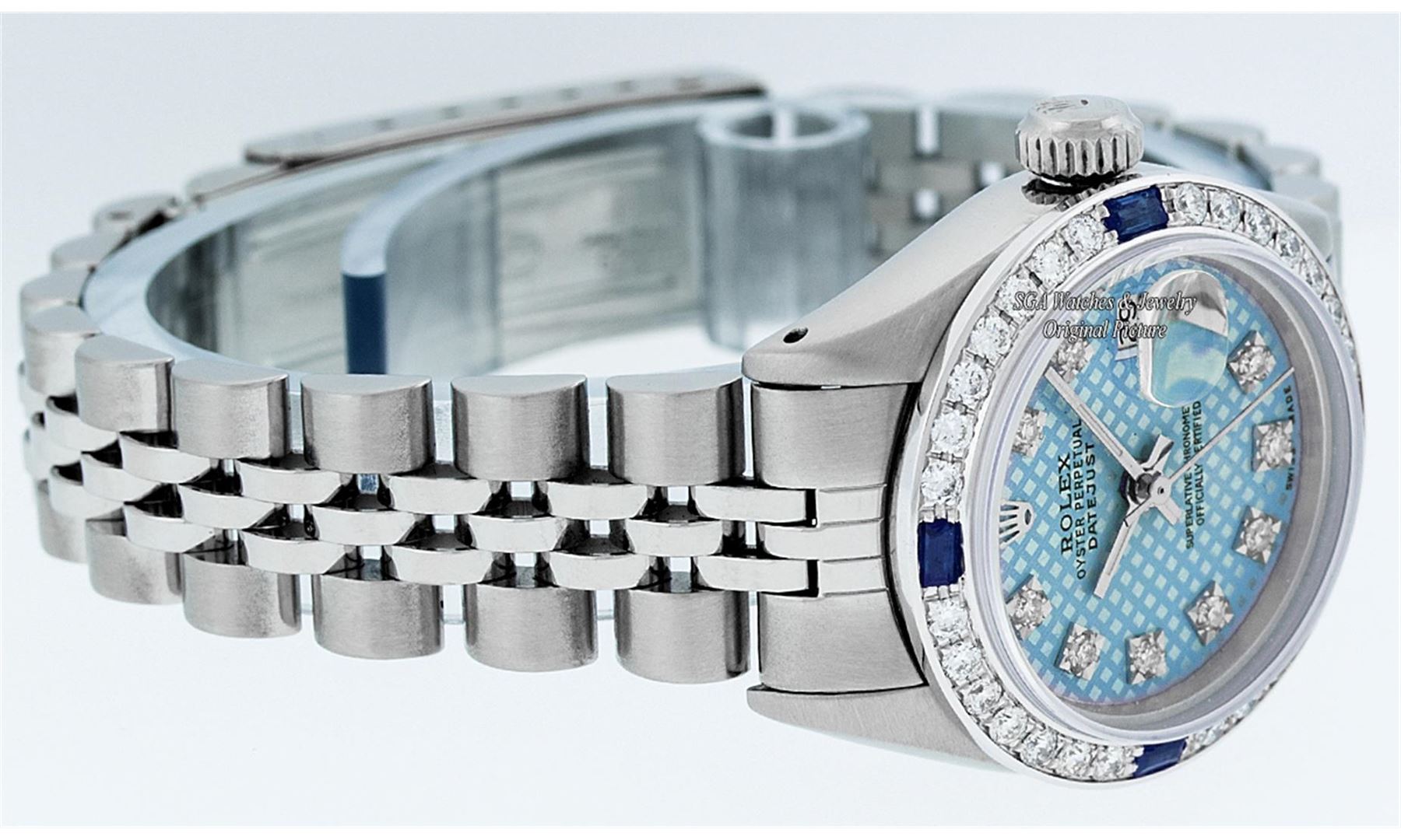 One Ladies Stainless Steel Rolex Datejust Polished Bright with Satin Finish, Serviced & Electronically Tested, Stainless Steel Case: 26mm, Stainless Steel Crown, Custom Bezel: New 18K White Sapphire Beadset Diamond Bezel, Diamond + Gem Count: 28 Diamonds + 4 Sapphires. Total Weight .70 Carat, Clarity: SI-VS, Color: G to H. Custom Crystal: New Scratch Resistant Synthetic Sapphire Cyclops Lens. Custom Hands: New Luminescent Hands. Movement: Automatic Winding Movement Caliber 2030. Custom Dial: Blue Stamp With Single Cut Diamond Hour Markers, 10 Diamonds in Dial, G To H In Color, Clarity: SI-VS. Date Window: 3 O'Clock Position Date Display, Model: Datejust. Condition: G-6 Extra Fine. Bracelet: Stainless Steel Jubilee Band. Bright Polish & Satin Finish. 6.0 Inch Length, Adjustable. Standard Clasp, With Rolex Logo. This Watch Has Been Serviced Time Tested And Is In Excellent Condition It Is Free Of All Scratches And Dents.