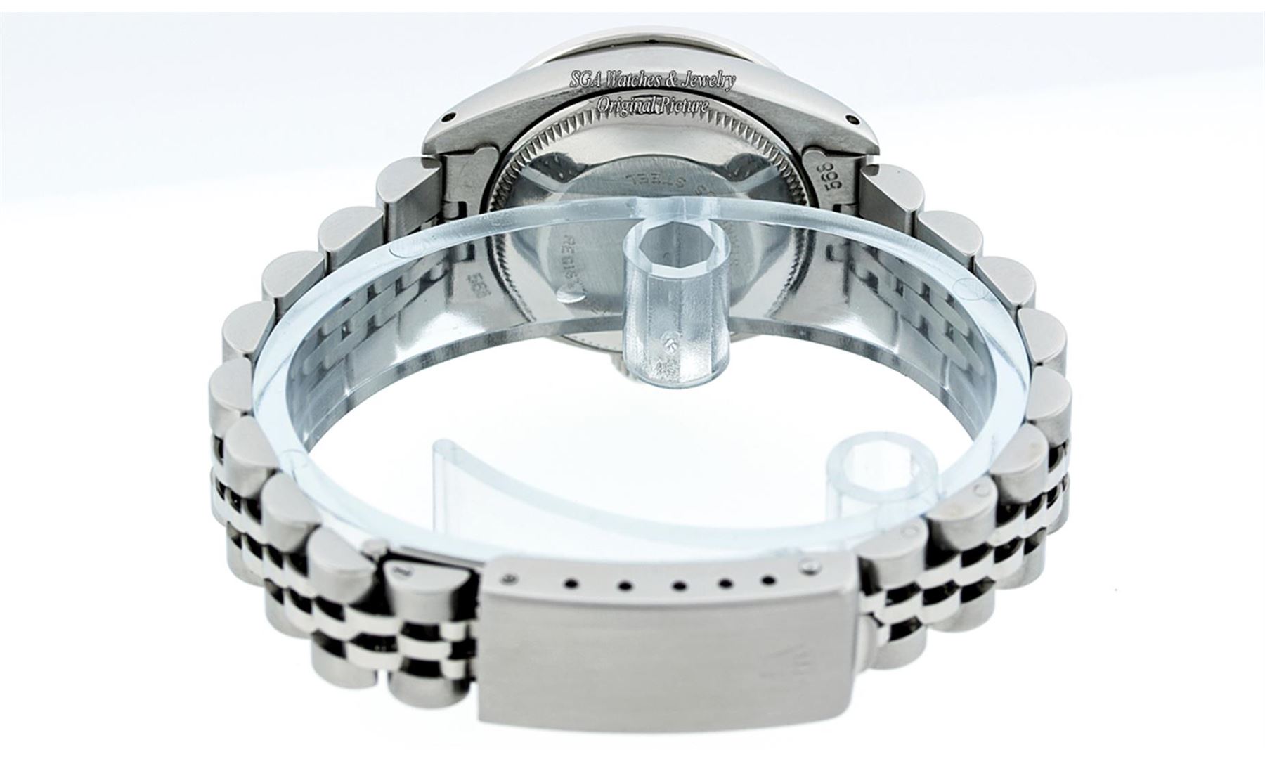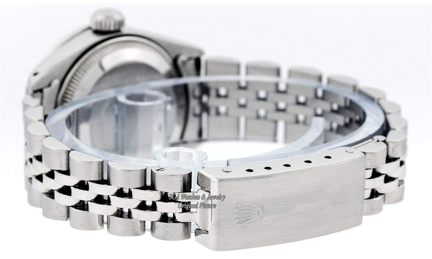 One Ladies Stainless Steel Rolex Datejust Polished Bright with Satin Finish, Serviced & Electronically Tested, Stainless Steel Case: 26mm, Stainless Steel Crown, Custom Bezel: New 18K White Sapphire Beadset Diamond Bezel, Diamond + Gem Count: 28 Diamonds + 4 Sapphires. Total Weight .70 Carat, Clarity: SI-VS, Color: G to H. Custom Crystal: New Scratch Resistant Synthetic Sapphire Cyclops Lens. Custom Hands: New Luminescent Hands. Movement: Automatic Winding Movement Caliber 2030. Custom Dial: Blue Stamp With Single Cut Diamond Hour Markers, 10 Diamonds in Dial, G To H In Color, Clarity: SI-VS. Date Window: 3 O'Clock Position Date Display, Model: Datejust. Condition: G-6 Extra Fine. Bracelet: Stainless Steel Jubilee Band. Bright Polish & Satin Finish. 6.0 Inch Length, Adjustable. Standard Clasp, With Rolex Logo. This Watch Has Been Serviced Time Tested And Is In Excellent Condition It Is Free Of All Scratches And Dents.