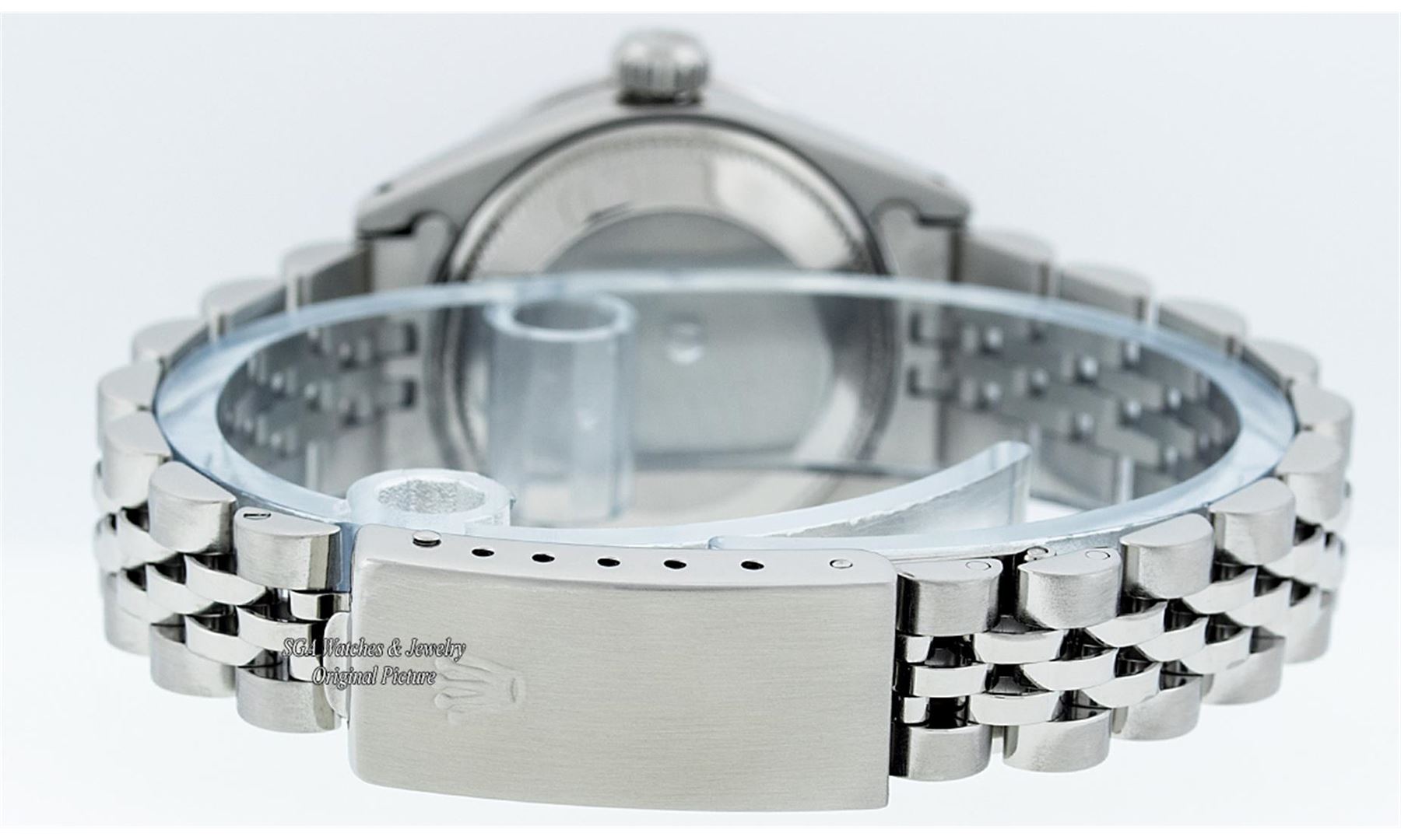 One Ladies Stainless Steel Rolex Datejust Polished Bright with Satin Finish, Serviced & Electronically Tested, Stainless Steel Case: 26mm, Stainless Steel Crown, Custom Bezel: New 18K White Sapphire Beadset Diamond Bezel, Diamond + Gem Count:� 28 Diamonds + 4 Sapphires. Total Weight .70 Carat, Clarity: SI-VS, Color: G to H. Custom Crystal: New Scratch Resistant Synthetic Sapphire Cyclops Lens. Custom Hands: New Luminescent Hands. Movement: Automatic Winding Movement Caliber 2030. Custom Dial: Blue Stamp With Single Cut Diamond Hour Markers, 10 Diamonds in Dial, G To H In Color, Clarity: SI-VS. Date Window: 3 O'Clock Position Date Display, Model: Datejust. Condition: G-6 Extra Fine. Bracelet: Stainless Steel Jubilee Band. Bright Polish & Satin Finish. 6.0 Inch Length, Adjustable. Standard Clasp, With Rolex Logo. This Watch Has Been Serviced Time Tested And Is In Excellent Condition It Is Free Of All Scratches And Dents.