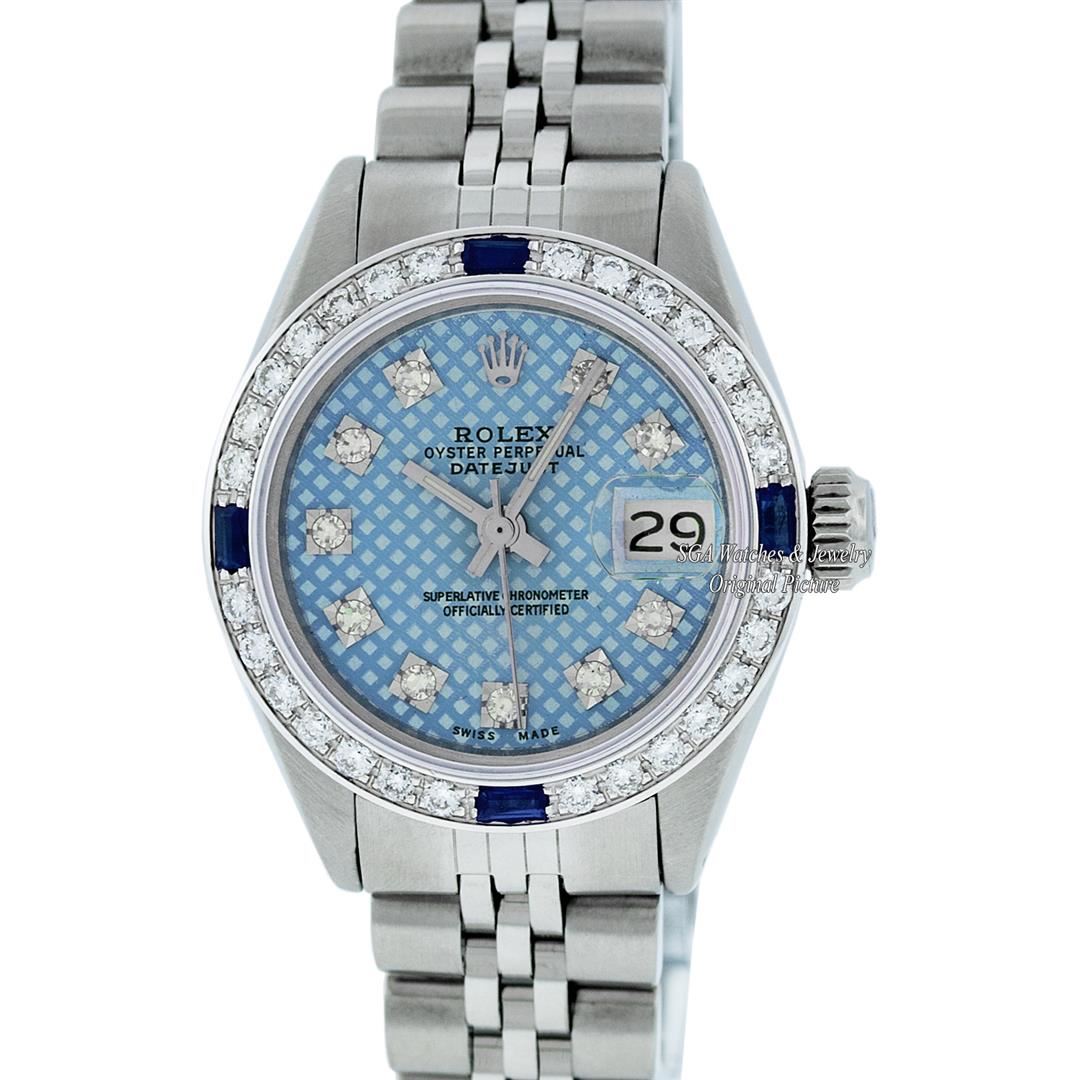 One Ladies Stainless Steel Rolex Datejust Polished Bright with Satin Finish, Serviced & Electronically Tested, Stainless Steel Case: 26mm, Stainless Steel Crown, Custom Bezel: New 18K White Sapphire Beadset Diamond Bezel, Diamond + Gem Count: 28 Diamonds + 4 Sapphires. Total Weight .70 Carat, Clarity: SI-VS, Color: G to H. Custom Crystal: New Scratch Resistant Synthetic Sapphire Cyclops Lens. Custom Hands: New Luminescent Hands. Movement: Automatic Winding Movement Caliber 2030. Custom Dial: Blue Stamp With Single Cut Diamond Hour Markers, 10 Diamonds in Dial, G To H In Color, Clarity: SI-VS. Date Window: 3 O'Clock Position Date Display, Model: Datejust. Condition: G-6 Extra Fine. Bracelet: Stainless Steel Jubilee Band. Bright Polish & Satin Finish. 6.0 Inch Length, Adjustable. Standard Clasp, With Rolex Logo. This Watch Has Been Serviced Time Tested And Is In Excellent Condition It Is Free Of All Scratches And Dents.