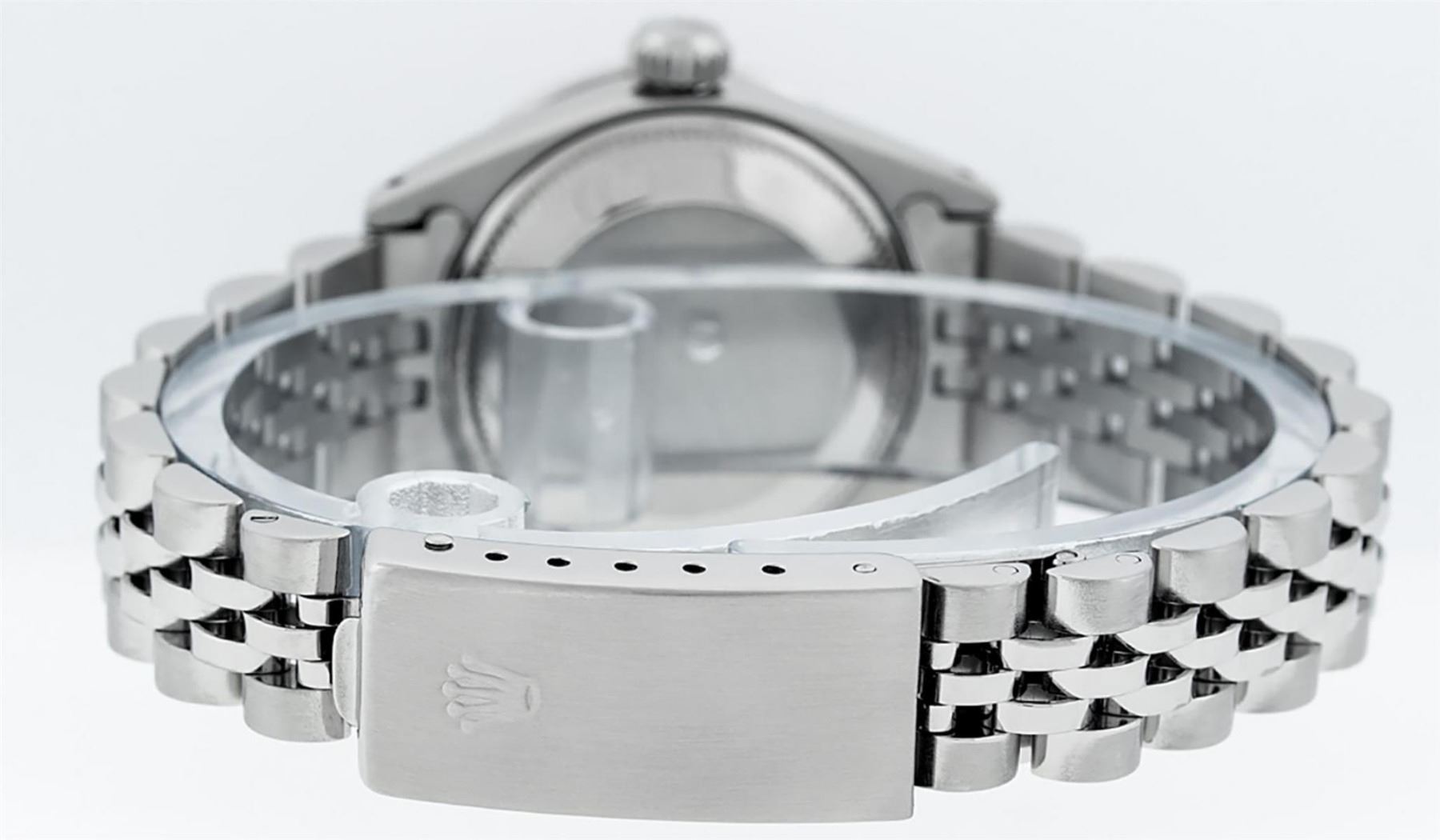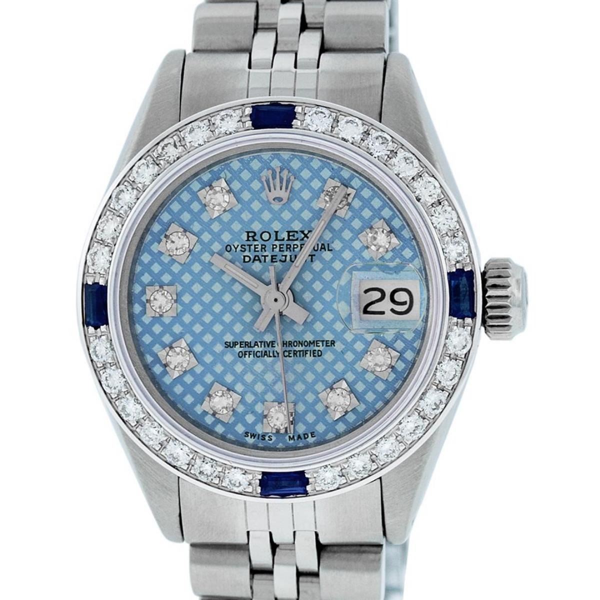 One Ladies Stainless Steel Rolex Datejust Polished Bright with Satin Finish, Serviced & Electronically Tested, Stainless Steel Case: 26mm, Stainless Steel Crown, Custom Bezel: New 18K White Sapphire Beadset Diamond Bezel, Diamond + Gem Count: 28 Diamonds + 4 Sapphires. Total Weight .70 Carat, Clarity: SI-VS, Color: G to H. Custom Crystal: New Scratch Resistant Synthetic Sapphire Cyclops Lens. Custom Hands: New Luminescent Hands. Movement: Automatic Winding Movement. Custom Dial: Blue Stamp With Single Cut Diamond Hour Markers, 10 Diamonds in Dial, G To H In Color, Clarity: SI-VS. Date Window: 3 O'Clock Position Date Display, Model: Datejust. Condition: G-6 Extra Fine. Bracelet: Stainless Steel Jubilee Band. Bright Polish & Satin Finish. 6.0 Inch Length, Adjustable. Standard Clasp, With Rolex Logo. This Watch Has Been Serviced Time Tested And Is In Excellent Condition It Is Free Of All Scratches And Dents.