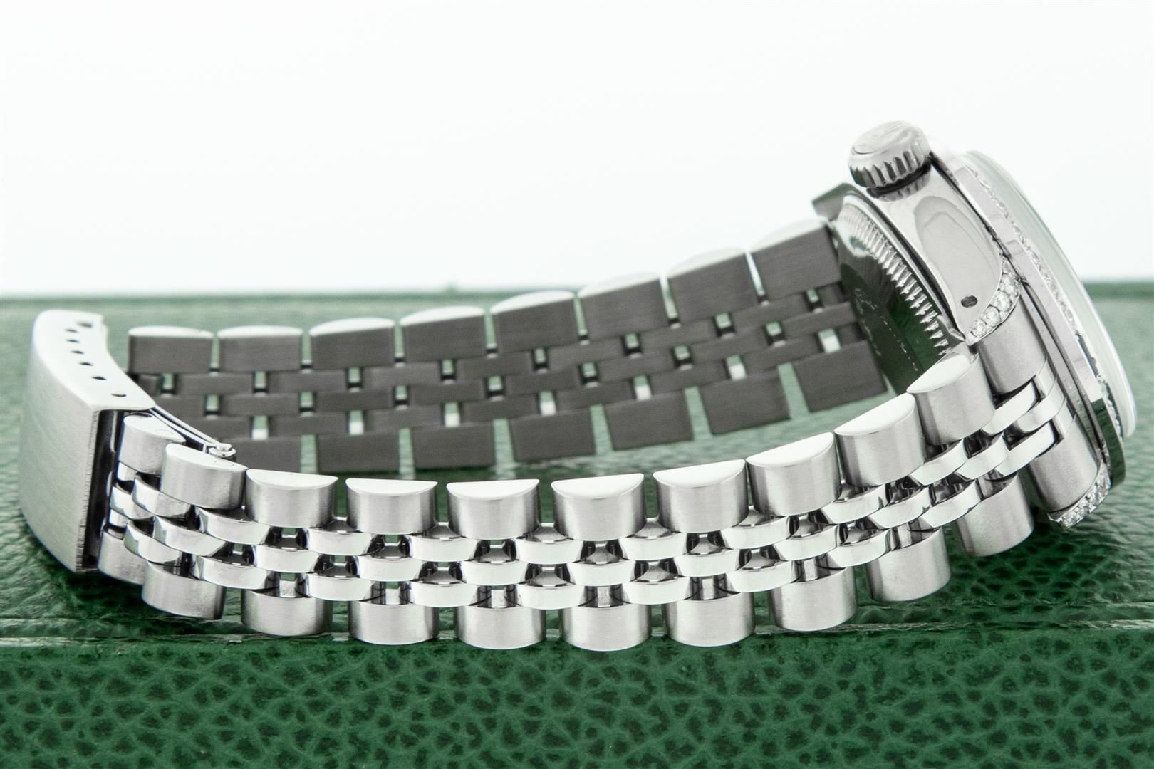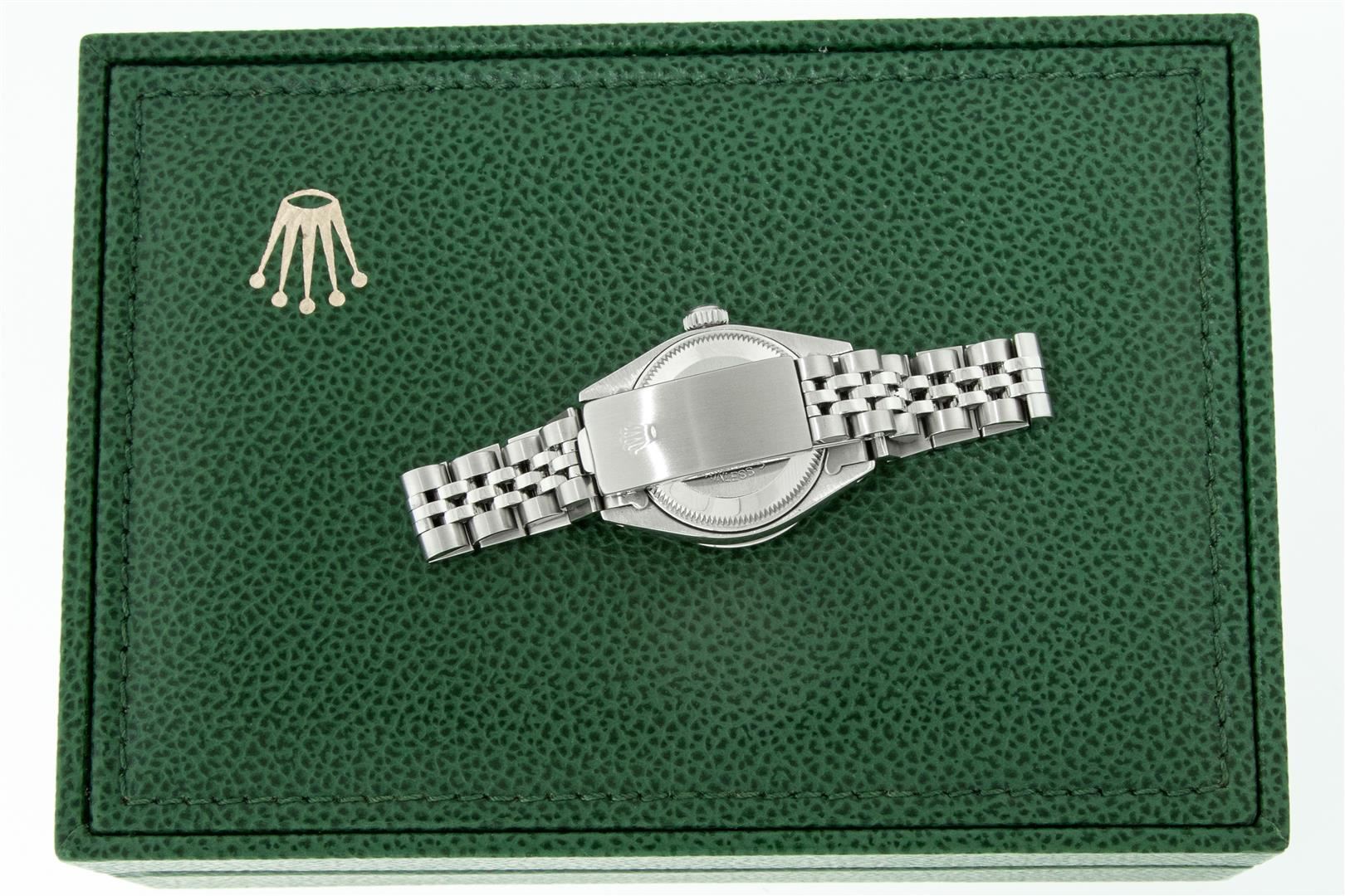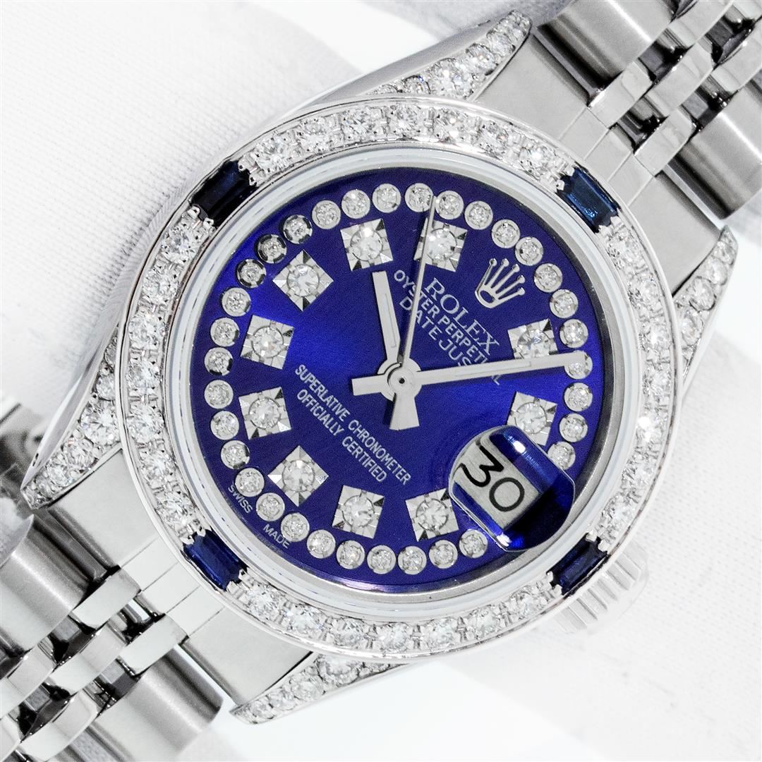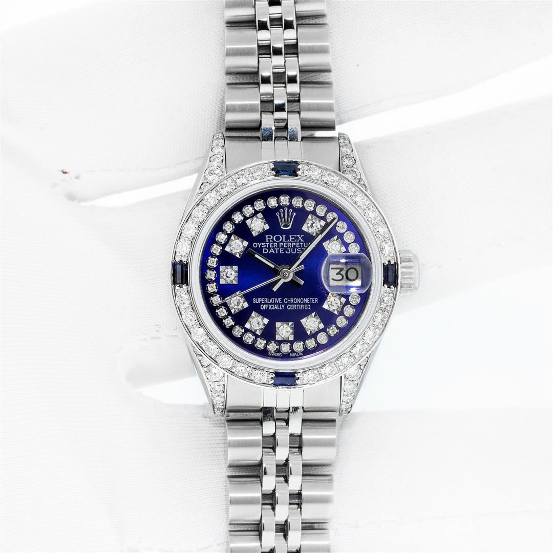 One Ladies Stainless Steel Rolex Datejust Polished Bright with Satin Finish, Serviced & Electronically Tested, Rolex Stainless Steel Case: 26mm, Rolex Stainless Steel Crown, Custom Diamond Lugs: 24 Diamonds On Lugs, Clarity: SI-VS, Color: G to H. Custom Bezel: New 18K White Gold Sapphire Beadset Bezel, Diamond Count: 28 Diamonds + 4 Sapphires, Total Weight .70 Carat, Clarity: SI-VS, Color: G to H. Custom Crystal: New Sapphire With Magnified Date Window. Custom Hands: New Luminescent Hands. Rolex Movement: Automatic Winding Movement. Custom Dial: Refinished To Blue With Custom Added Diamonds, 43 Diamonds in Dial G To H In Color, Clarity: VS. Date Window: 3 O'Clock Position Date Display, Model: Datejust Condition: G-6 Extra Fine. Rolex Bracelet: Stainless Steel Jubilee Band. Bright Polish & Satin Finish. 6.0 Inch Length, Adjustable. Standard Clasp, With Rolex Logo. This Pre Owned Watch Has Been Serviced Time Tested And Is In Excellent Condition It Is Free Of All Scratches And Dents. This Watch Comes With A Rolex Box.