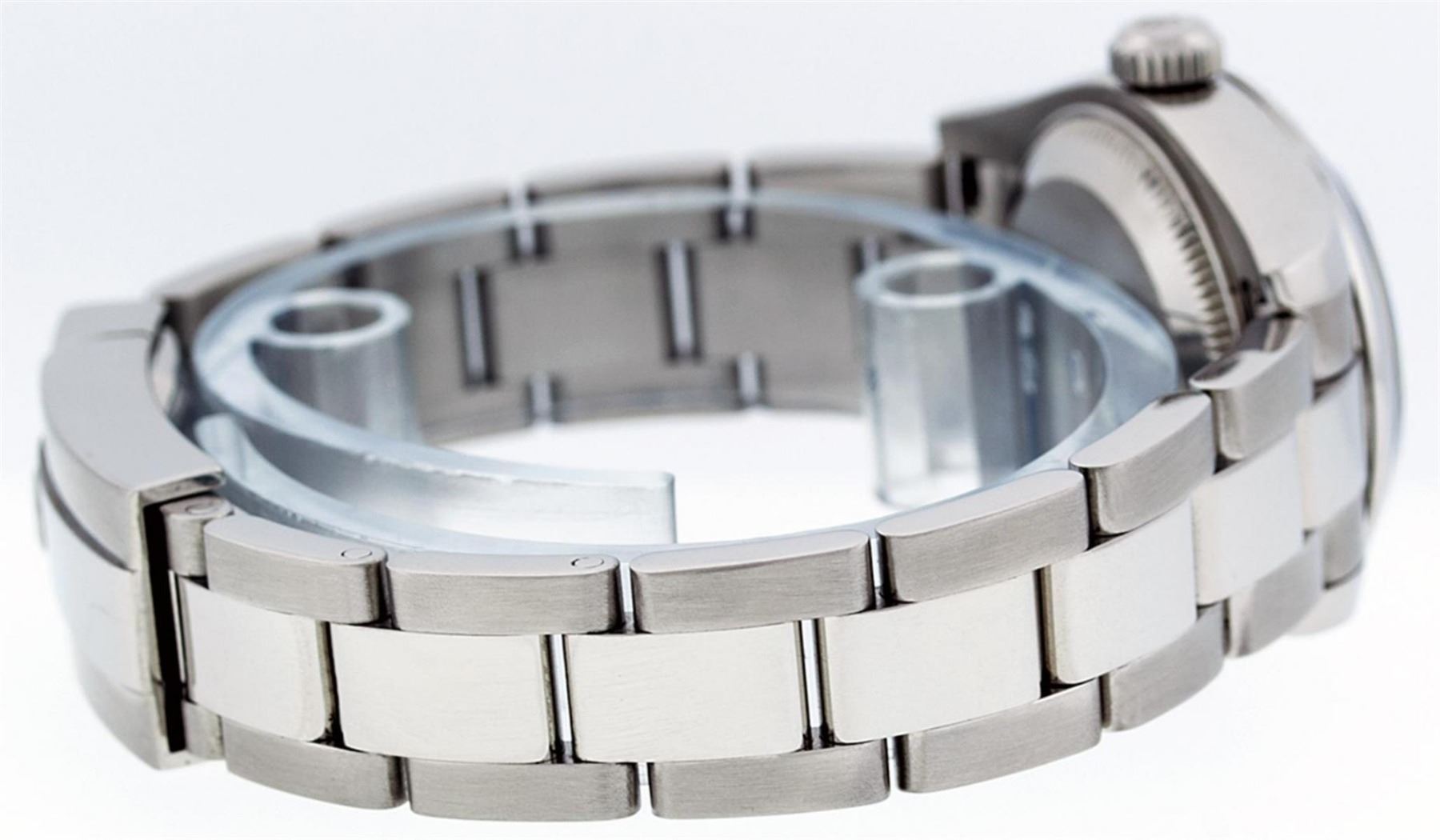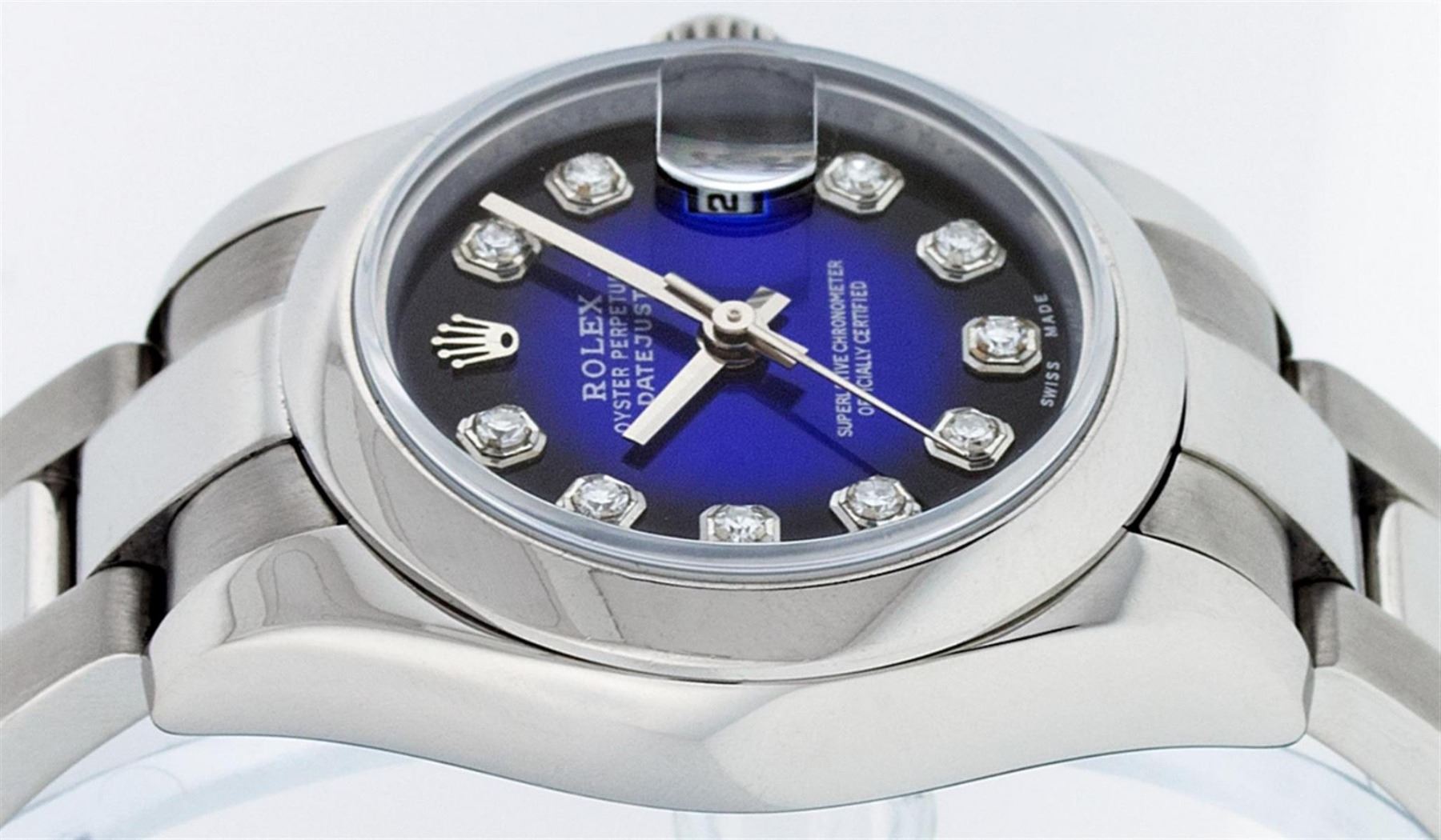 One Ladies Quickset Stainless Steel Rolex Datejust Polished Bright with Satin Finish, Serviced & Electronically Tested, Stainless Steel Case: 26mm, Stainless Steel Crown, Bezel: Stainless Steel Smooth Bezel. Custom Crystal: New Scratch Resistant Sapphire Cyclops Lens. Custom Hands: New Luminescent Hands. Movement: Automatic Winding Movement Caliber 2235. Custom Dial: Blue Vignette Single Cut VS Diamond Dial, Diamond Count: 10 Single Cut Diamonds In Dial, Color: G to H, Clarity: VS. Date Window: 3 O'Clock Position Date Display, Model: 179160 Quickset Datejust. Condition: G-6 Extra Fine. Bracelet: Stainless Steel Oyster Band. Bright Polish & Satin Finish. 6.0 Inch Length, Adjustable. Standard Clasp, With Rolex Logo. This Watch Has Been Serviced Time Tested And Is In Excellent Condition It Is Free Of All Scratches And Dents. This Watch Comes With A Rolex Box.