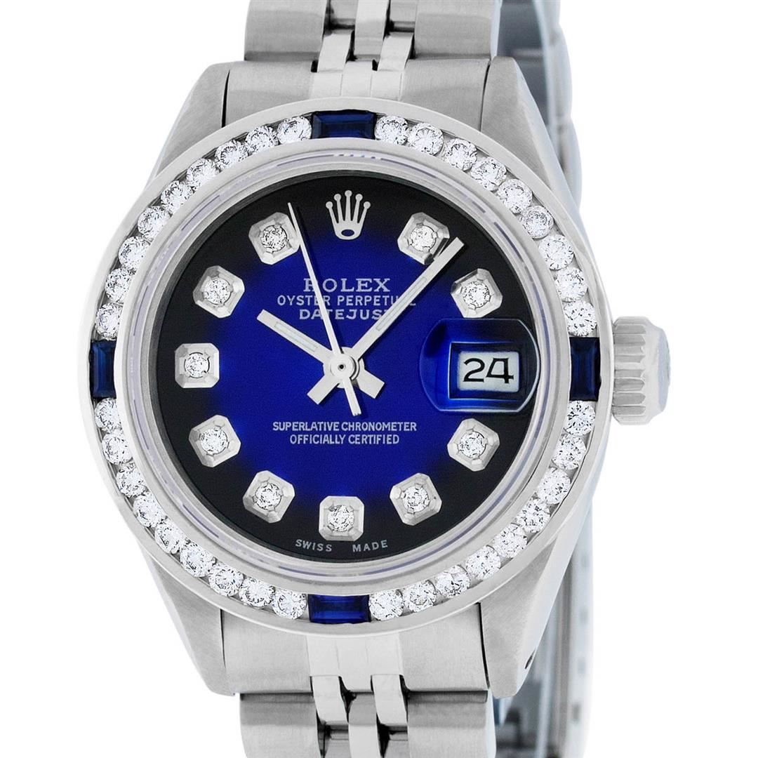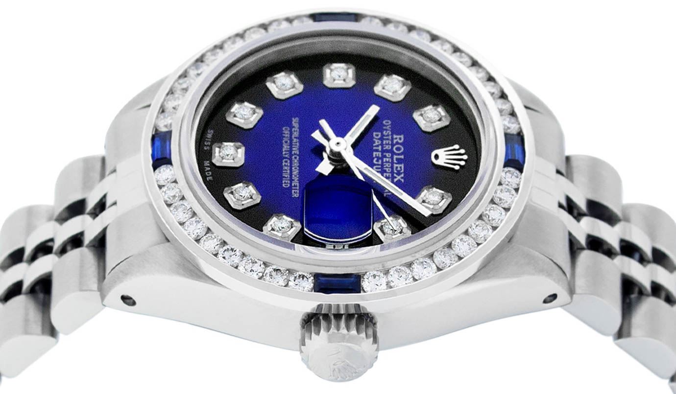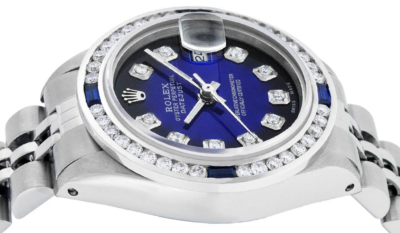 One Ladies Stainless Steel Rolex Datejust Polished Bright with Satin Finish, Serviced & Electronically Tested, Stainless Steel Case: 26mm, Stainless Steel Crown, Custom Bezel: New 18K White Gold Sapphire Channel Set Diamond Bezel, Diamond + Gem Count: 36 Diamonds + 4 Sapphires Total Weight 1.00 Carat, Clarity: SI-VS, Color: G to H. Custom Crystal: New Synthetic Sapphire Cyclops Lens. Custom Hands: New Luminescent Hands. Movement: Automatic Winding Movement Caliber 2030. Custom Dial: Refinished Blue Vignette With Diamond Hour Markers. Date Window: 3 O'Clock Position Date Display, Model: Datejust. Condition: G-6 Extra Fine. Bracelet: Stainless Steel Jubilee. Bright Polish & Satin Finish. 6.0 Inch Length, Adjustable. Standard Clasp, With Rolex Logo. This Watch Has Been Serviced Time Tested And Is In Excellent Condition It Is Free Of All Scratches And Dents.