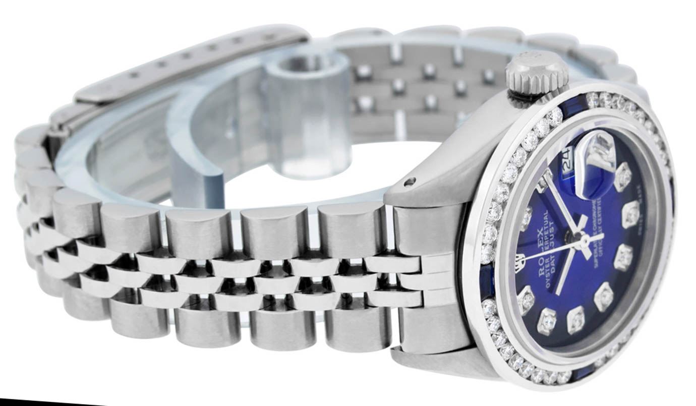 One Ladies Stainless Steel Rolex Datejust Polished Bright with Satin Finish, Serviced & Electronically Tested, Stainless Steel Case: 26mm, Stainless Steel Crown, Custom Bezel: New 18K White Gold Sapphire Channel Set Diamond Bezel, Diamond + Gem Count: 36 Diamonds + 4 Sapphires Total Weight 1.00 Carat, Clarity: SI-VS, Color: G to H. Custom Crystal: New Synthetic Sapphire Cyclops Lens. Custom Hands: New Luminescent Hands. Movement: Automatic Winding Movement. Custom Dial: Refinished Blue Vignette With Diamond Hour Markers. Date Window: 3 O'Clock Position Date Display, Model: Datejust. Condition: G-6 Extra Fine. Bracelet: Stainless Steel Jubilee. Bright Polish & Satin Finish. 6.0 Inch Length, Adjustable. Standard Clasp, With Rolex Logo. This Watch Has Been Serviced Time Tested And Is In Excellent Condition It Is Free Of All Scratches And Dents.