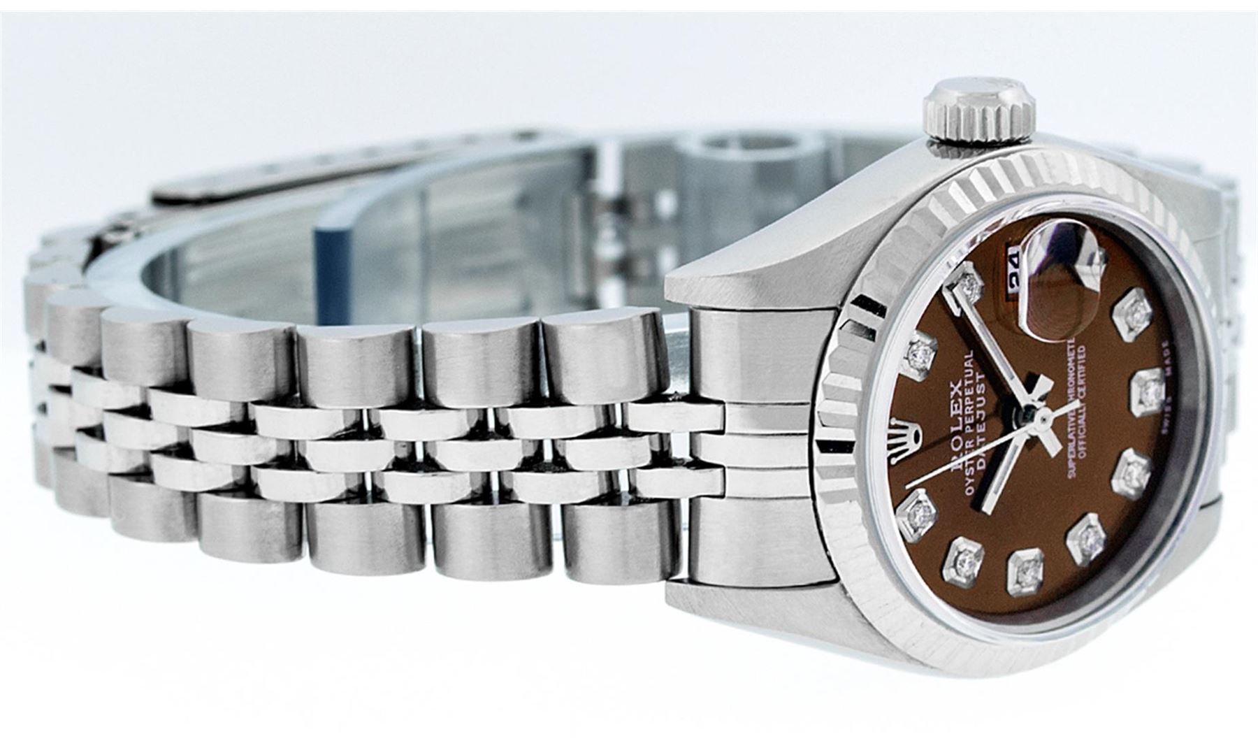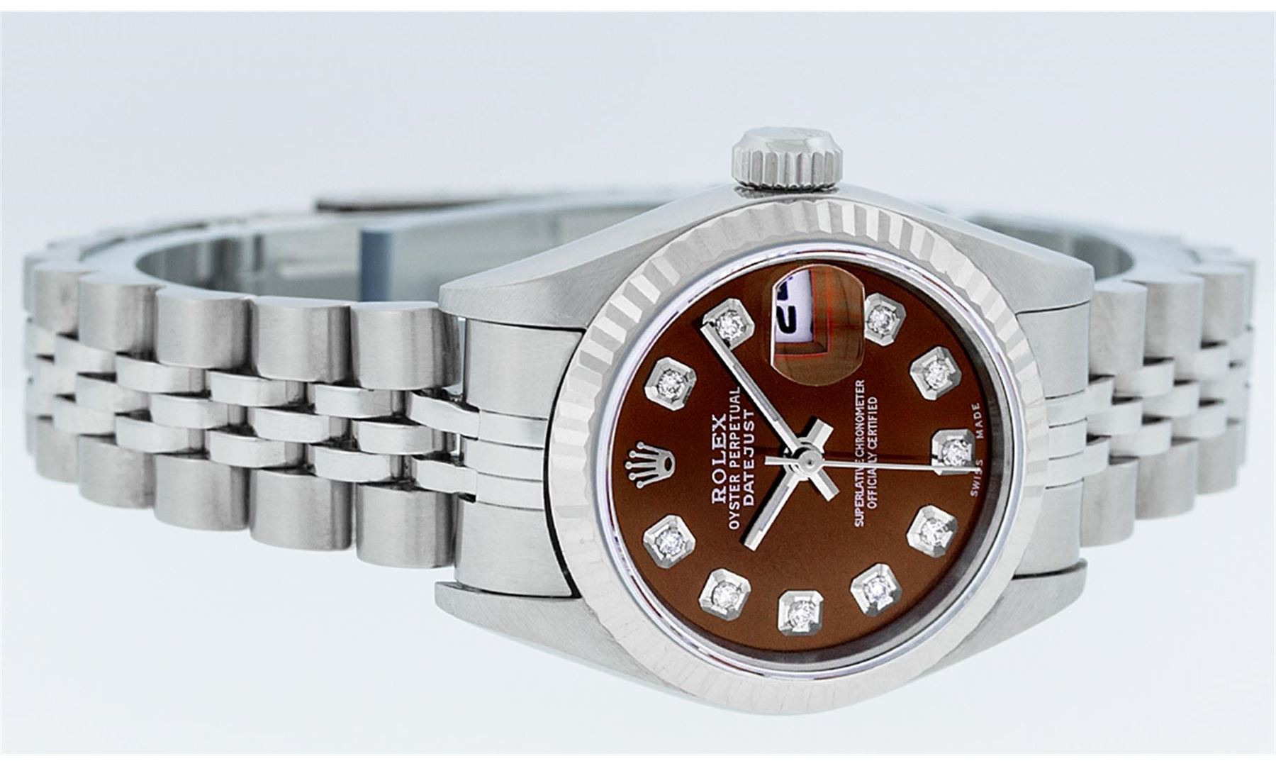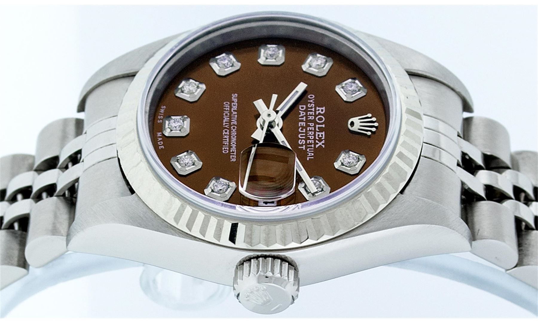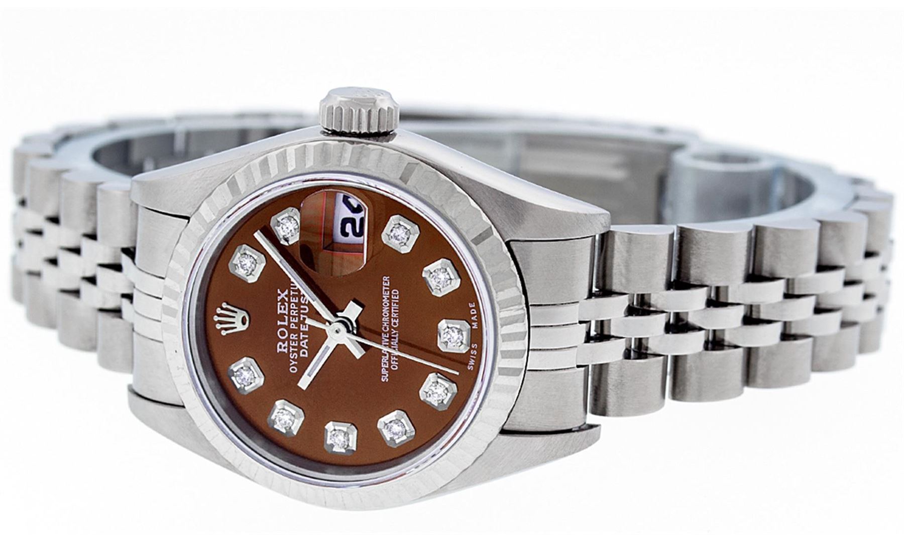 One Ladies Quickset Stainless Steel Rolex Datejust Polished Bright with Satin Finish, Serviced & Electronically Tested, Stainless Steel Case: 26mm, Stainless Steel Crown, Bezel: 18K White Gold Fluted Bezel. Custom Crystal: New Scratch Resistant Sapphire Cyclops Lens. Custom Hands: New Luminescent Hands. Movement: Automatic Winding Movement Caliber 2235. Custom Dial: Brown Diamond Dial, Diamond Count: 10 Diamonds In Dial, Color: G to H, Clarity: SI1 Date Window: 3 O'Clock Position Date Display, Model: 79174 Quickset Datejust. Condition: G-6 Extra Fine. Bracelet: Stainless Steel Jubilee Band. Bright Polish & Satin Finish. 6.0 Inch Length, Adjustable. Standard Clasp, With Rolex Logo. This Watch Has Been Serviced Time Tested And Is In Excellent Condition It Is Free Of All Scratches And Dents.