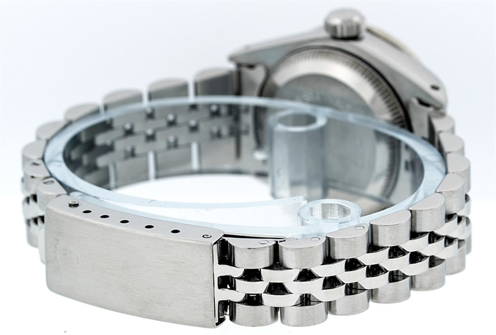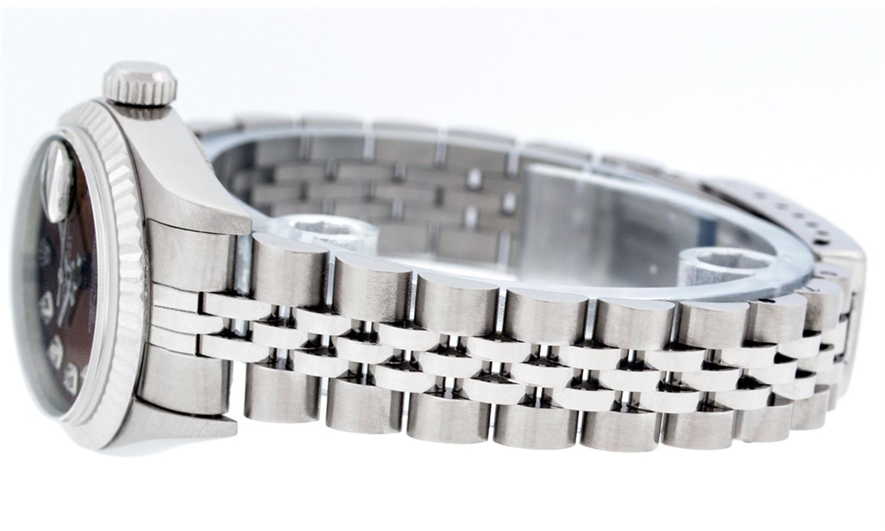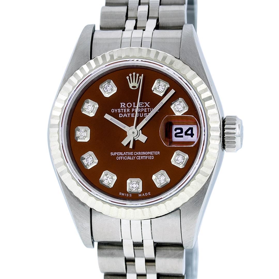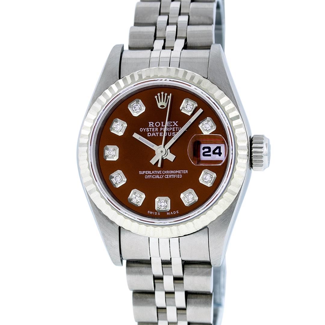 One Ladies Quickset Stainless Steel Rolex Datejust Polished Bright with Satin Finish, Serviced & Electronically Tested, Stainless Steel Case: 26mm, Stainless Steel Crown, Bezel: 18K White Gold Fluted Bezel. Custom Crystal: New Scratch Resistant Sapphire Cyclops Lens. Custom Hands: New Luminescent Hands. Movement: Automatic Winding Movement Caliber 2235. Custom Dial: Brown Diamond Dial, Diamond Count: 10 Diamonds In Dial, Color: G to H, Clarity: SI1 Date Window: 3 O'Clock Position Date Display, Model: 79174 Quickset Datejust. Condition: G-6 Extra Fine. Bracelet: Stainless Steel Jubilee Band. Bright Polish & Satin Finish. 6.0 Inch Length, Adjustable. Standard Clasp, With Rolex Logo. This Watch Has Been Serviced Time Tested And Is In Excellent Condition It Is Free Of All Scratches And Dents.