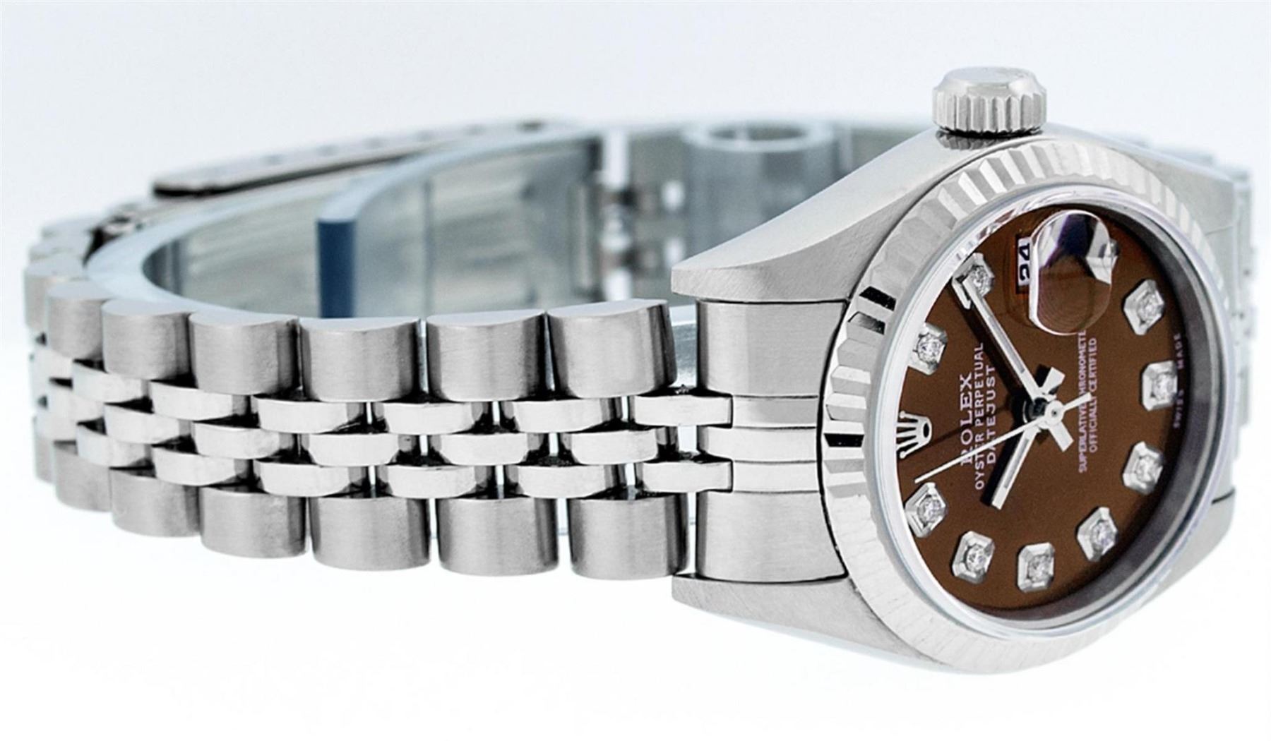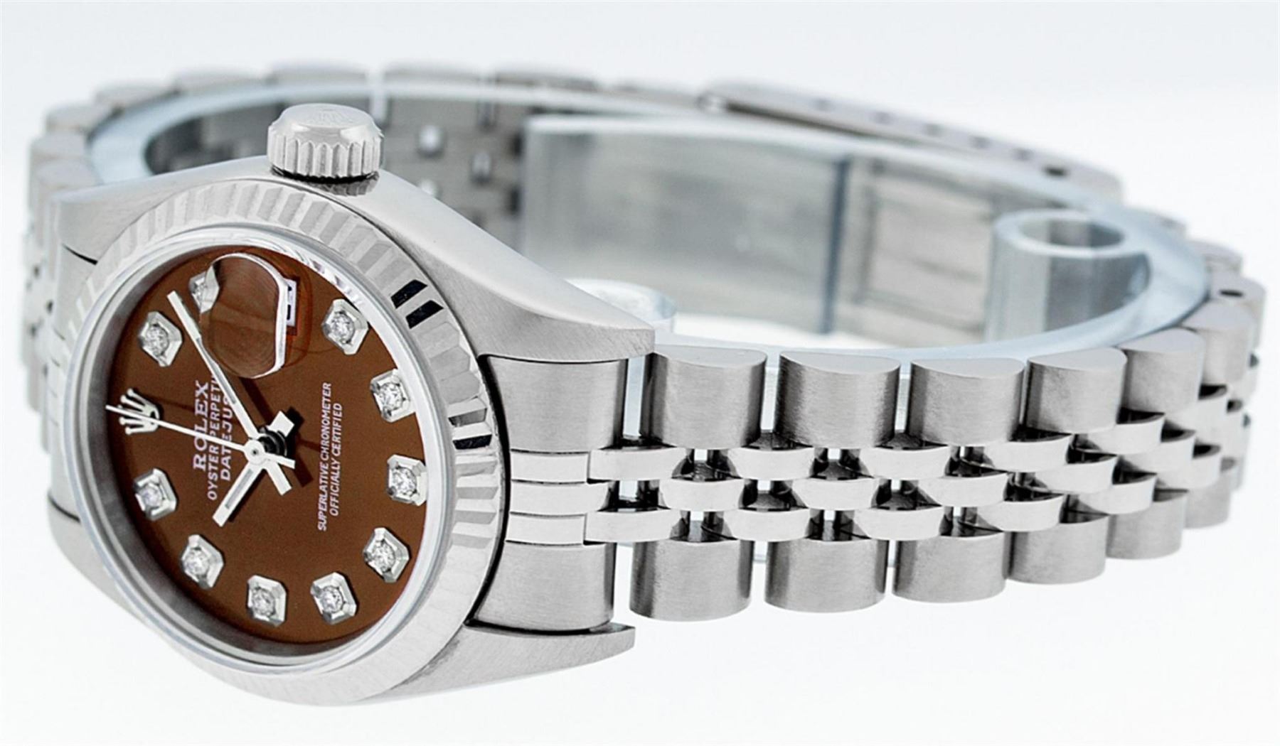 One Ladies Quickset Stainless Steel Rolex Datejust Polished Bright with Satin Finish, Serviced & Electronically Tested, Stainless Steel Case: 26mm, Stainless Steel Crown, Bezel: 18K White Gold Fluted Bezel. Custom Crystal: New Scratch Resistant Sapphire Cyclops Lens. Custom Hands: New Luminescent Hands. Movement: Automatic Winding Movement Caliber 2235. Custom Dial: Brown Diamond Dial, Diamond Count: 10 Diamonds In Dial, Color: G to H, Clarity: SI1 Date Window: 3 O'Clock Position Date Display, Model: 79174 Quickset Datejust. Condition: G-6 Extra Fine. Bracelet: Stainless Steel Jubilee Band. Bright Polish & Satin Finish. 6.0 Inch Length, Adjustable. Standard Clasp, With Rolex Logo. This Watch Has Been Serviced Time Tested And Is In Excellent Condition It Is Free Of All Scratches And Dents.
