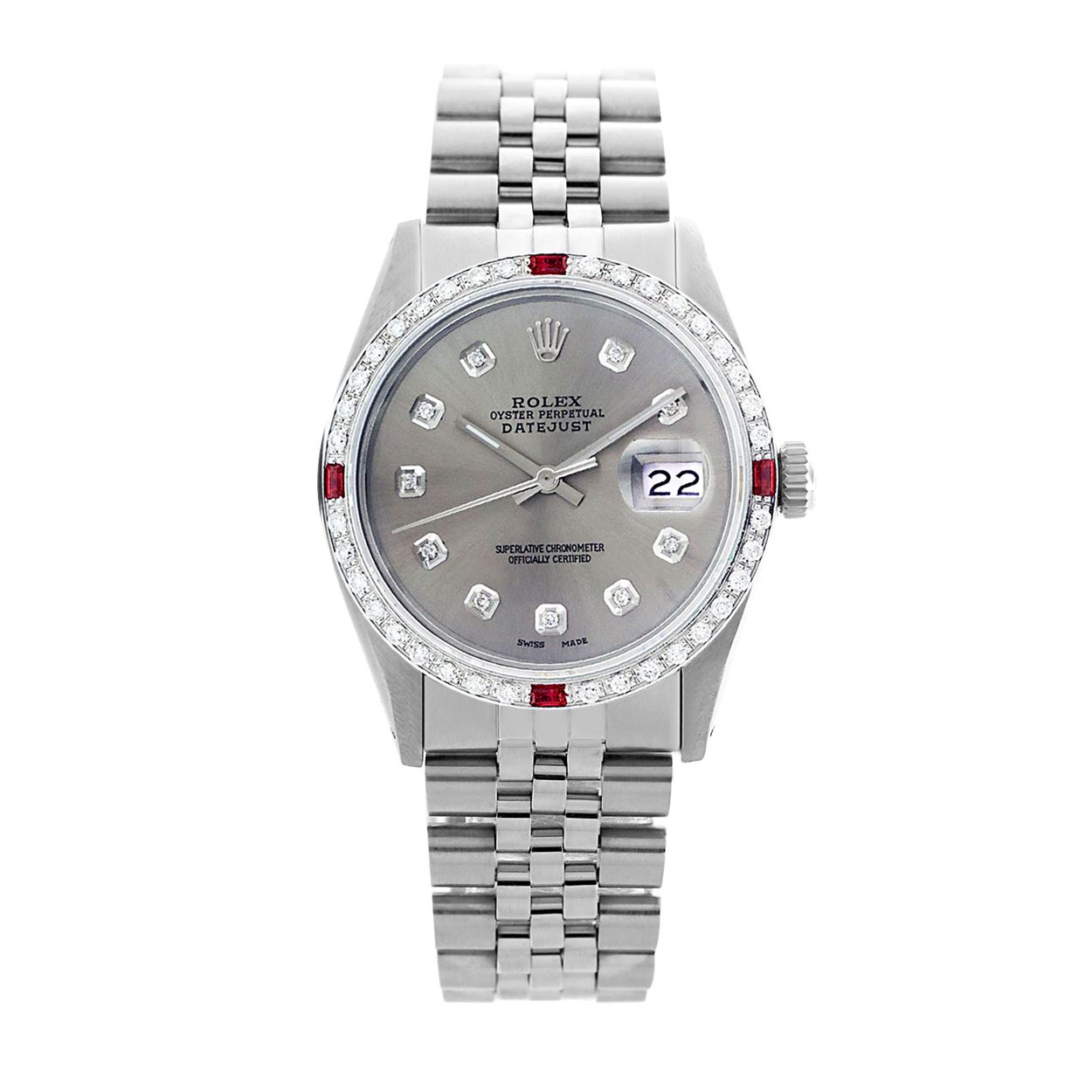 WATCH DETAILS: ITEM: WatchBRAND: RolexTYPE: Stainless SteelFEATURE: MODEL: DateJustMADE: Swiss MadeGENDER: LadiesCONDITION: Pre-OwnedFUNCTION: DateDIAL COLOR: GreyHOUR MARKERS: 10 Round Custom Made DiamondBEZEL TYPE: Custom Made Diamond & Ruby BezelBEZEL STONE: Diamond 1 CTW G-VVS1 & 4 Burmise RubyBEZEL MATERIAL: 18K GoldBRACELET TYPE: Jubilee BRACELET MATERIAL: Stainless SteelCLASP TYPE: Folding ClaspCLASP MATERIAL: Stainless SteelCASE STONE: CASE SIZE: 26mmCRYSTAL: Scratch Resistance Sapphire CrystalMOVEMENT: Automatic (Self Winding)CALIBER: 2030CROWN TYPE: Screw Down CrownWATER RESISTANCE: Waterproof to 10 ATM/100 meters/330 feetMODEL #: 6917SKU #: ALSJNS26We Buy/Sell/Trade Valuable watches, Please call us